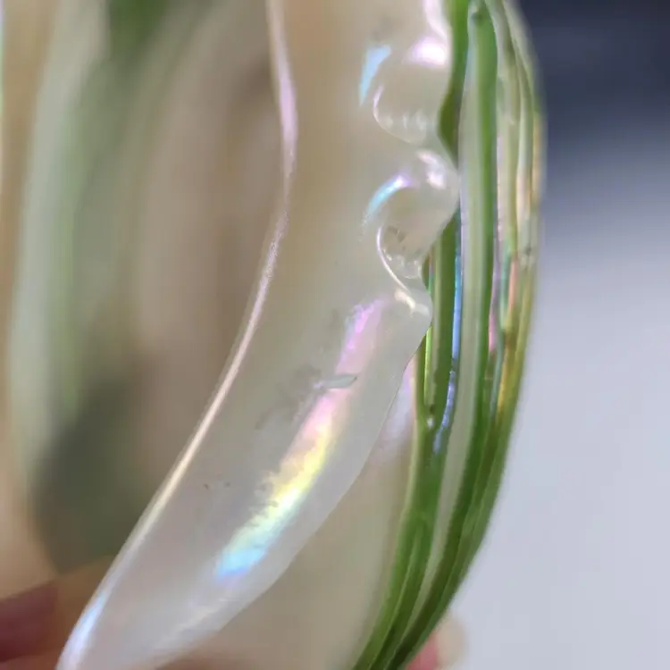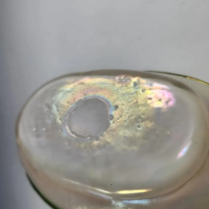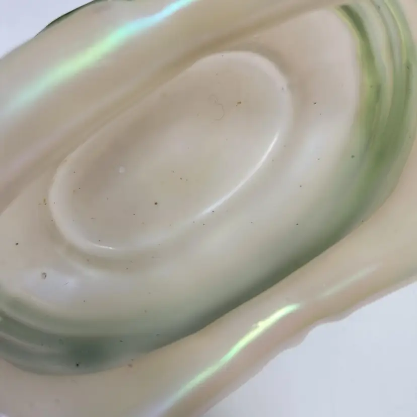 Condition: Excellent vintage condition. There is a small scratch in the iridescent finish on the rim (see last photo.) There are some areas of mild discoloration and black inclusions typical of the handmade process.