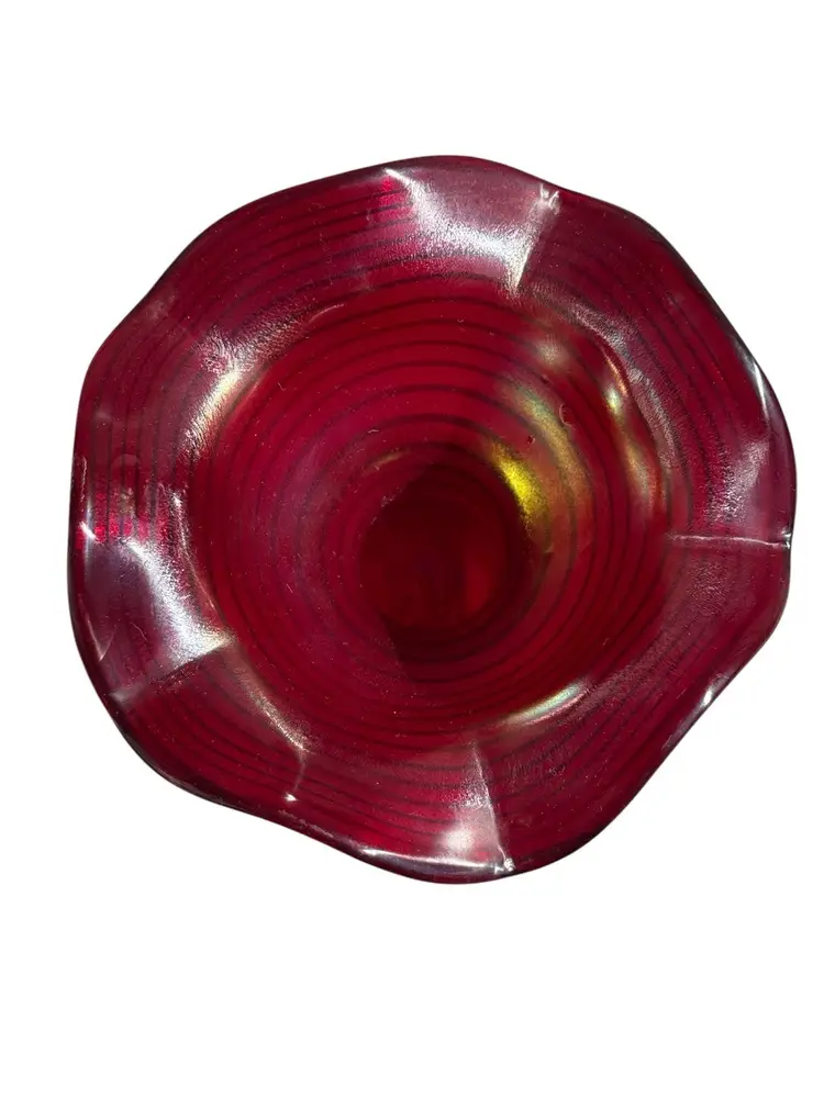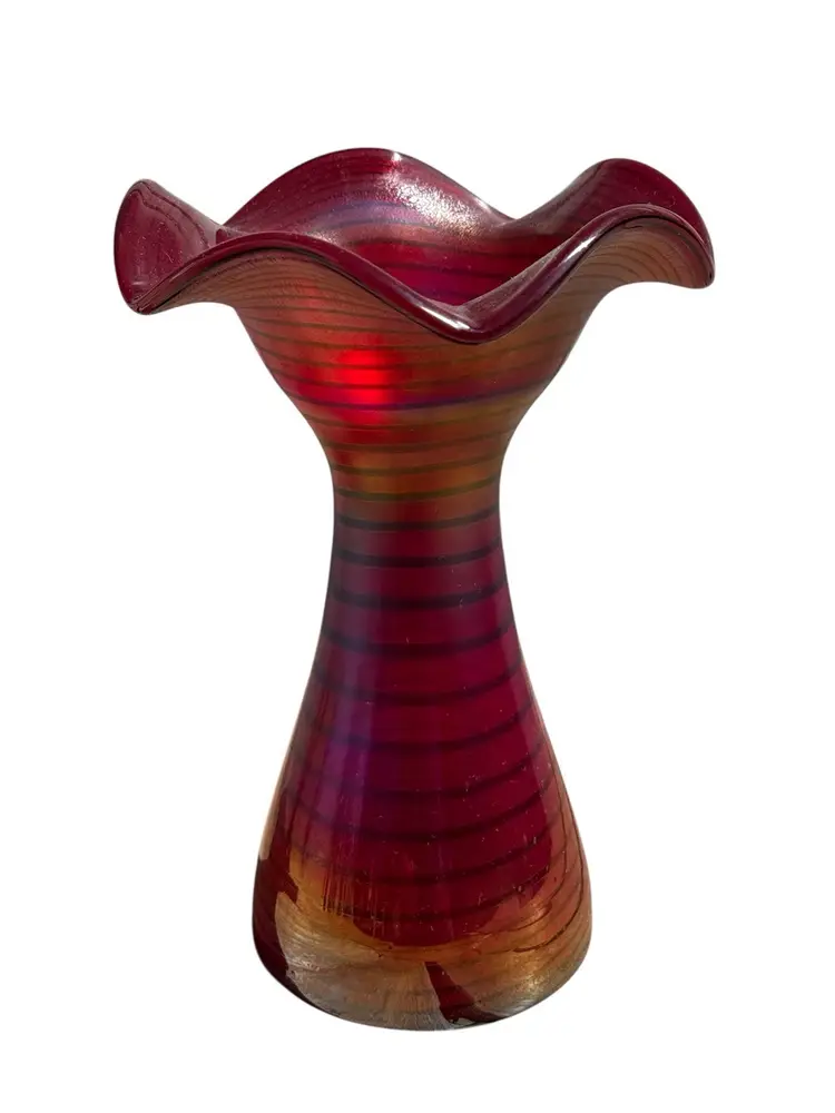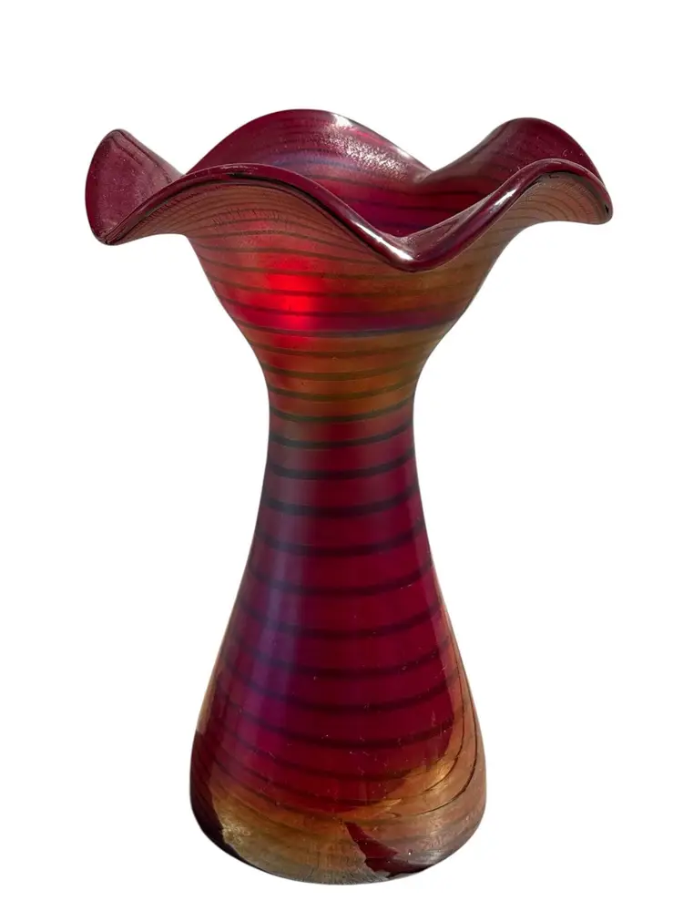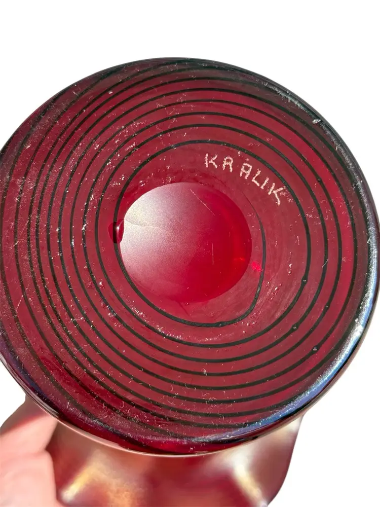 Measures 8.5” tall, 6” diameter at mouth No chips or cracks, but has inclusions to the glass, which is part of the making process see photos Signed Kralik