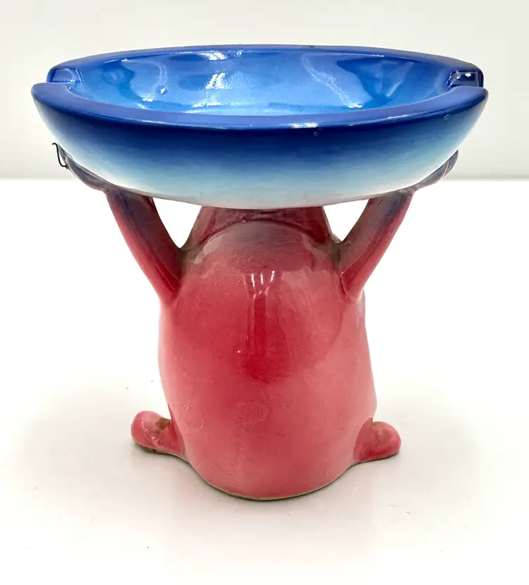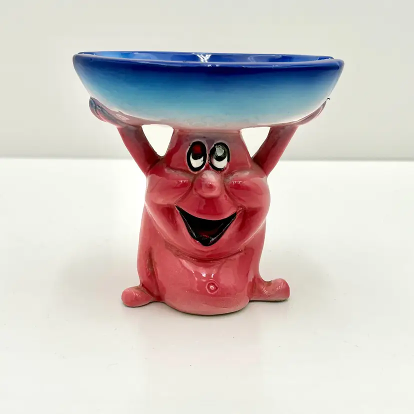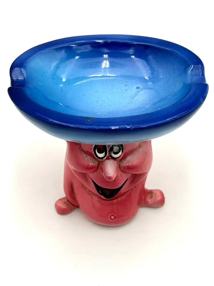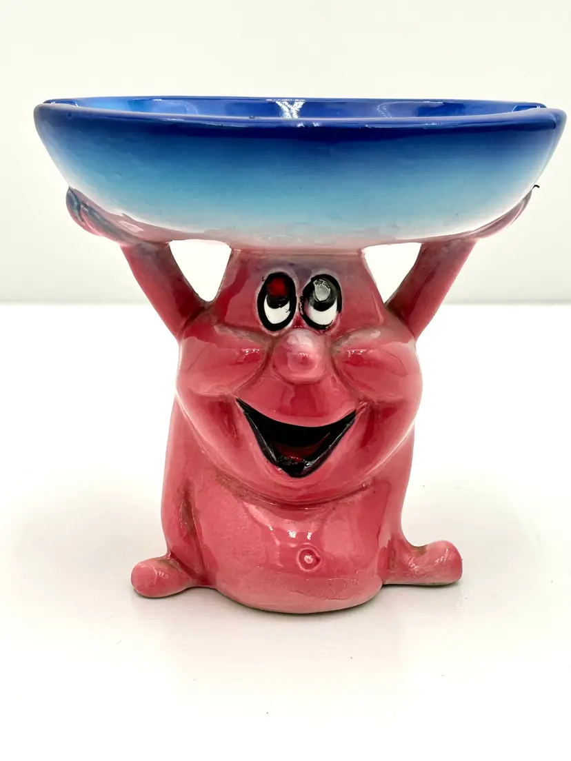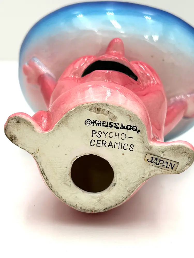 These things are so bizarre in such a fun way that we really wanted to add them to the shop. This guy is part of the Kreiss & Co Psycho Ceramics line and would have been used as an ashtray. He is just a chubby pink blob of a guy, holding up the blue ashtray above his head. Belly button hanging out and all. He is marked on the bottom with a Kreiss & Co stamp along with an original Japan sticker. It is about 4 ¼ inches tall and 4 inches wide. There are some condition issues with this guy that hopefully are easily repaired. First being his missing rhinestone eye and the other is a metal piece that sticks out under his arm. We thought maybe he used to hold a sign, but aren’t sure. There are no chips or cracks.