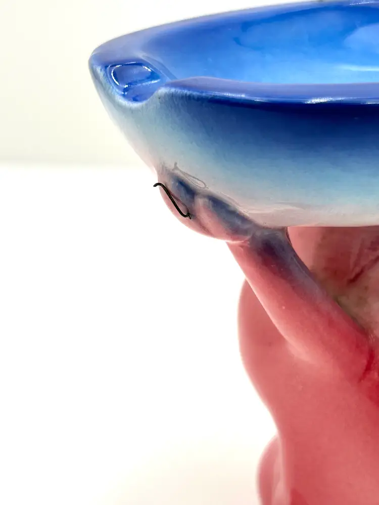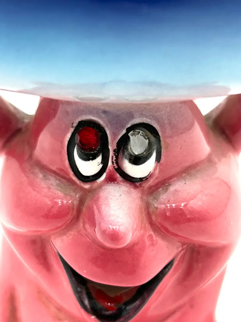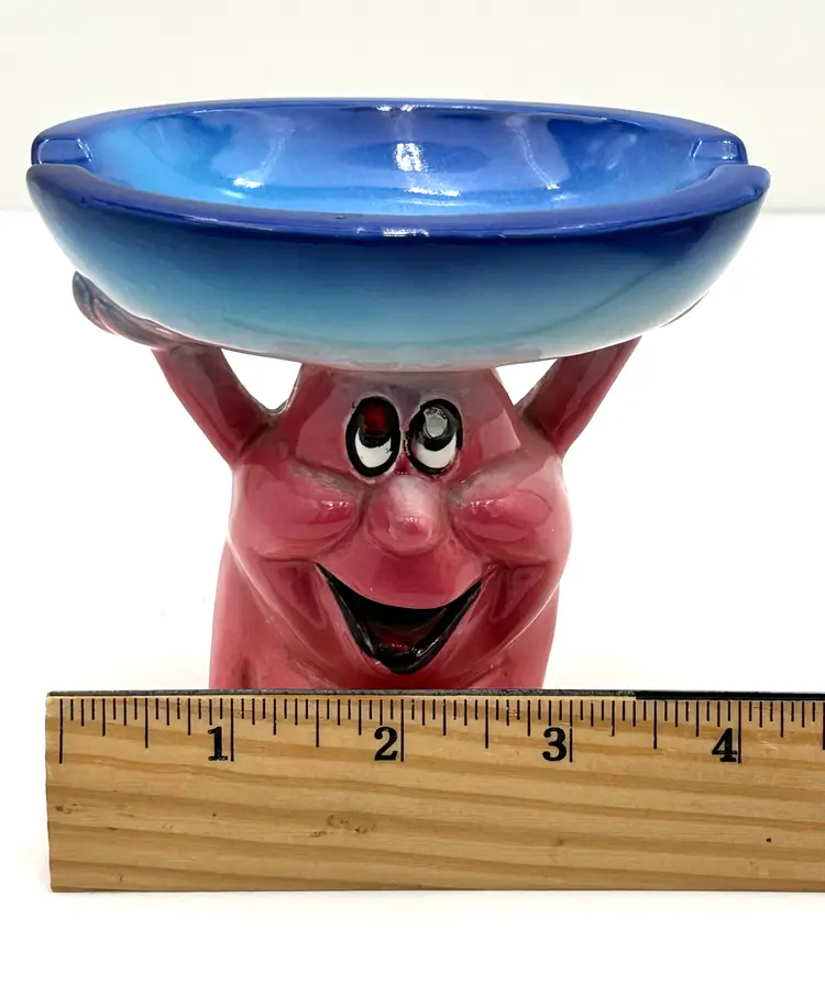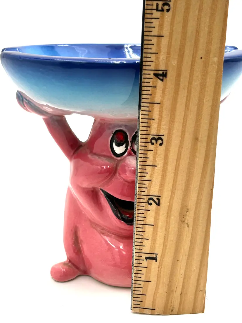 These things are so bizarre in such a fun way that we really wanted to add them to the shop. This guy is part of the Kreiss & Co Psycho Ceramics line and would have been used as an ashtray. He is just a chubby pink blob of a guy, holding up the blue ashtray above his head. Belly button hanging out and all. He is marked on the bottom with a Kreiss & Co stamp along with an original Japan sticker. It is about 4 ¼ inches tall and 4 inches wide. There are some condition issues with this guy that hopefully are easily repaired. First being his missing rhinestone eye and the other is a metal piece that sticks out under his arm. We thought maybe he used to hold a sign, but aren’t sure. There are no chips or cracks.