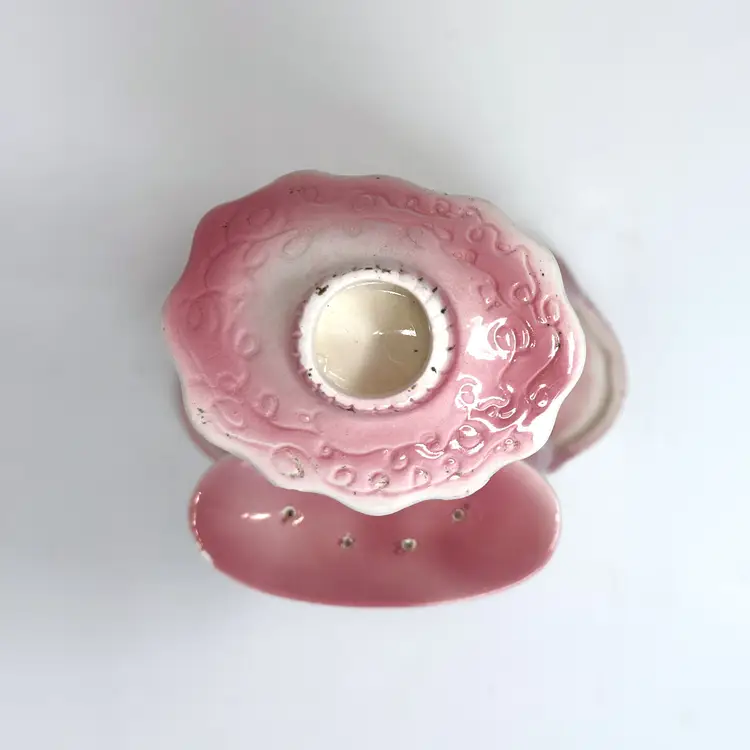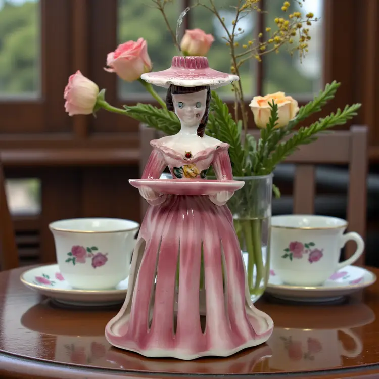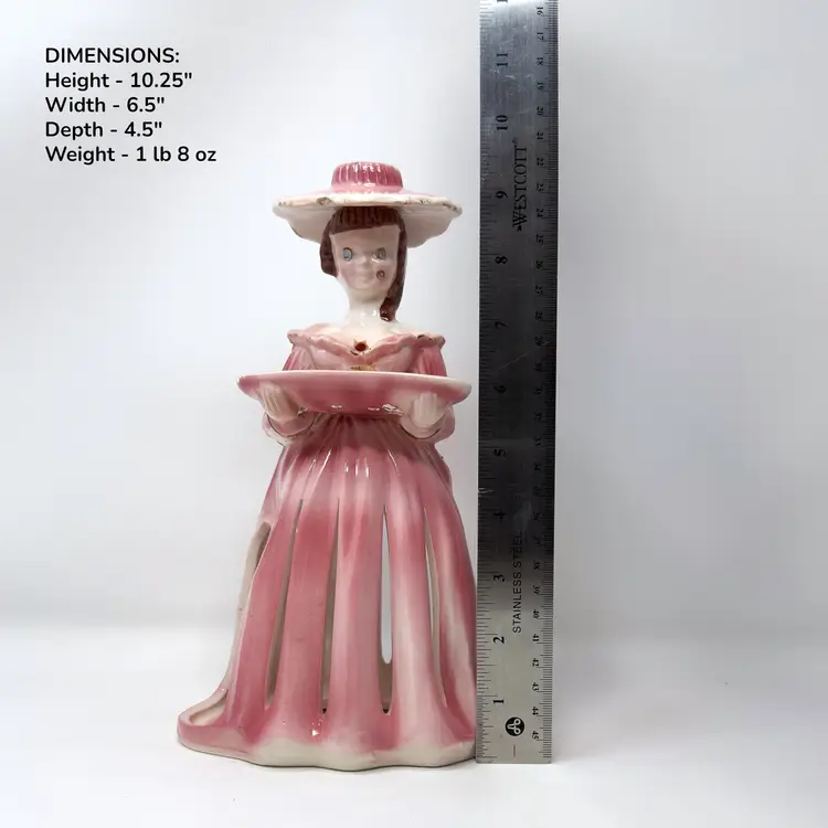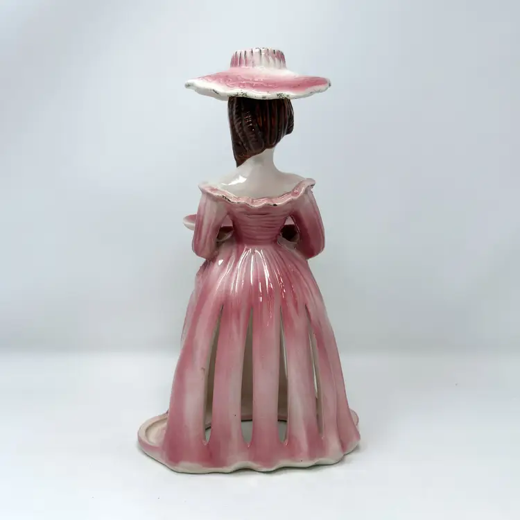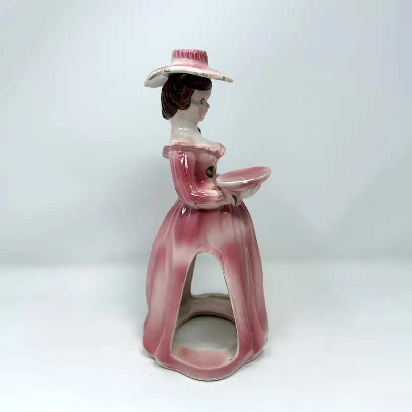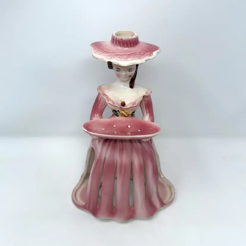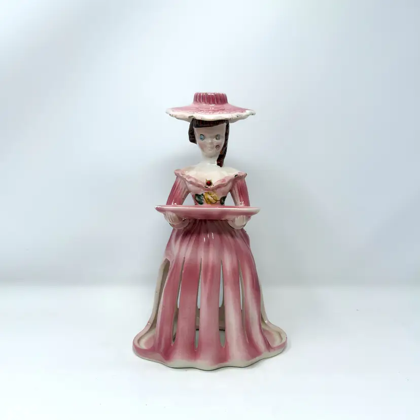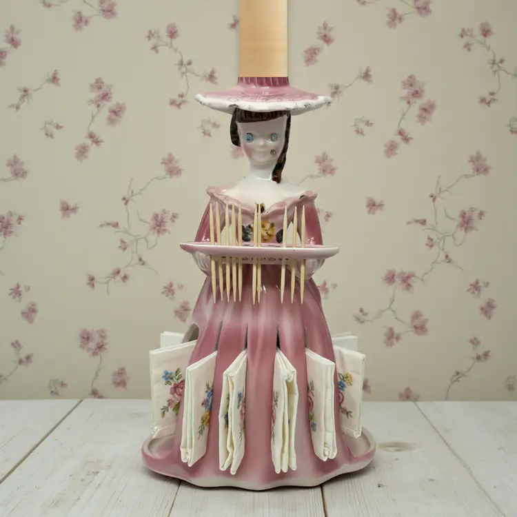 This 1950s pink ceramic lady candleholder by Kreiss & Company (Japan) features integrated napkin skirt slots, a small tray for toothpicks, and a taper candle holder atop her hat. Measuring 10.25″ tall in glazed porcelain, this multifunctional piece combines decorative charm with tabletop utility.
