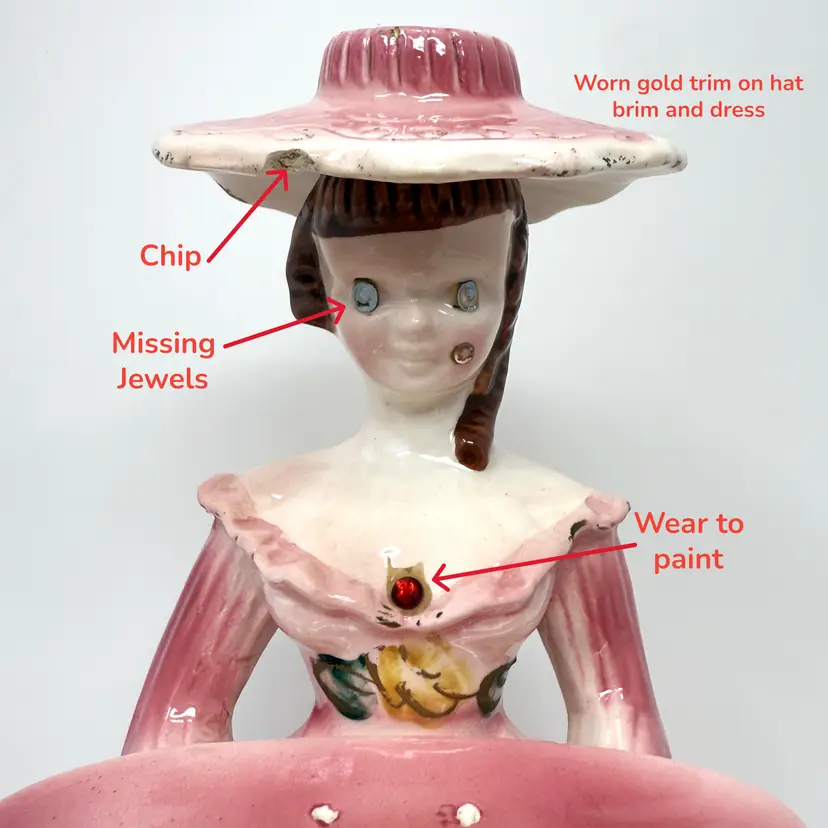 Condition Notes: Moderate wear consistent with age including a small chip on the hat brim and a minor chip on the tray rim, worn gold trim, and missing rhinestone accents (originally on the eyes and cheek). These age‑related signs of wear reflect the piece’s history and collectible appeal.