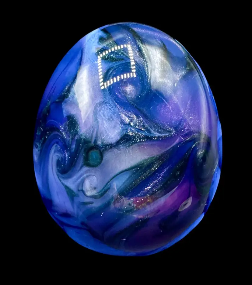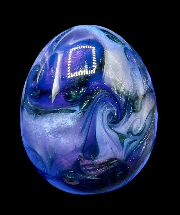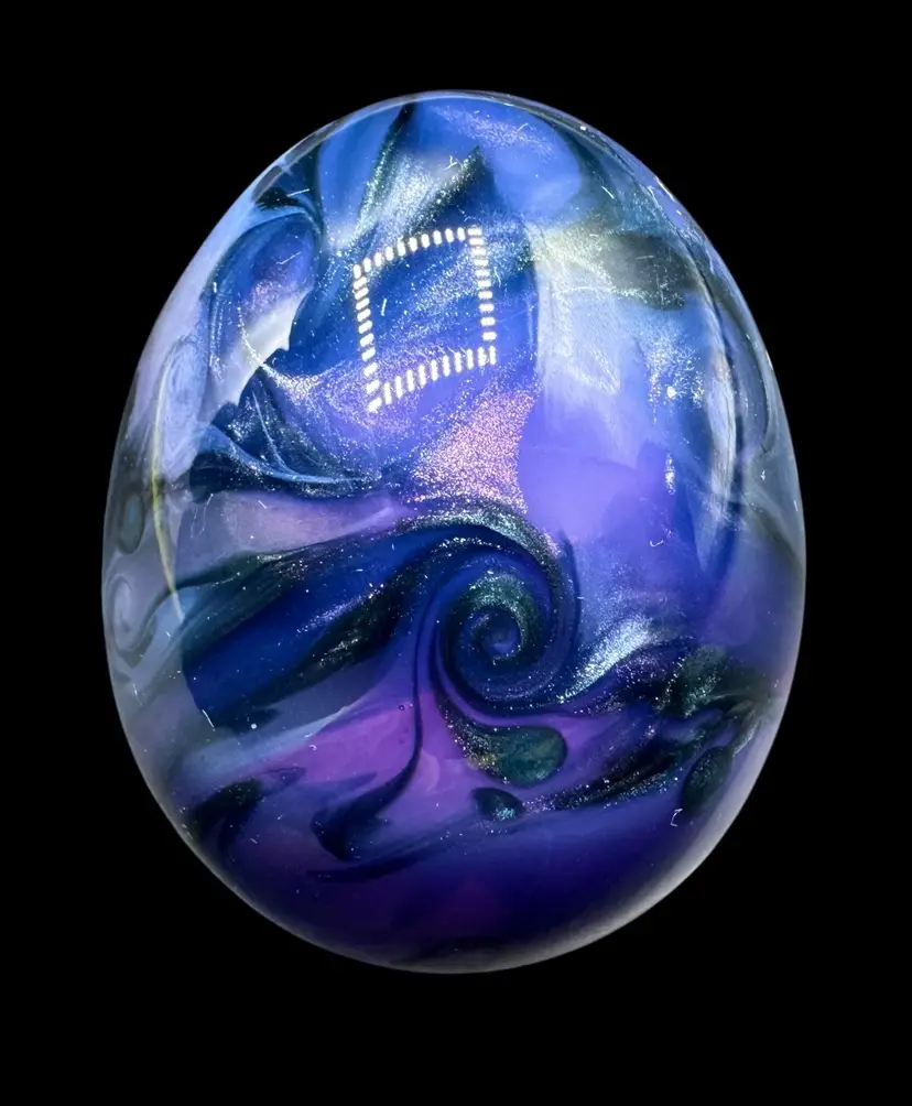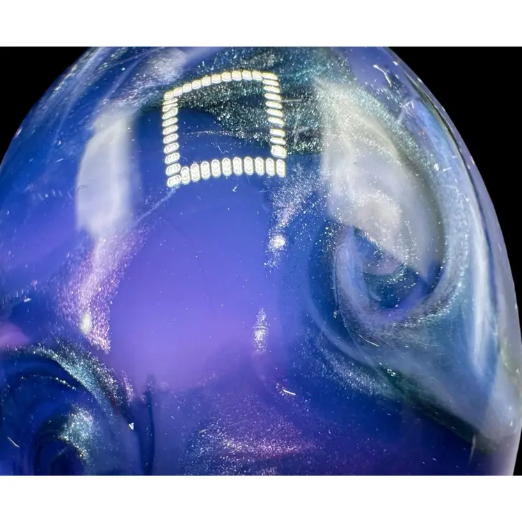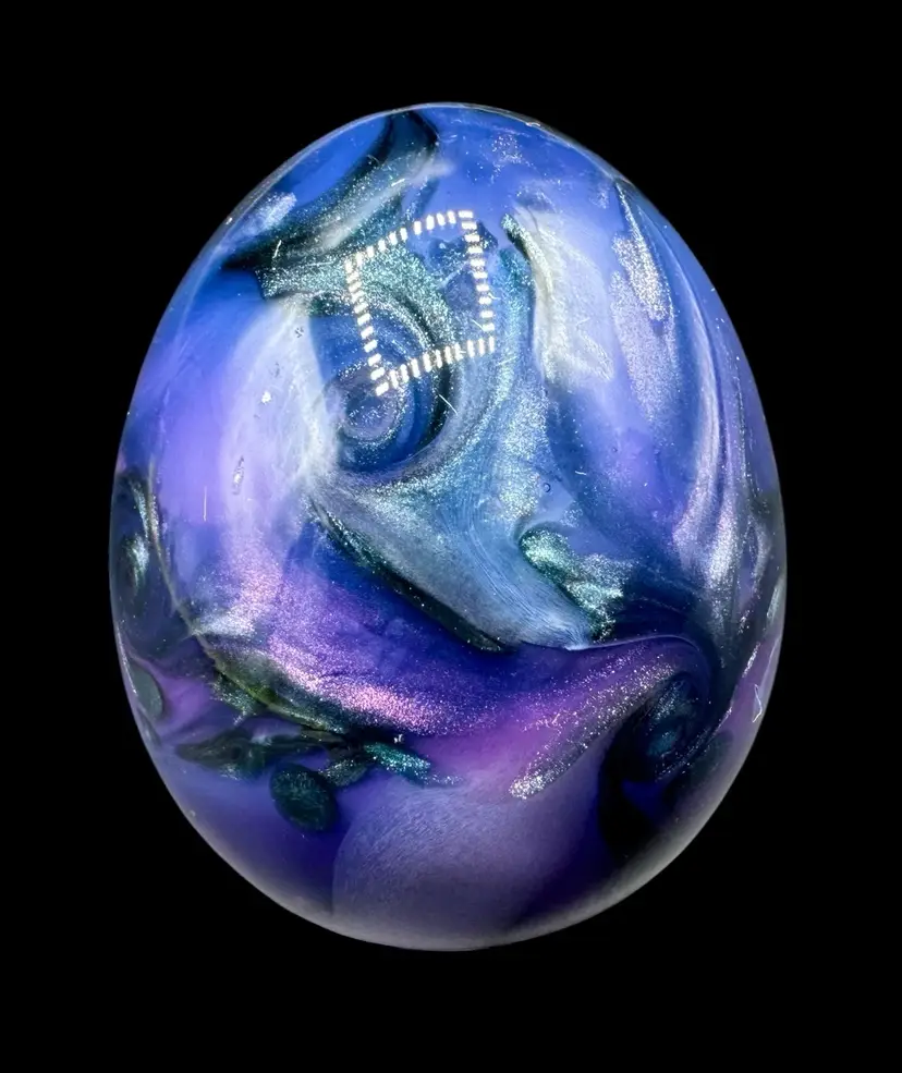 Glass egg made by marble artist Kristi MacDonald. It is unsigned. It includes shimmery swirls in various shades of purple.