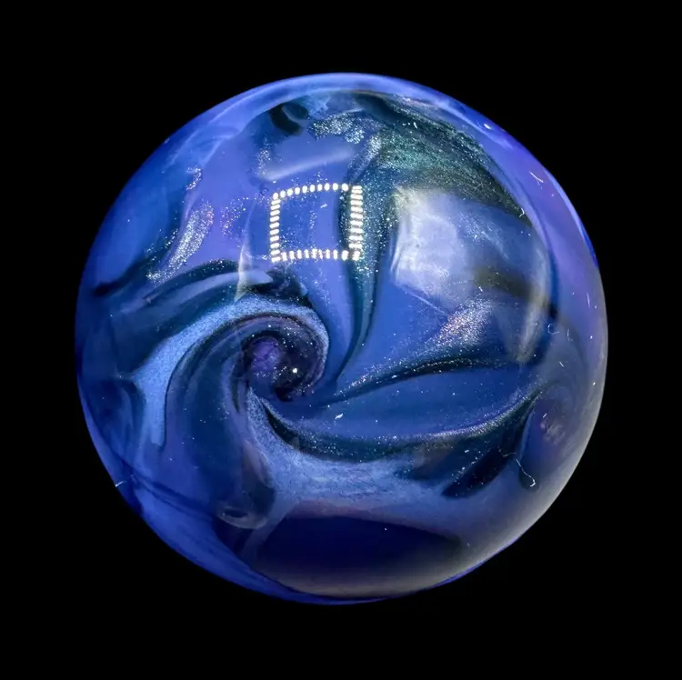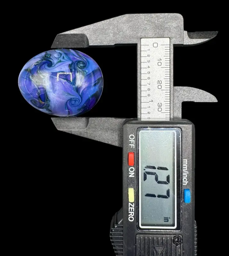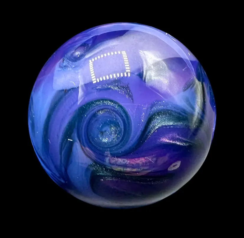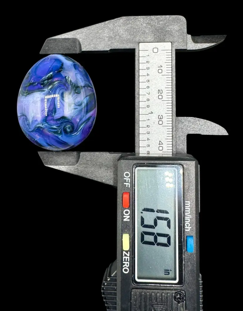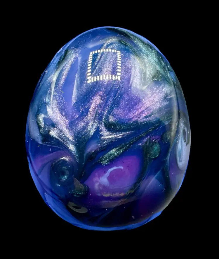 Glass egg made by marble artist Kristi MacDonald. It is unsigned. It includes shimmery swirls in various shades of purple.