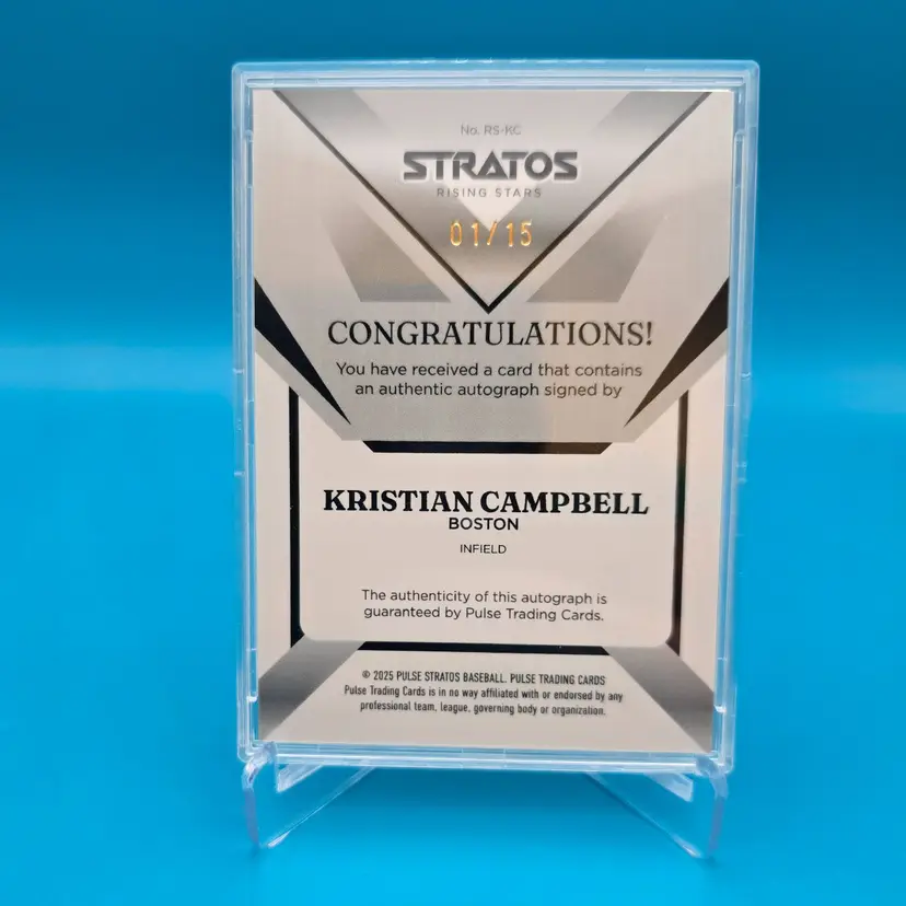 Kristian Campbell first in print run auto numbered 1/15. NM or better condition and fully encased. Stacked shipping applies.