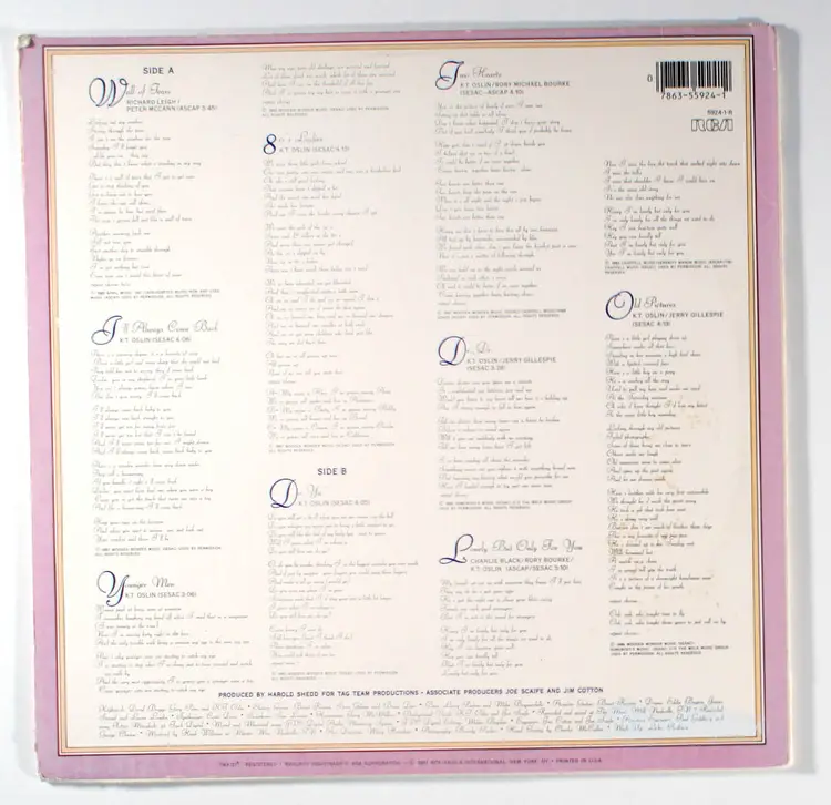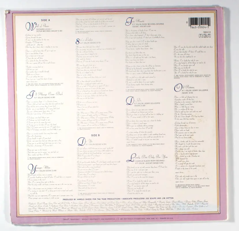 80s Ladies by K.T. Oslin featured singles Wall of Tears, the title track, Do Ya' and I'll Always Come Back. The album reached No. 1 on the Top Country Albums chart and has been certified Platinum by the RIAA. Wall of Tears, made No. 40 on the country charts. It was followed by 80's Ladies, which went to No. 7 and won Oslin the Grammy Award for Best Female Country Vocal Performance and Grammy Award for Song of the Year in 1988. Do Ya was Oslin's third country hit and the first of four singles to hit No. 1 on the country chart. The single went to No. 1 for one week and spent a total of sixteen weeks on the country chart.