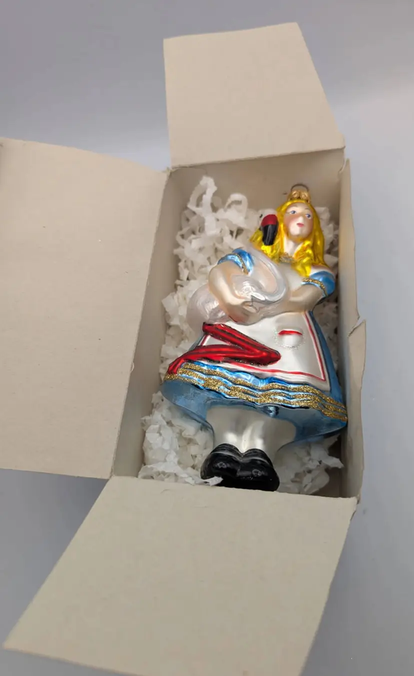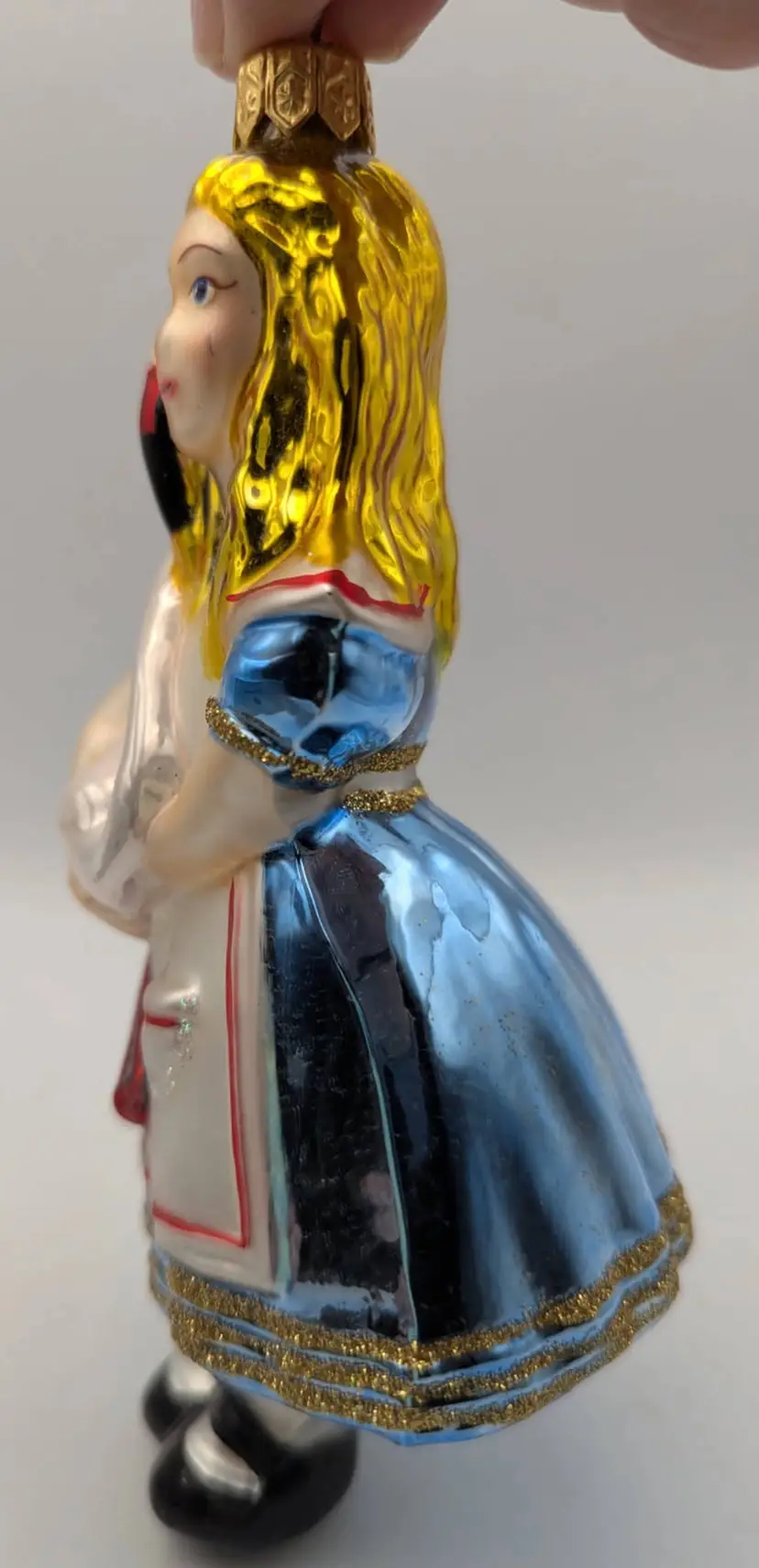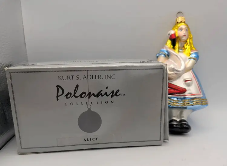 This is a single Polonaise Ornament made in Poland by Komozja with design by Kurt Adler. It is a hand blown glass ornament of Alice in Wonderland. Alice is holding a white swan. Measures: Approx. inches tall. In original box