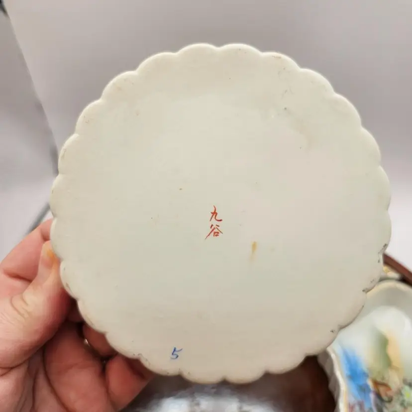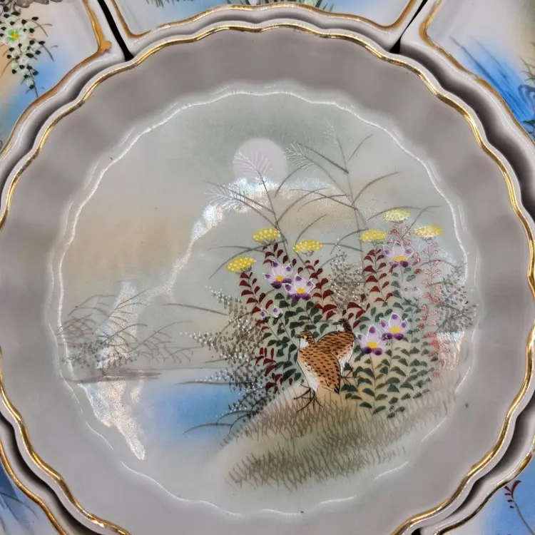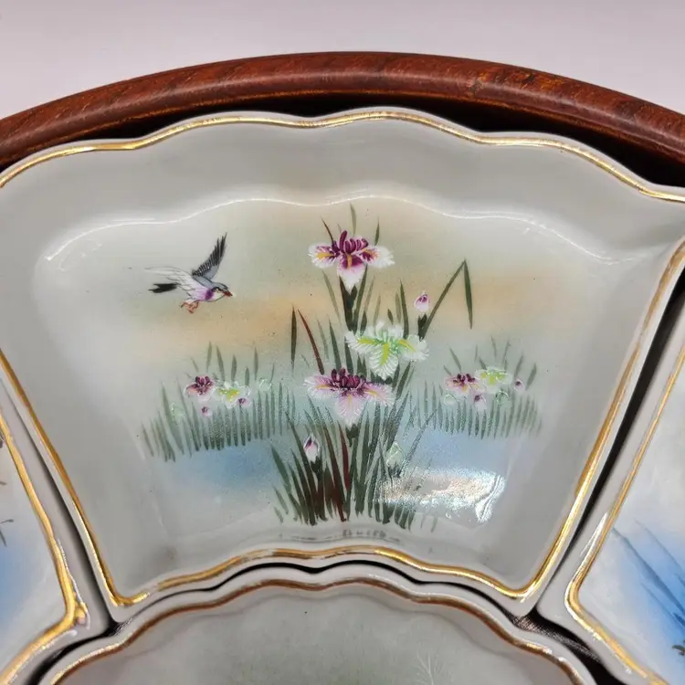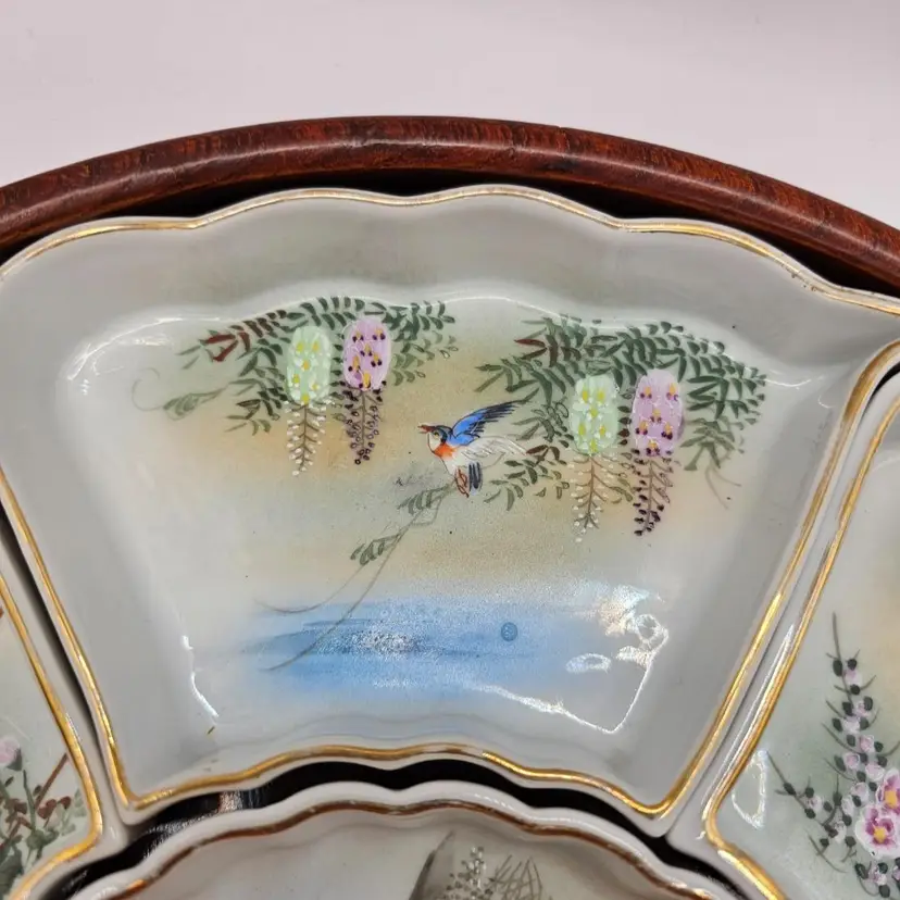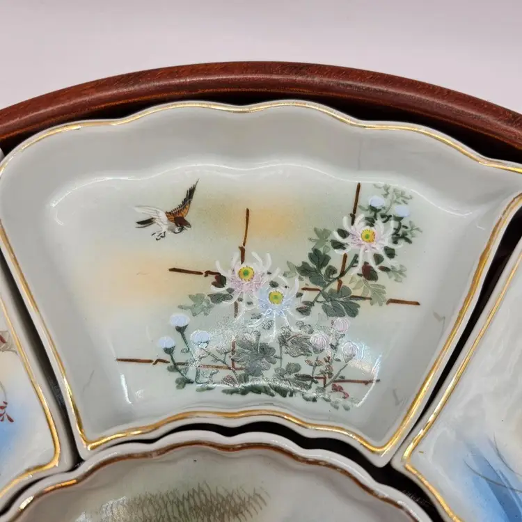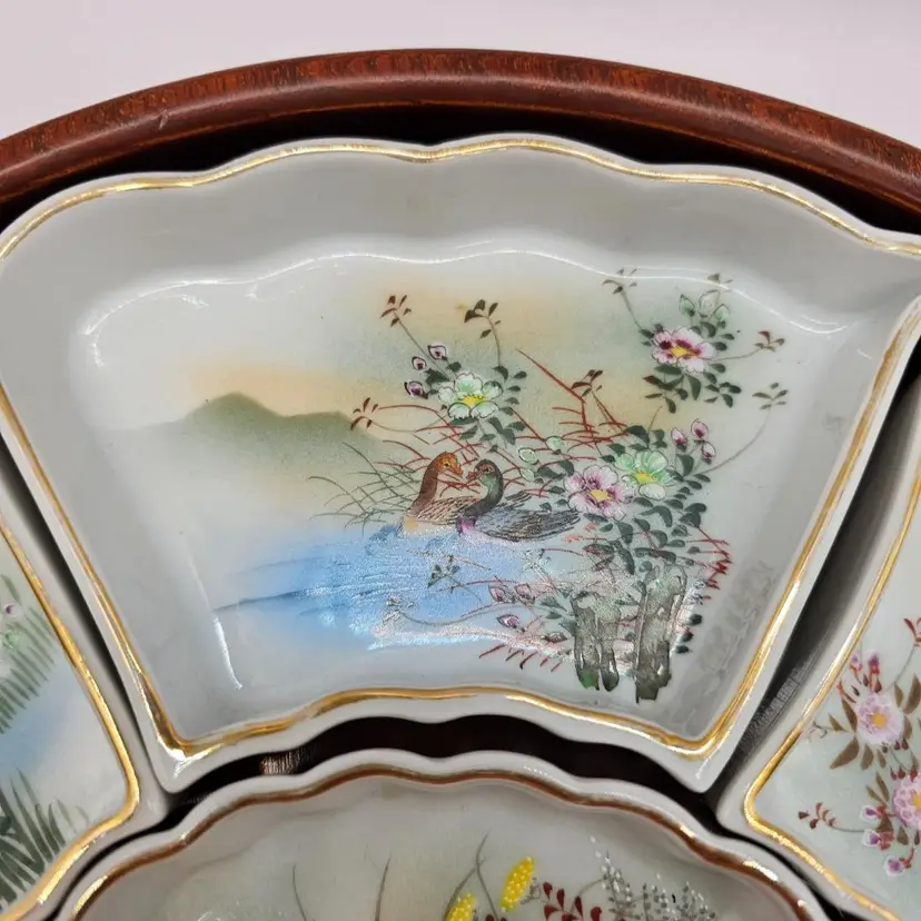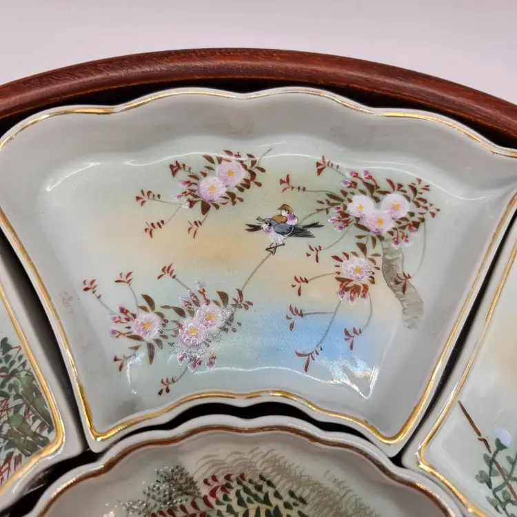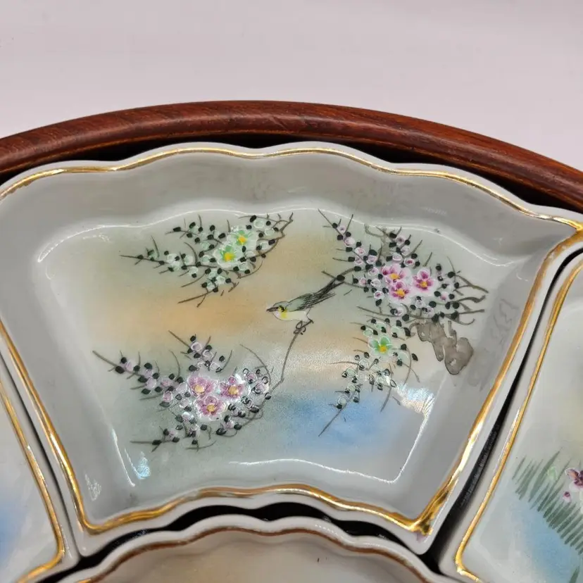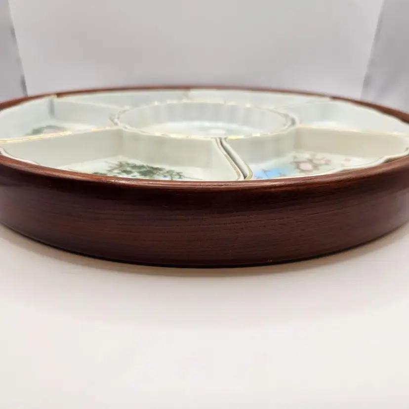 Six ceramic/porcelain wedges and one dip bowl plus wooden tray. No chips or cracks. Some wear to gold trim. Total: 12.5" diameter and 1.75" tall Middle bowl: 5" diameter Wedges: 5.75" x 3.25"