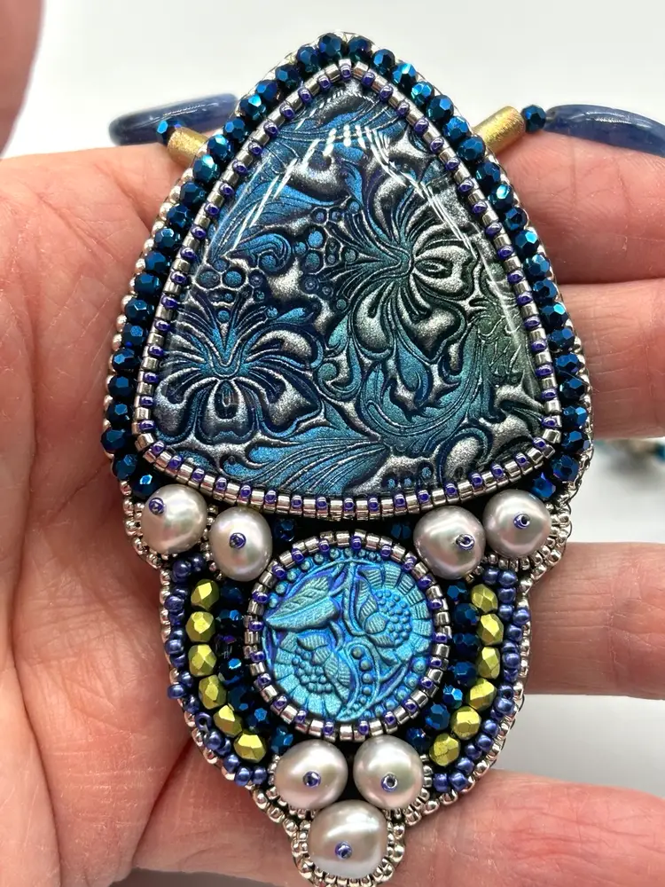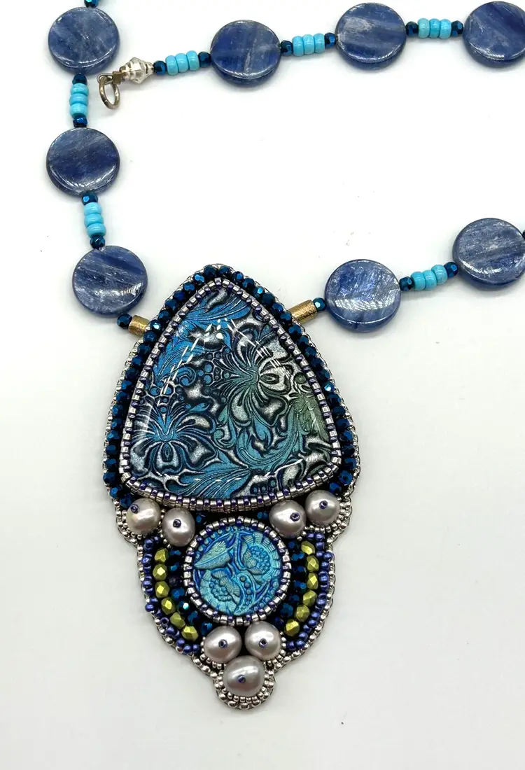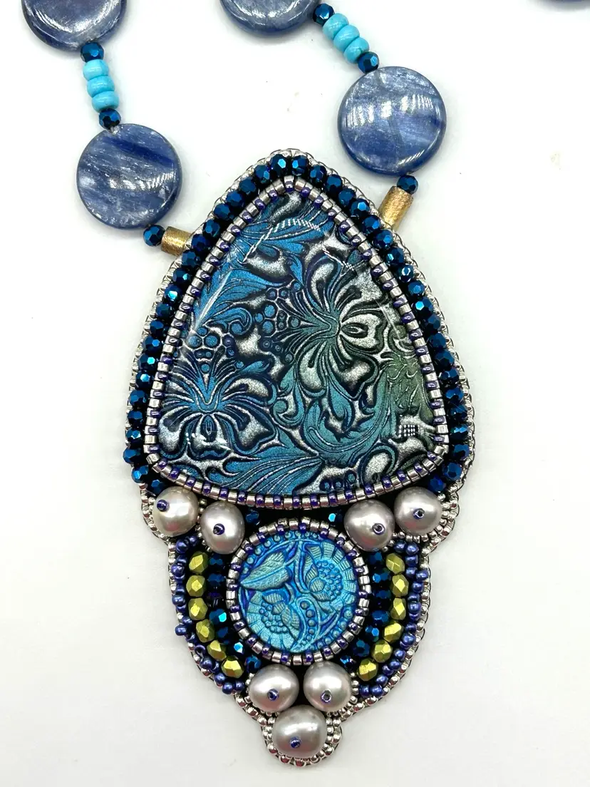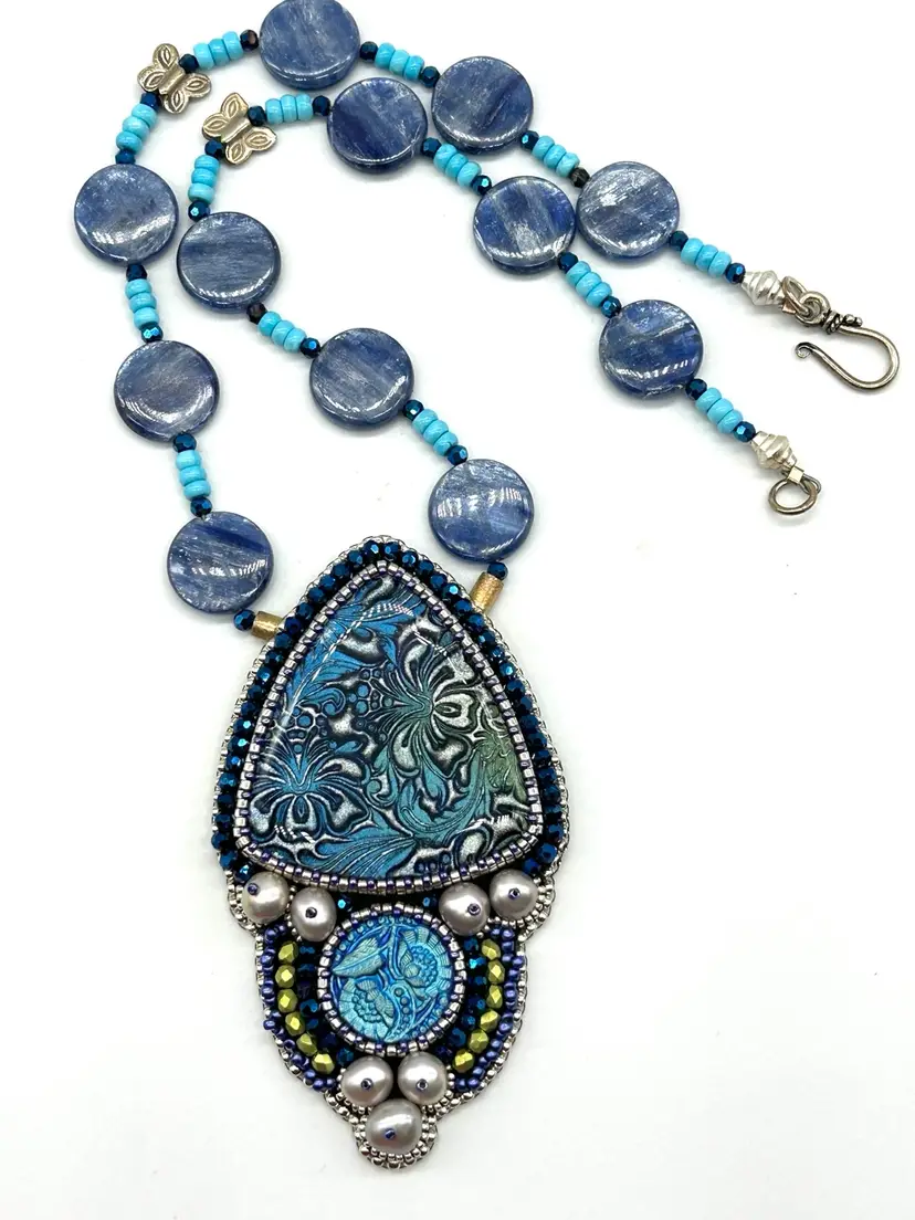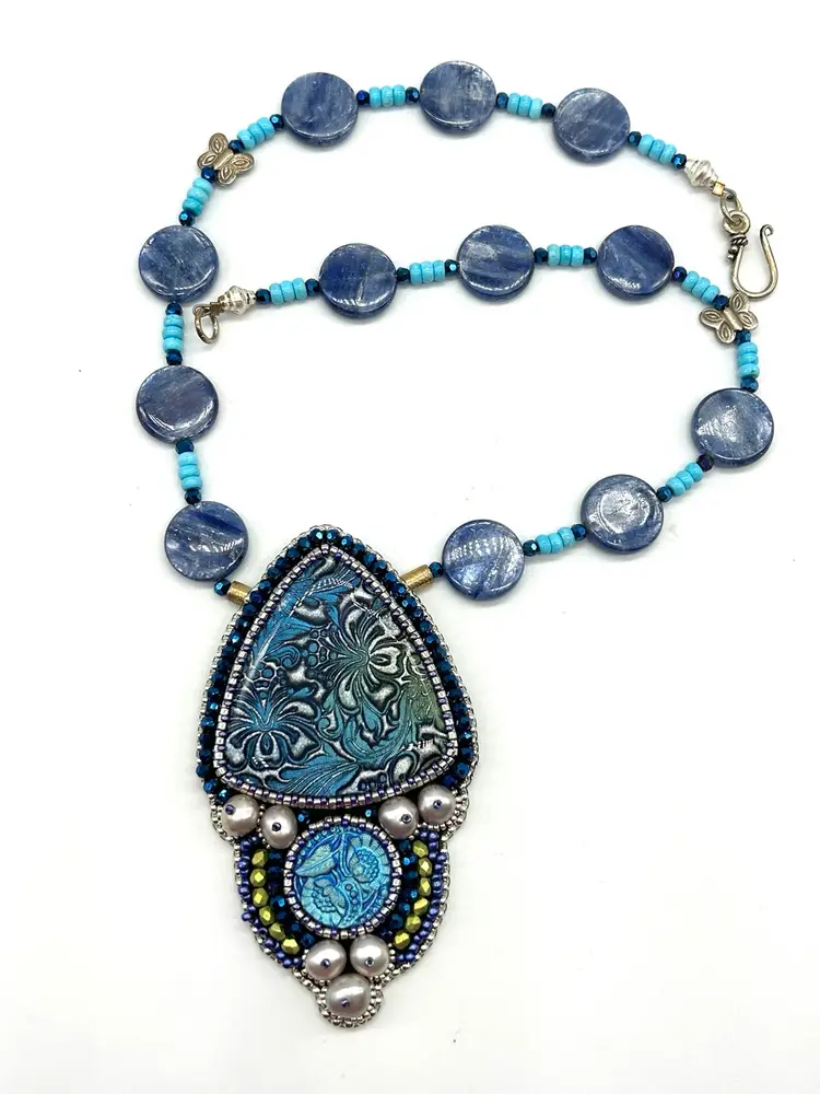 Beautiful polymer clay, button pearl, Czech button bead embroidered necklace. This piece hand beaded by me in my Seattle studio. Piece offers a necklace of natural turquoise and Kyanite beads. Necklace measures 16” long. The pendant measures 3.25” long.