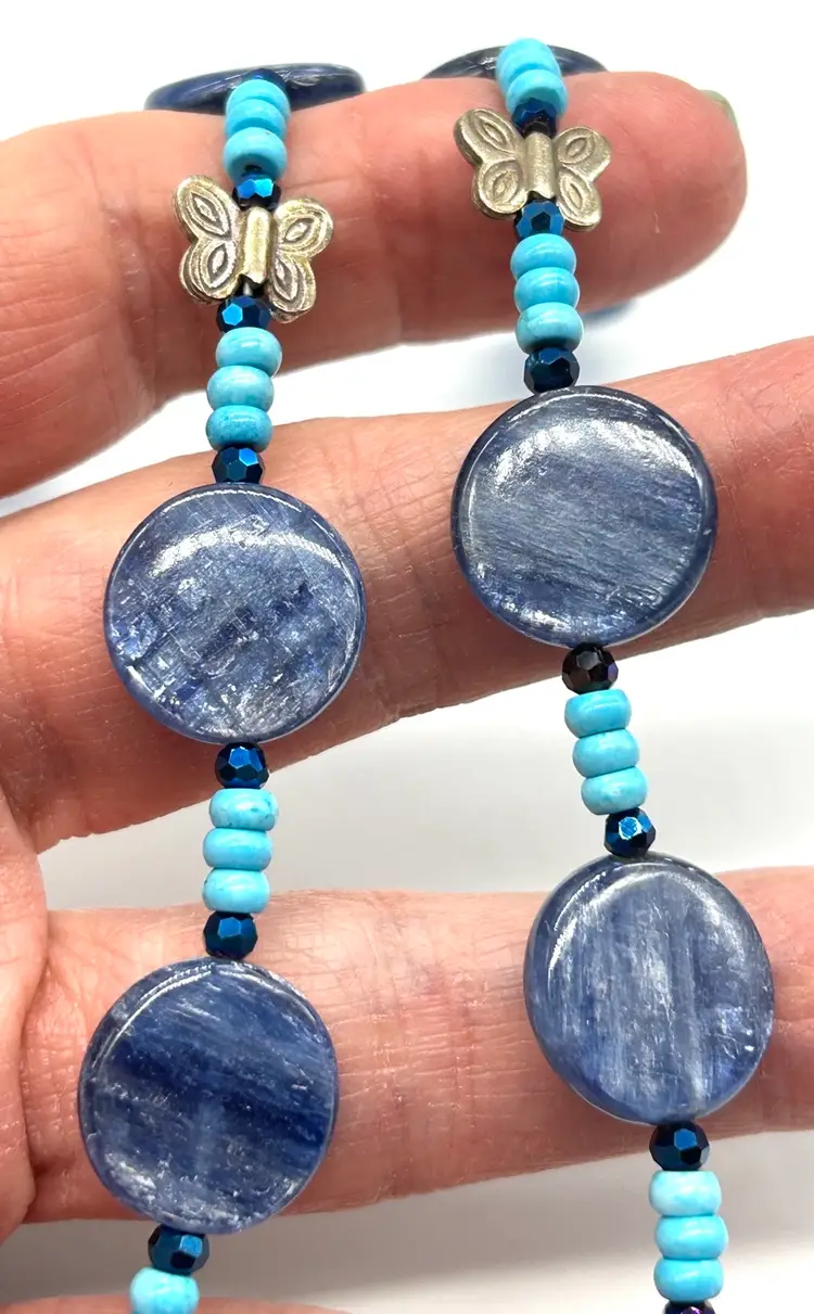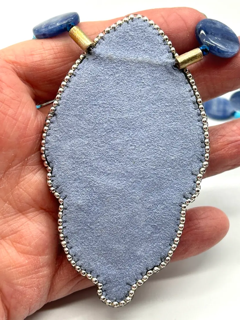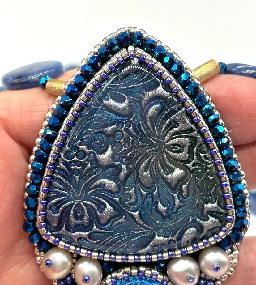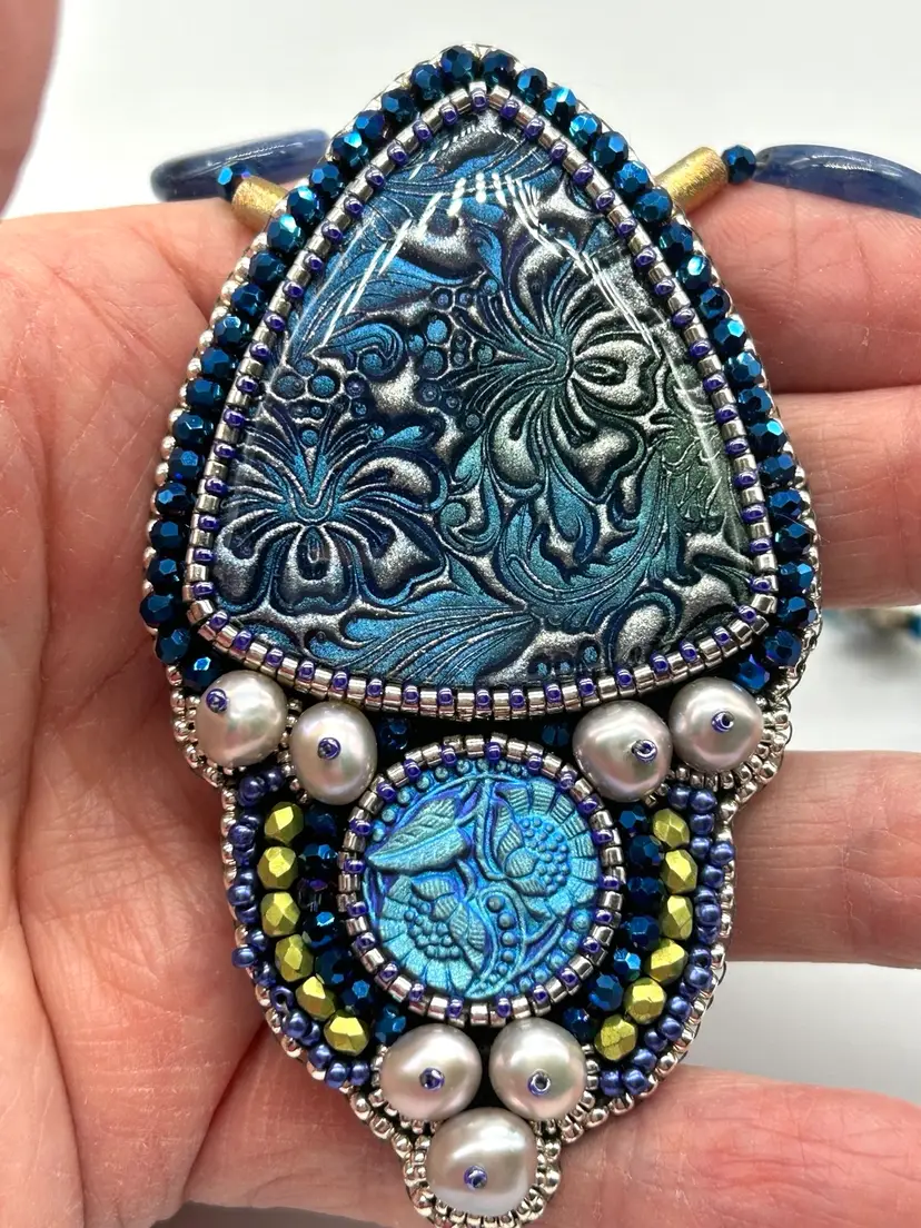 Beautiful polymer clay, button pearl, Czech button bead embroidered necklace. This piece hand beaded by me in my Seattle studio. Piece offers a necklace of natural turquoise and Kyanite beads. Necklace measures 16” long. The pendant measures 3.25” long.