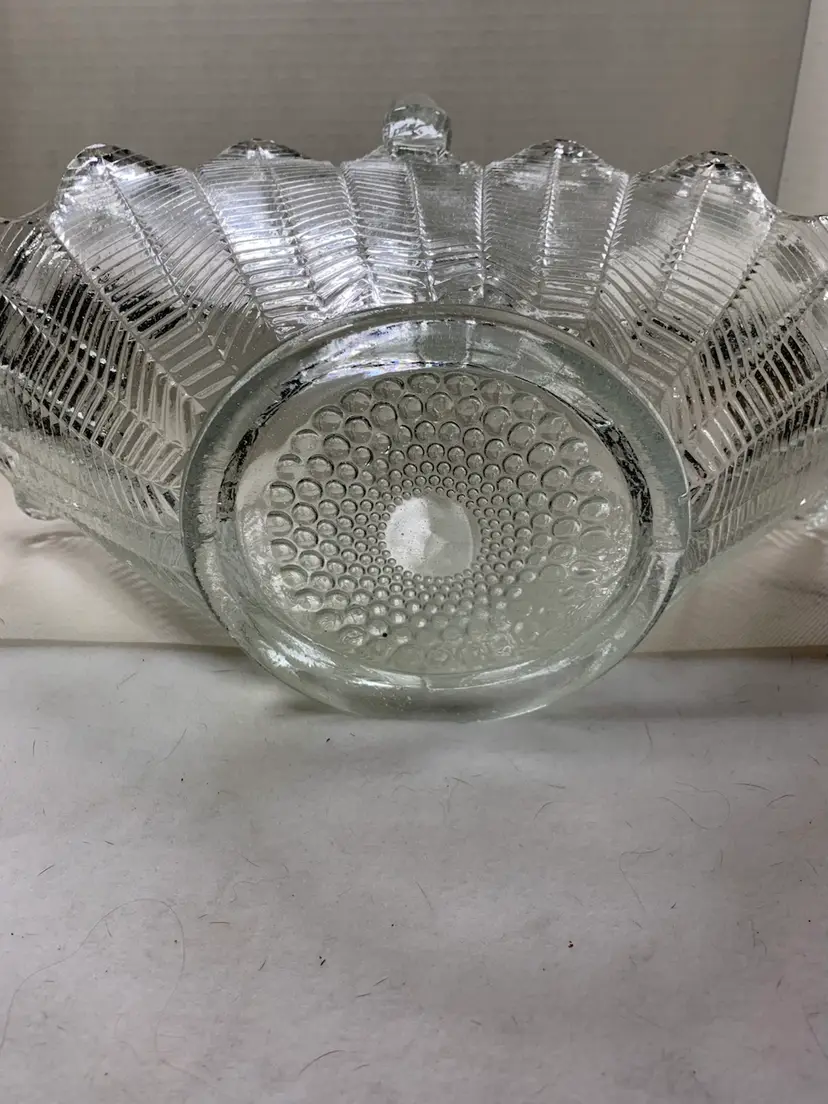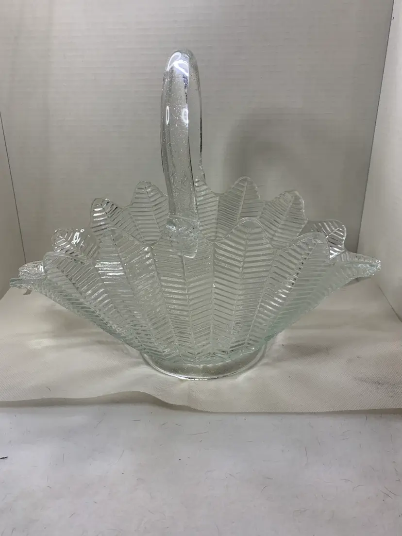 Vintage LE Smith large pulled feather pattern basket with glass handle. It is heavy. No marks, no chips or cracks. Including handle it is 11 inches tall and 14 inches wide at its widest point. How beautiful this would be holding fresh flowers.