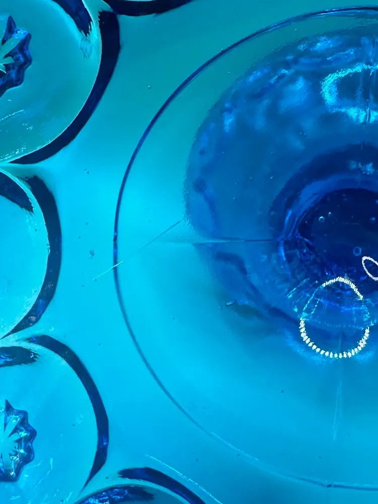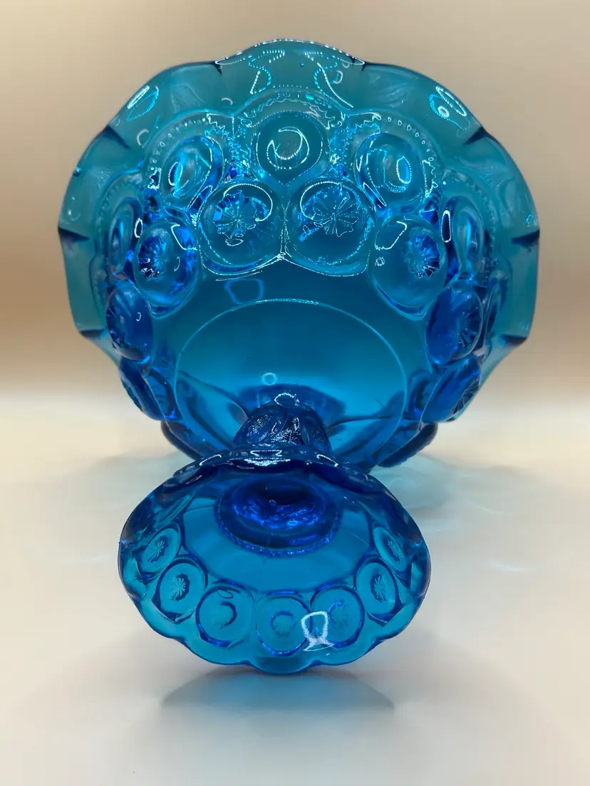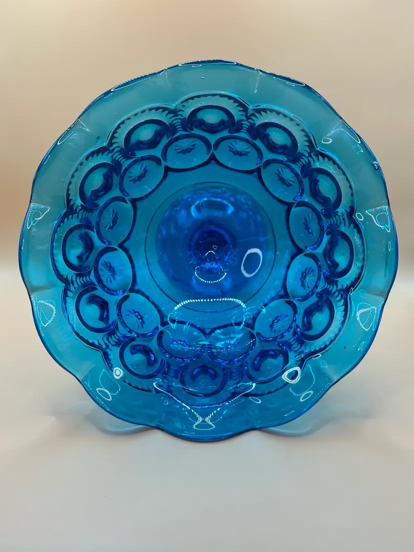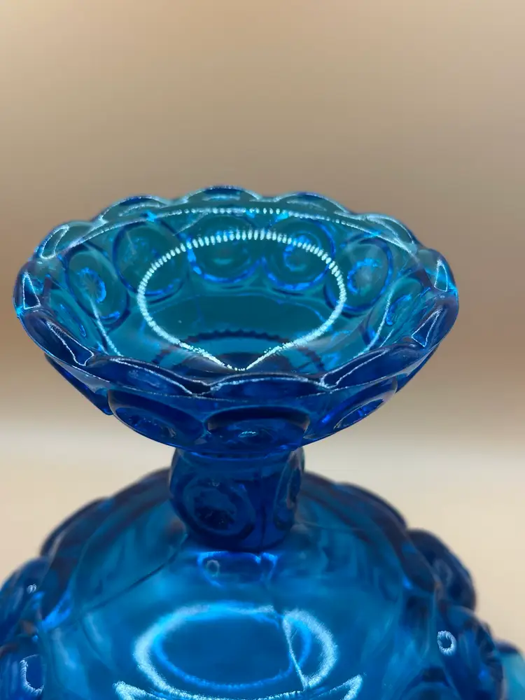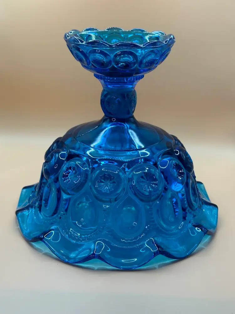 Add a touch of elegance to your home decor with this beautiful L.E. Smith blue glass open compote pedestal base. The unique moon and stars pattern, glossy finish, and art deco style make it a perfect centerpiece for any occasion. Hand wash only for care instructions. This vintage item was manufactured in California in the 1960s, measuring 6 1/4 inches in height and 7 3/4 inches in width, with a round shape and one compartment. Great condition no chips or cracks there is one scratch in the inside see pics.