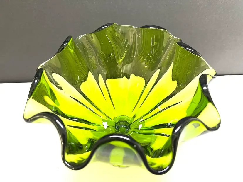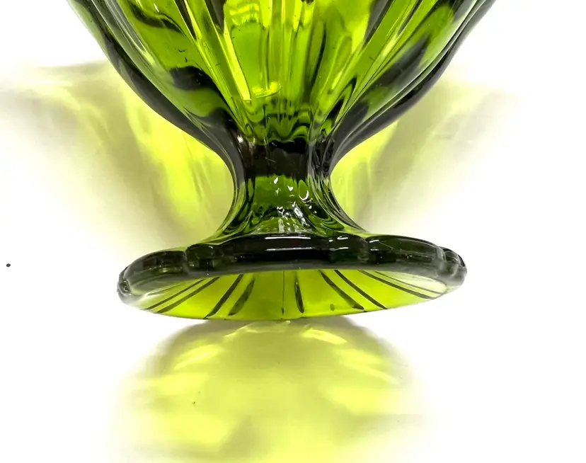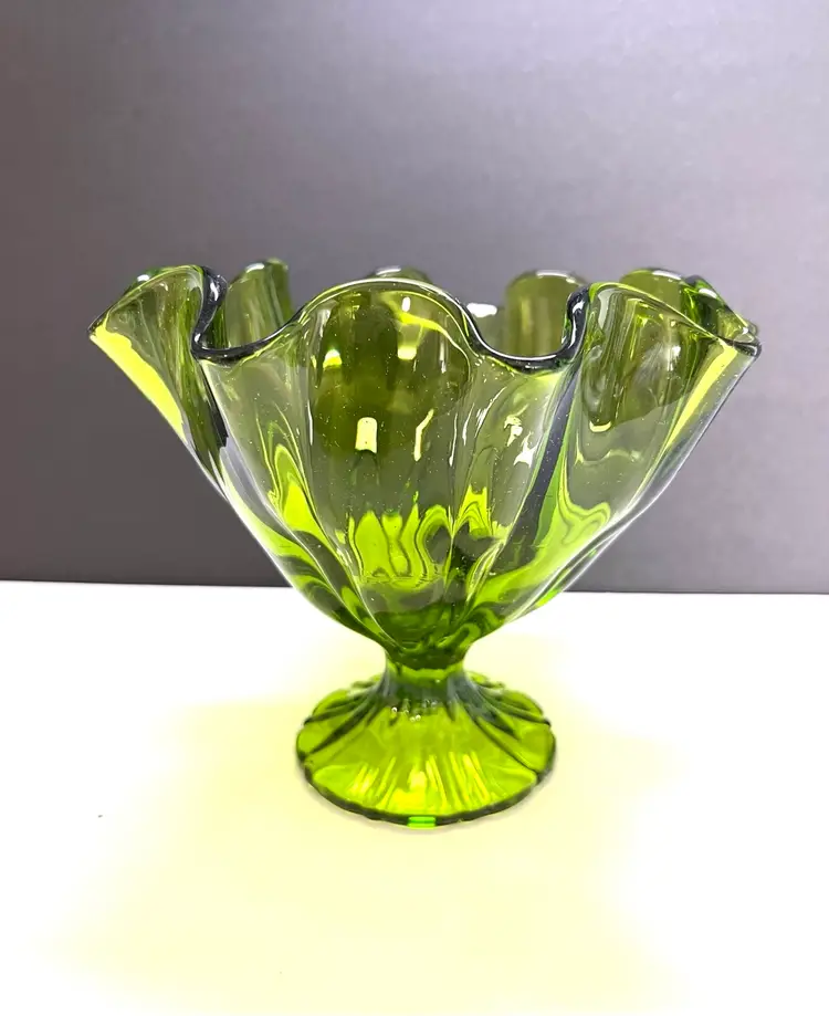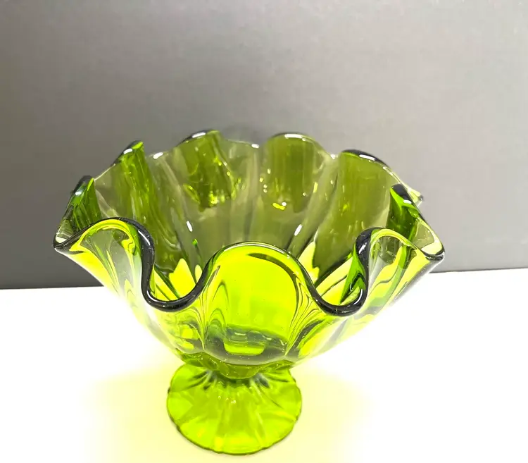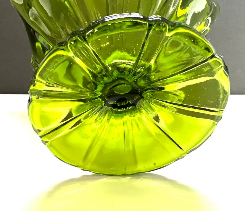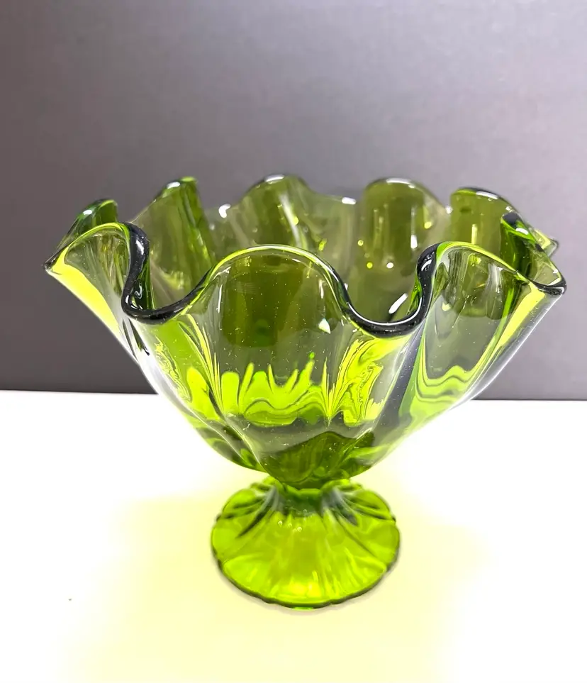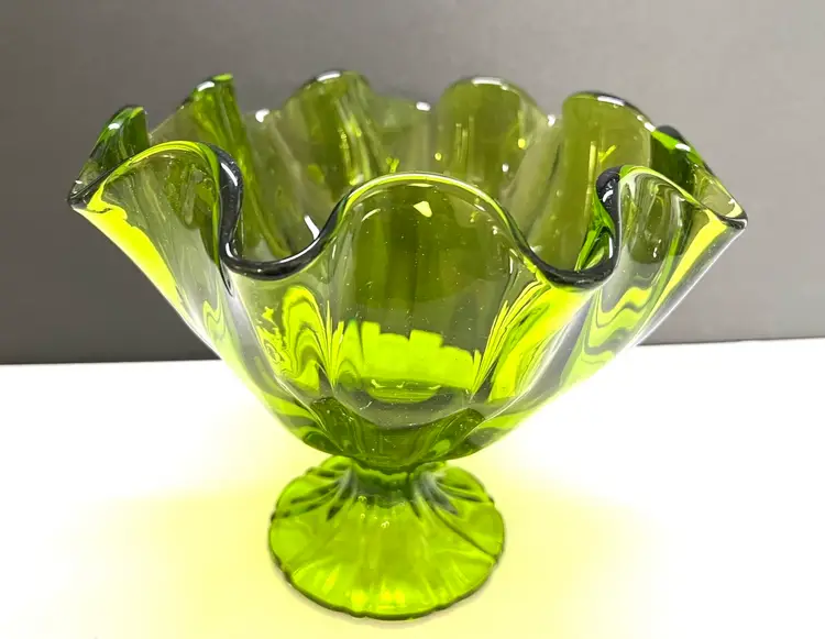 Remarkable LE Smith Art Glass Vase in a green color. Top is handkerchief ruffled. Purchased at a recent estate sale, a perfect vase to display your spring roses. Such a great vase to gift - Size: 6 inches tall by 8 inches diameter at the widest point base is 2 1/4 inches in diameter Condition: vintage excellent - no chips, cracks or damage. Perfect in every way.