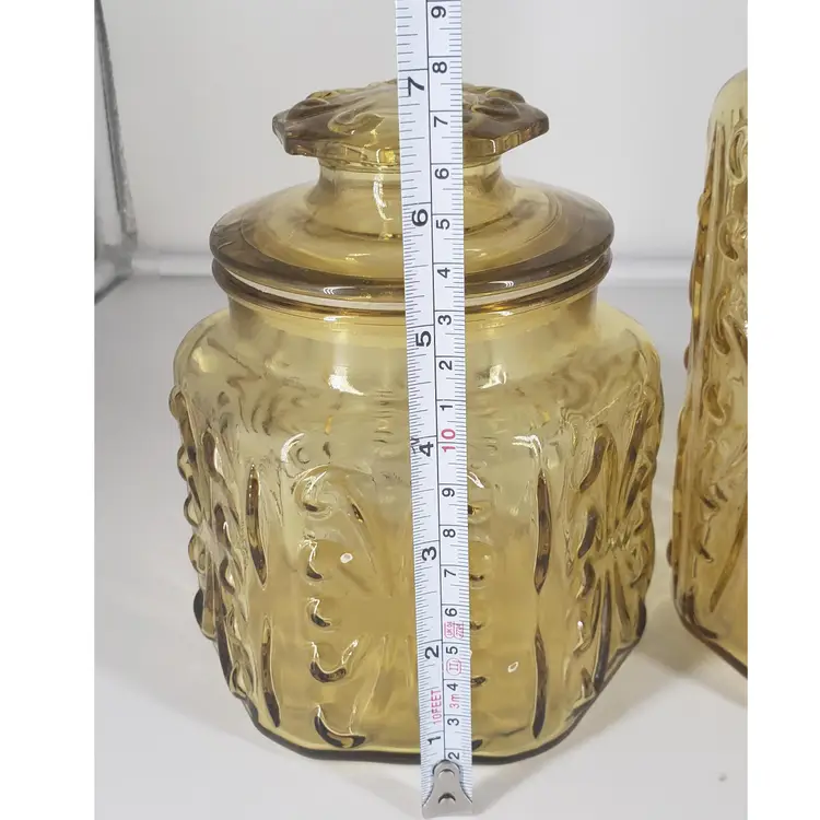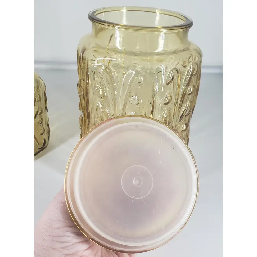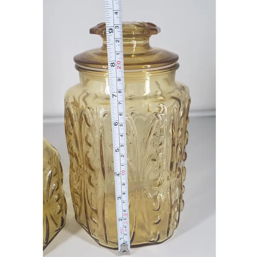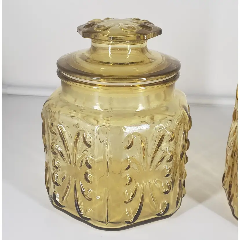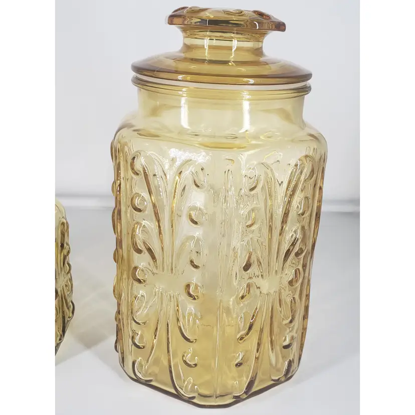 Enhance your kitchen storage and organization with this vintage L. E. Smith Imperial amber glass canister set. The set includes two large canisters with pop-off lids, perfect for storing your dry goods. The Art Deco style features Atterbury Scroll pattern with yellow color, which adds a touch of vintage class to your kitchen décor. The airtight canisters are made of high-quality glass material, ensuring the durability and longevity of the set. Each canister has a height of 9.5 inches and 7 inches, respectively, with a width of 8 inches. This original canister set is a must-have for collectors and adds a unique touch of antique vibe to your kitchen. The canisters have some small chips on the inner rim edges, you can't see them with the lids on, please see pictures.
