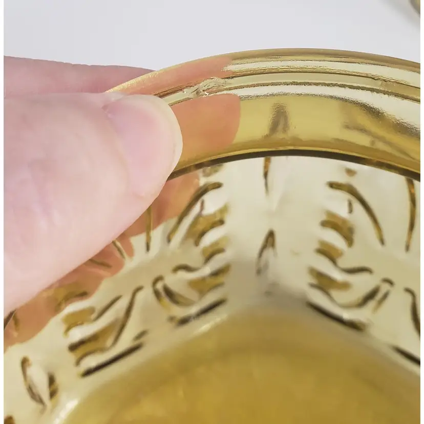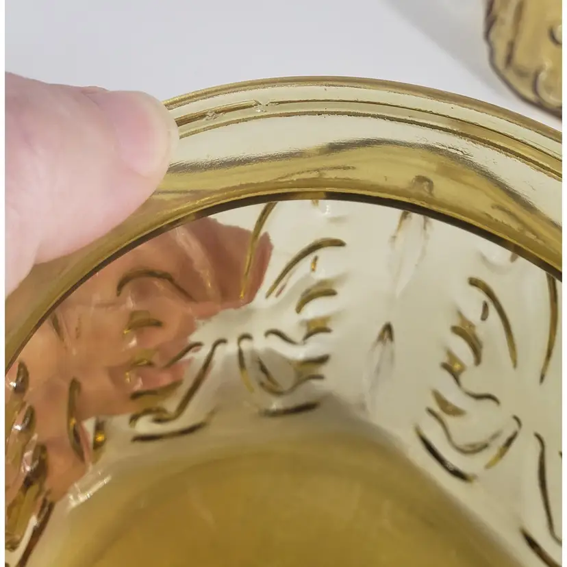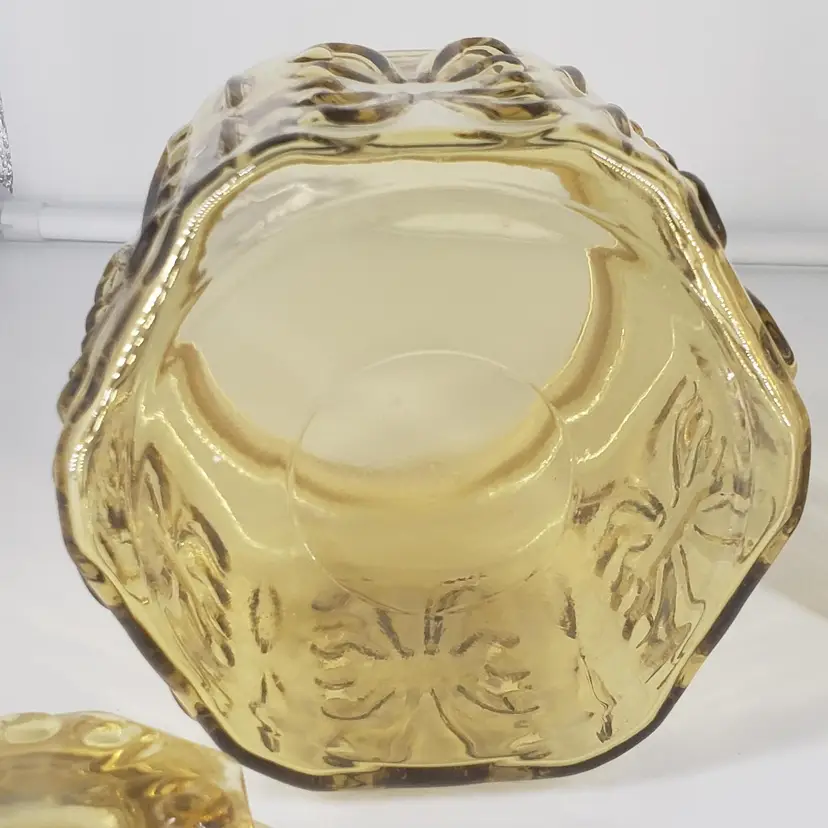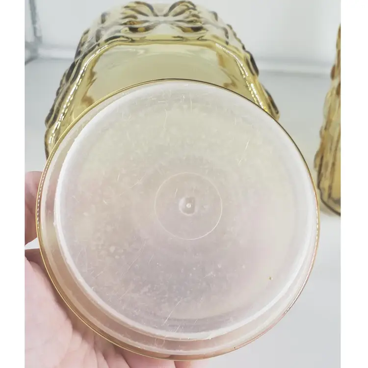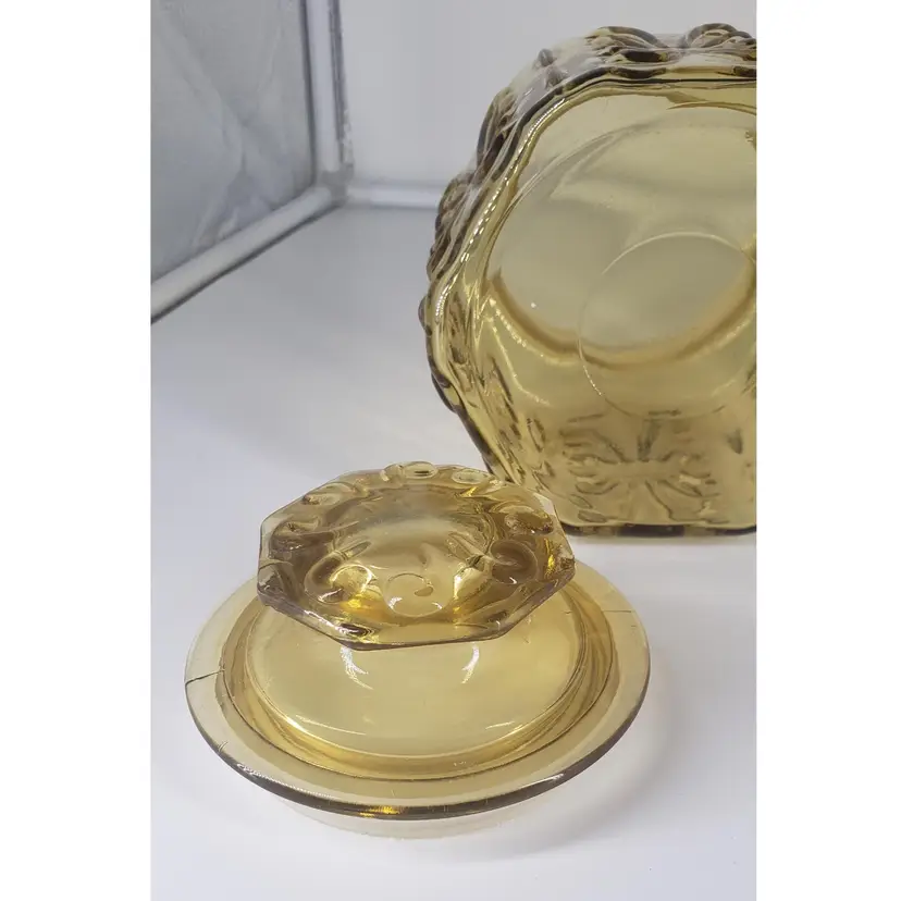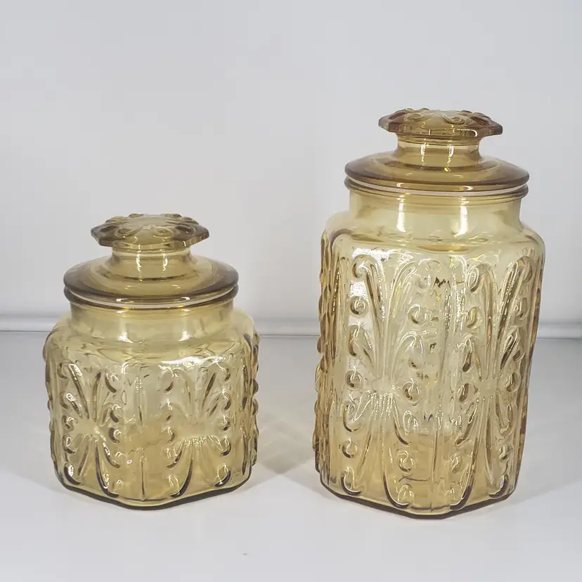 Enhance your kitchen storage and organization with this vintage L. E. Smith Imperial amber glass canister set. The set includes two large canisters with pop-off lids, perfect for storing your dry goods. The Art Deco style features Atterbury Scroll pattern with yellow color, which adds a touch of vintage class to your kitchen décor. The airtight canisters are made of high-quality glass material, ensuring the durability and longevity of the set. Each canister has a height of 9.5 inches and 7 inches, respectively, with a width of 8 inches. This original canister set is a must-have for collectors and adds a unique touch of antique vibe to your kitchen. The canisters have some small chips on the inner rim edges, you can't see them with the lids on, please see pictures.