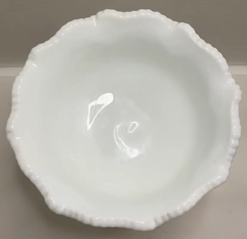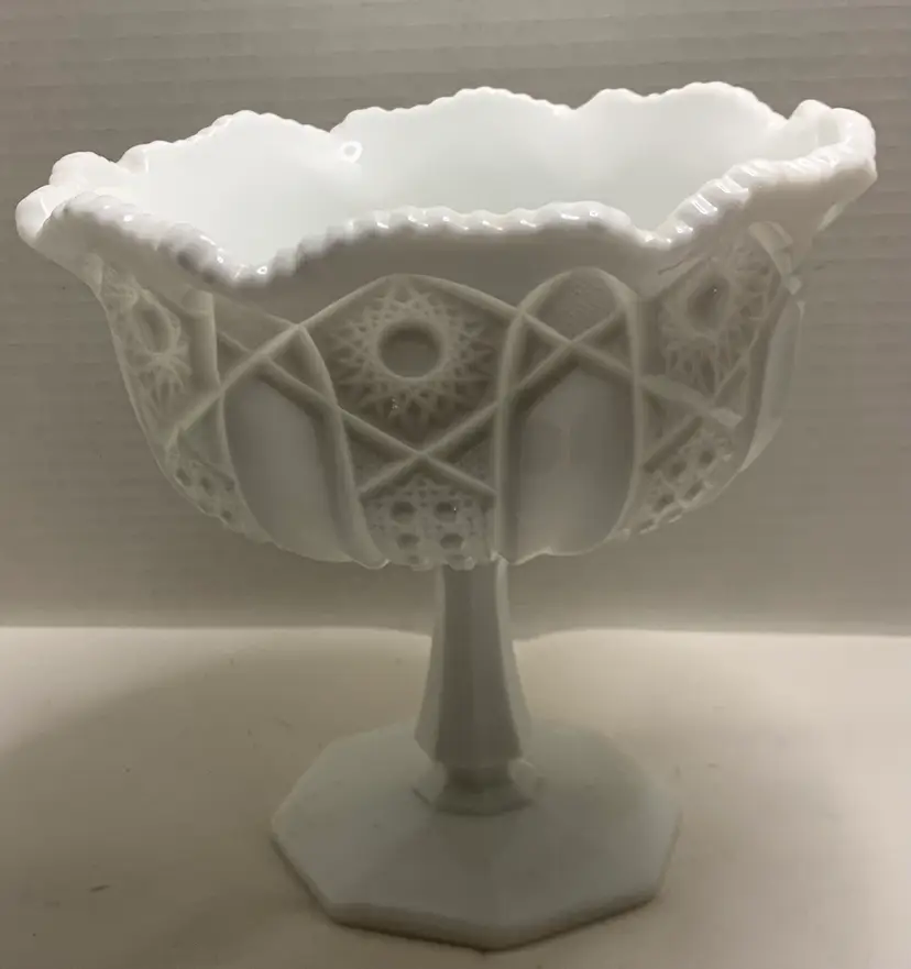 Milk glass cane and arches pedestal compote. Pre-owned. 7” high and 7.25 wide. No chips or cracks.