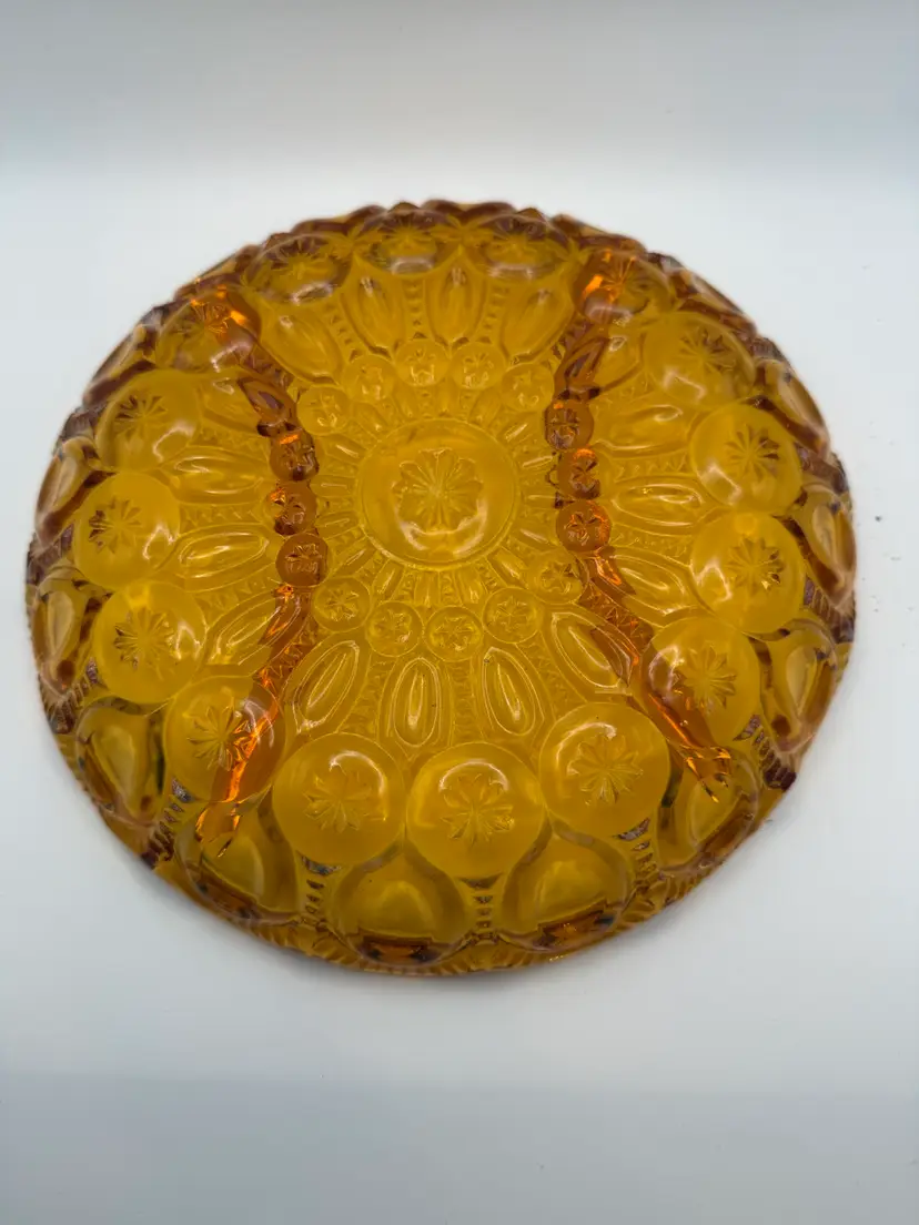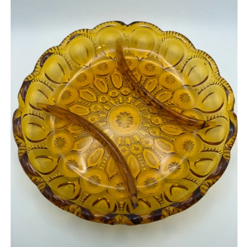 Relish dishes and vegetable trays like this were common tableware items, designed to serve appetizers or side dishes. The divided sections allowed for the separation of different food items, making them practical for entertaining. The amber color is particularly sought after by collectors for its warm, vintage aesthetic.