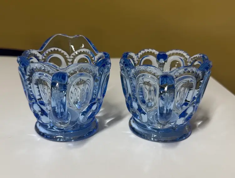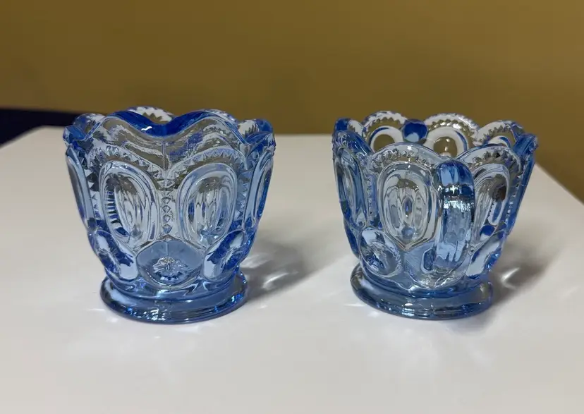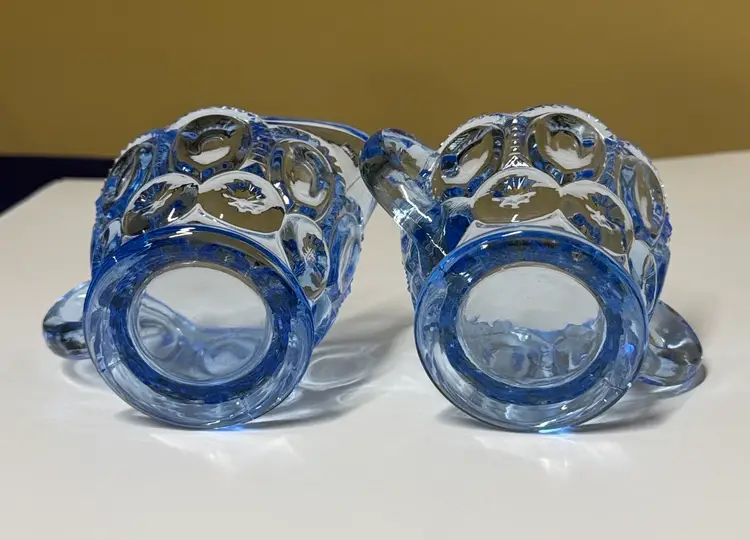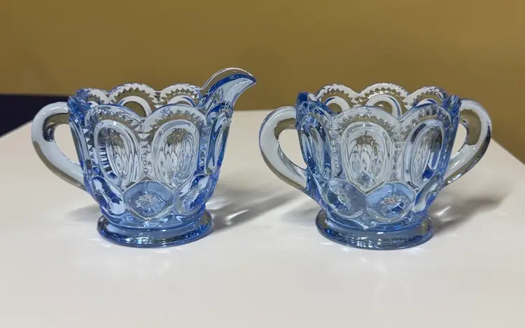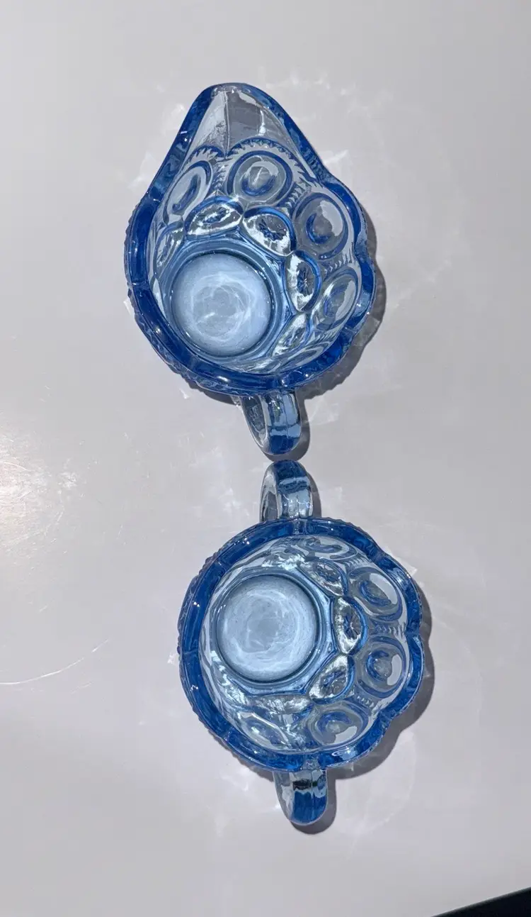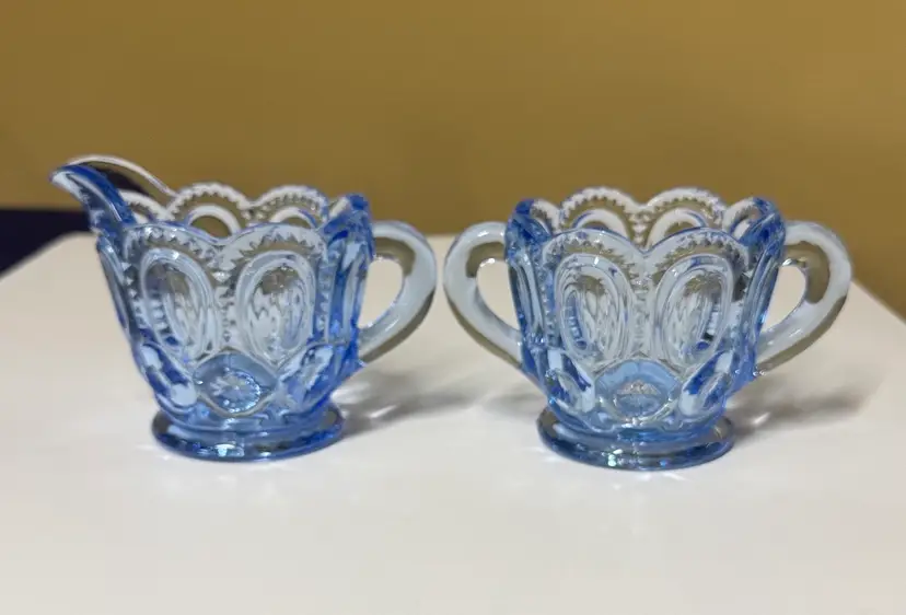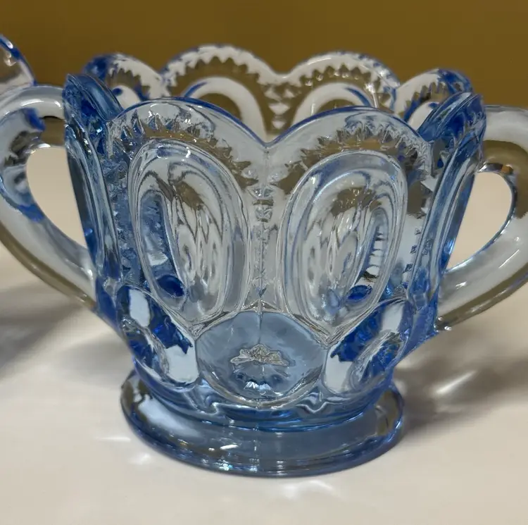 Elegant blue glass creamer and sugar set. Intricate design with dual handles. Vintage Collectible L E Smith Moon And Stars Sugar Bowl Creamer Set Ice Blue 3” tall 3.25” diameter Excellent condition with no breaks or chips (13601126256)