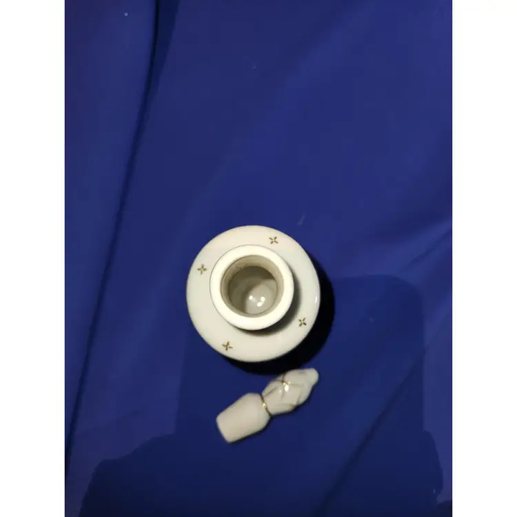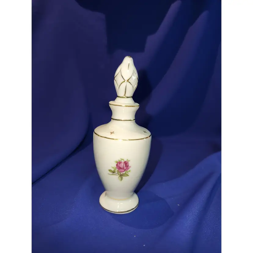 L & M Ceramic Perfume Bottle with Stopper Pink Roses on front and back Stopper has a diamond design in 'gold' gilt Measures 5 inches ta In excellent condition - no chips or cracks
