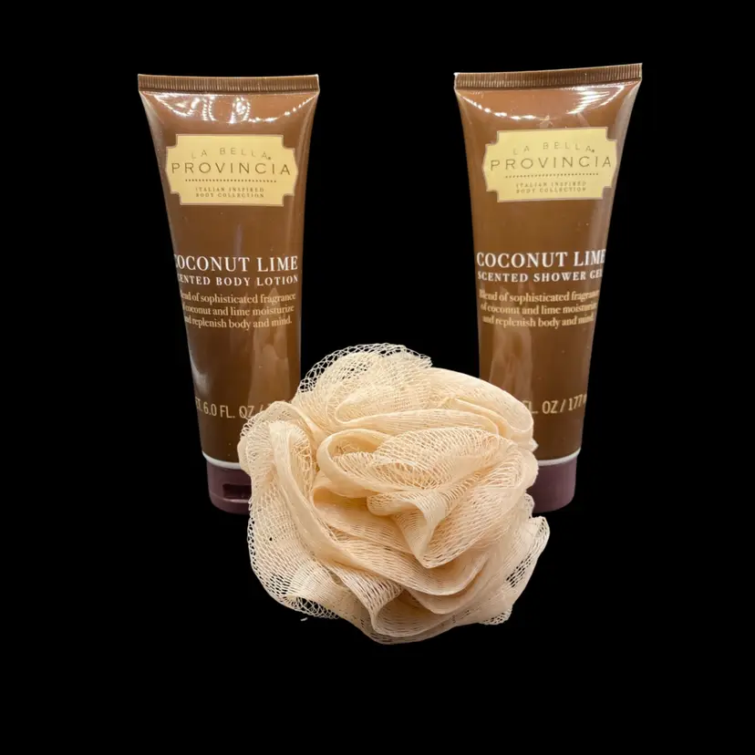 Italian inspired body lotion Coconut Lime scented body lotion and Shower gel. 6.9 Fl. Oz. Includes mesh bath sponge. NEW sealed product.