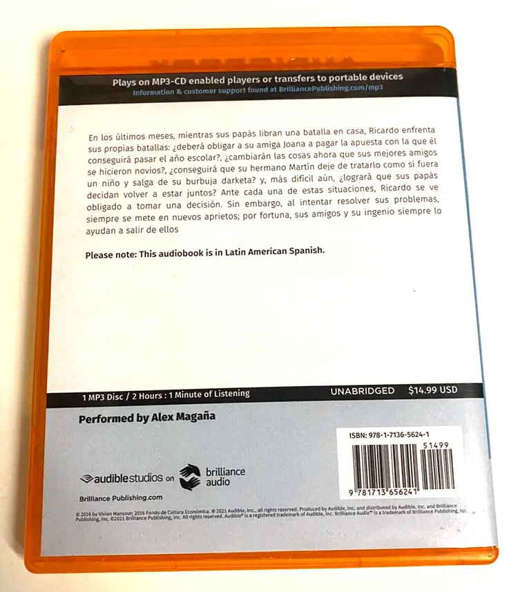 Returns Accepted: ReturnsNotAccepted Publication Year: 2016 Type: Audiobook Format: MP3 CD Language: Spanish Book Title: La Decision de Ricardo Author: Vivian Mansour Narrative Type: Fiction Publisher: Brilliance Publishing Run Time: 121 minutes Country/Region of Manufacture: United States Narrator: Alex Magana