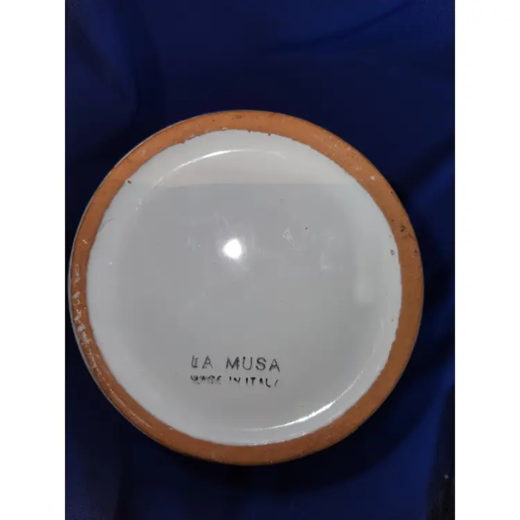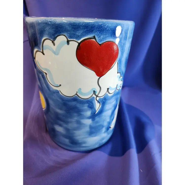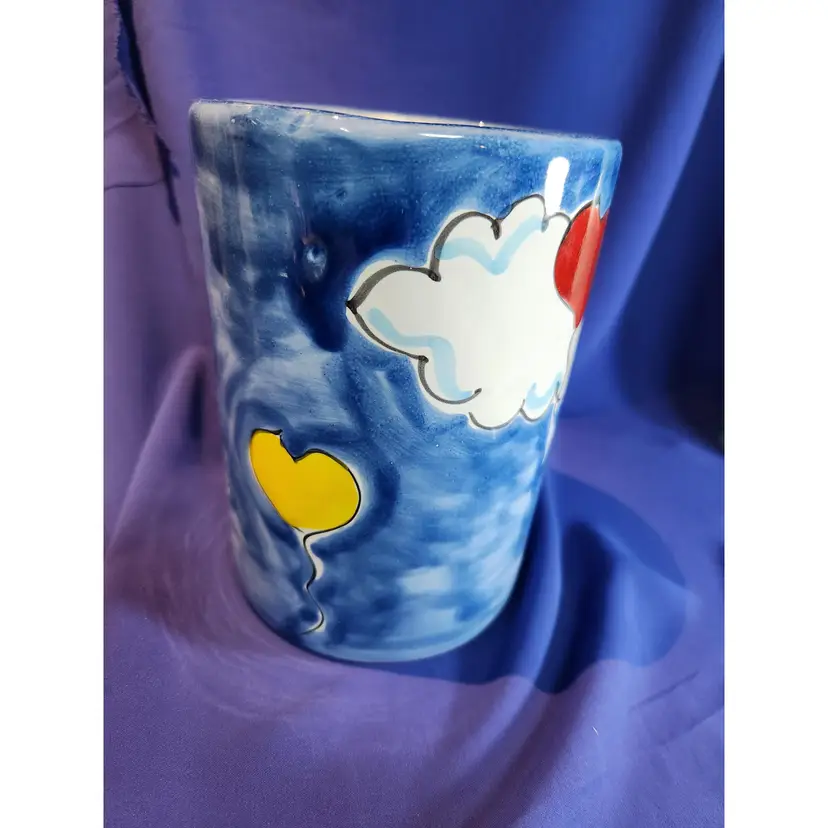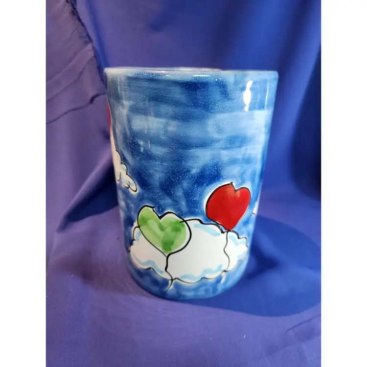 La Musa Ceramic Cannister / Vase Italy Handpainted Features blue sky with cloud and heart balloons of purple, yellow, red and green Measures 6 inches tall by 4 1/4 inches wide Can be used as a vase, cannister to store utensil, etc.. There are manufacture defect on the inside - bumps and indents which are difficult to photograph Outside is in excellent condition - see pictures
