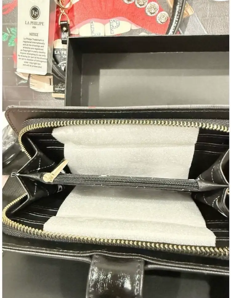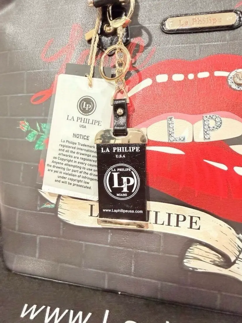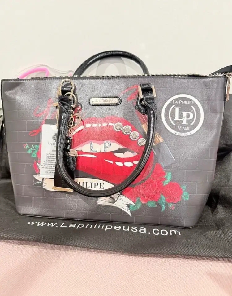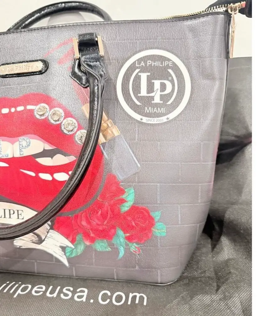 Large tote bag 18 by 11 by 6 Wallet is sold out online and in stores. Introducing the La Philipe Miami Tote, a bold statement piece for the modern woman. This elegant black tote, adorned with vibrant lip rhinestone embellishments, is perfect for those who love to make a fashion-forward impression. Detachable shoulder strap.