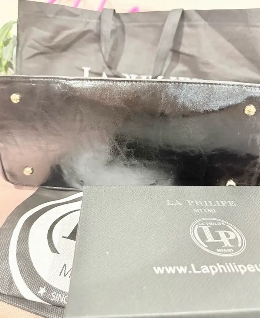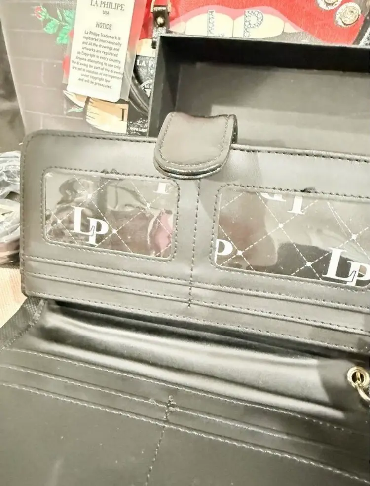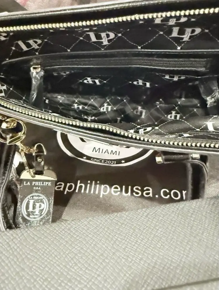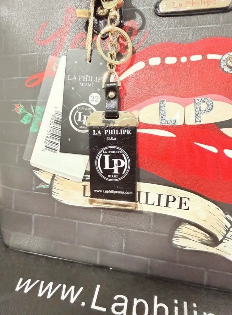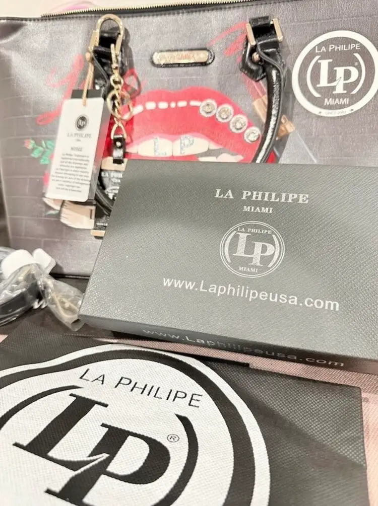 Large tote bag 18 by 11 by 6 Wallet is sold out online and in stores. Introducing the La Philipe Miami Tote, a bold statement piece for the modern woman. This elegant black tote, adorned with vibrant lip rhinestone embellishments, is perfect for those who love to make a fashion-forward impression. Detachable shoulder strap.