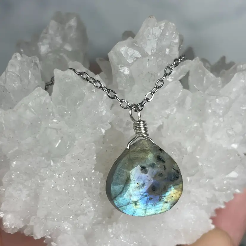 Wire wrapped by me. Stainless steel adjustable chain is 16” with a 2” extender.