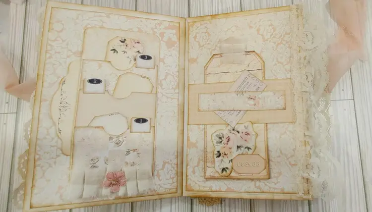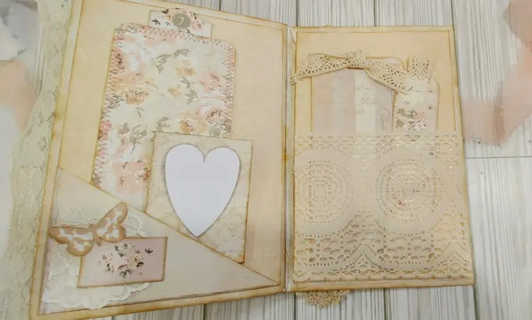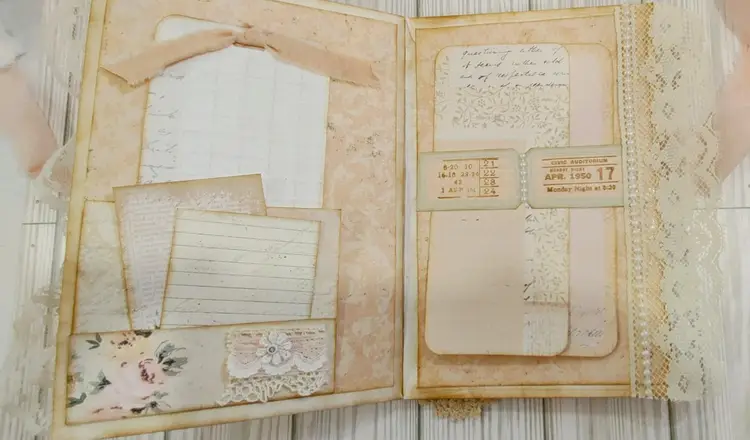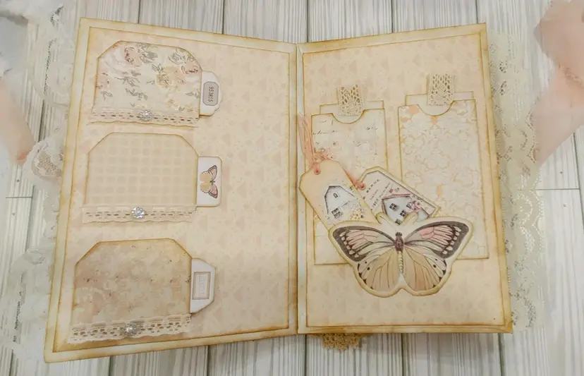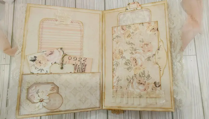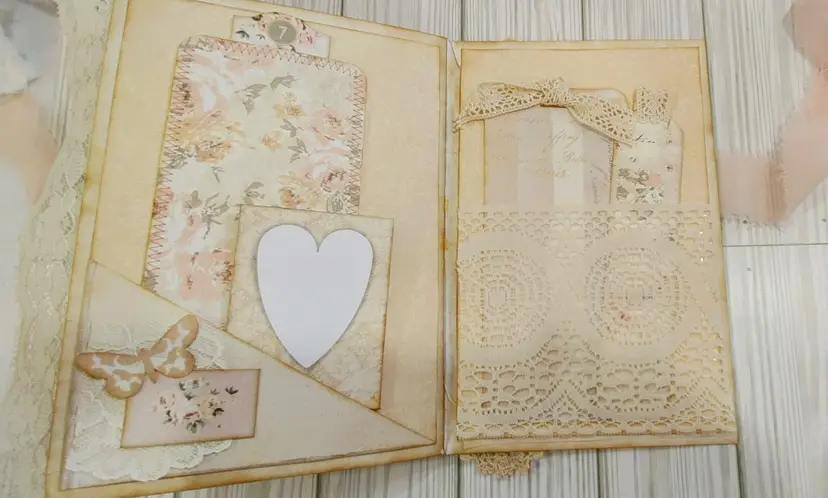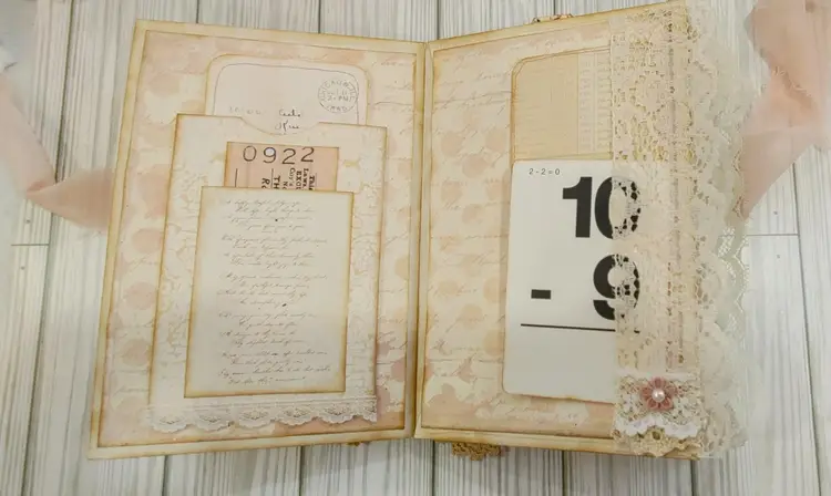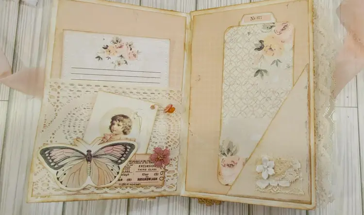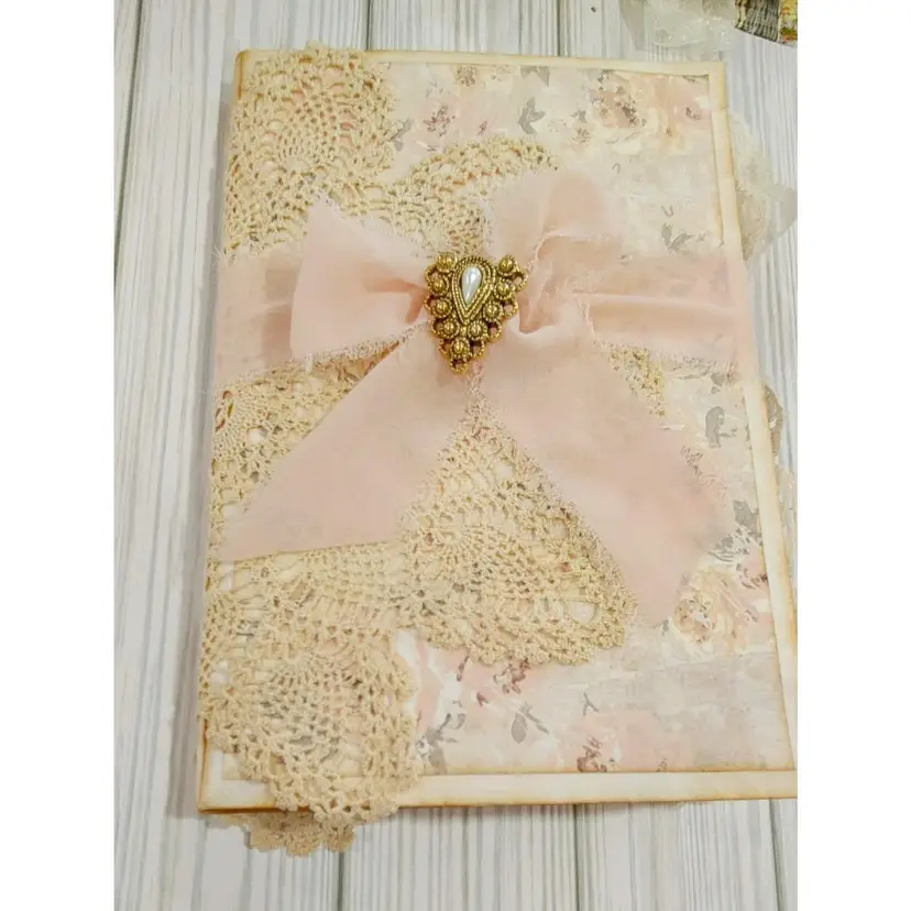 Capture your memories in this beautiful Lace and Floral Envelope Junk Journal. Perfect for creative journaling and memory keeping. It features a vintage tea dyed lace doily on the cover, soft pink ribbon, and a charming vintage-style button. Measuring 6" x 8 1/2" with 14 pages, this journal is a lovely addition to your collection, complete with pockets and tags.