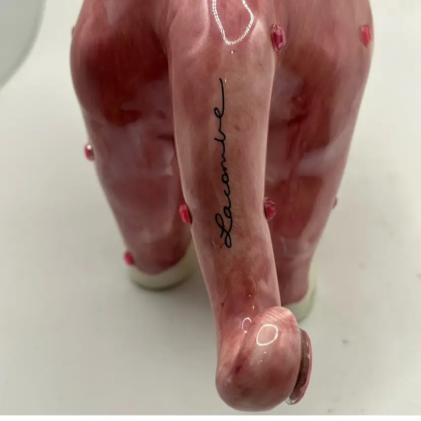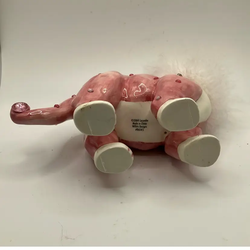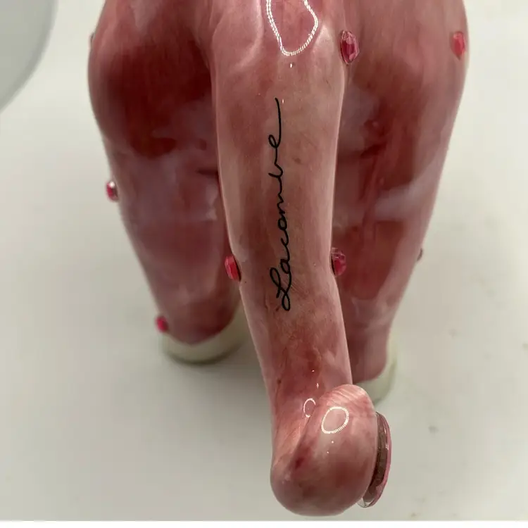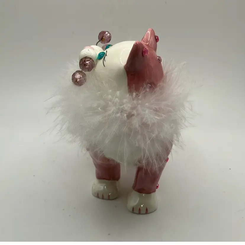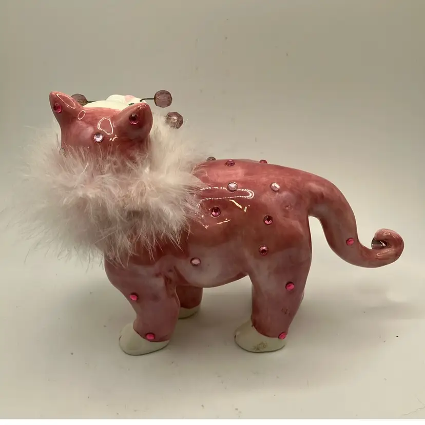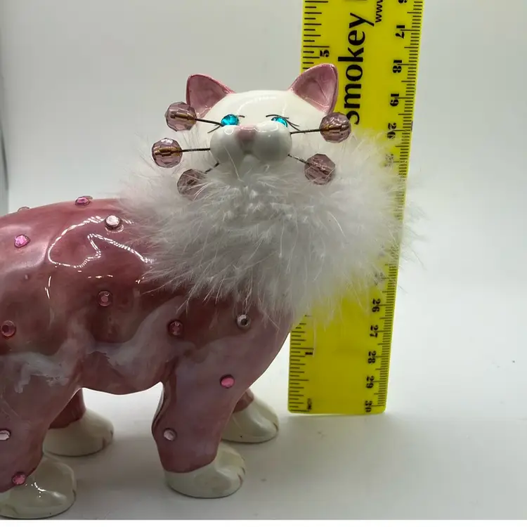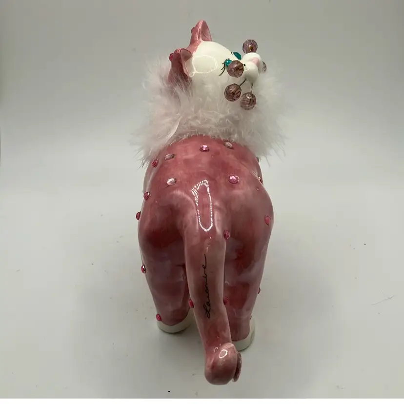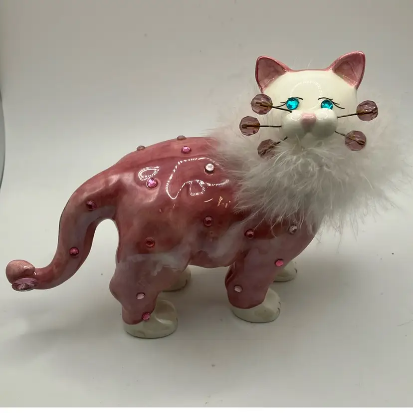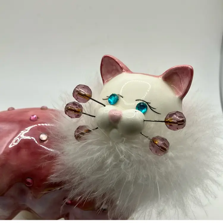 This is one fancy cat! ๐ป signed Lacombe on tail and marked on bottom. Bedazzled blue eyes, white feather boa, and pink colored whiskers and body gems. Missing one whisker but otherwise in good condition. 5โ tall.