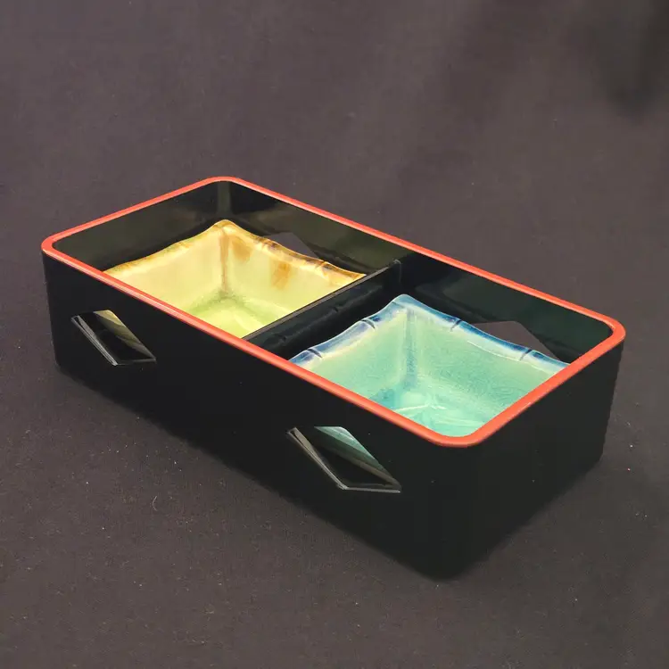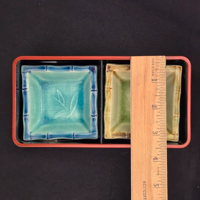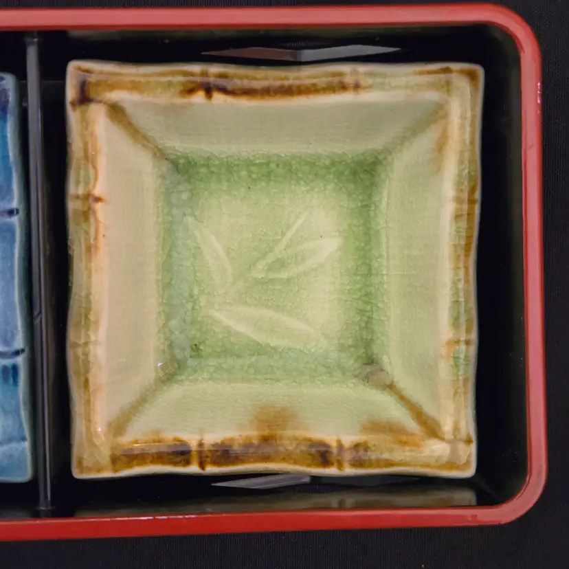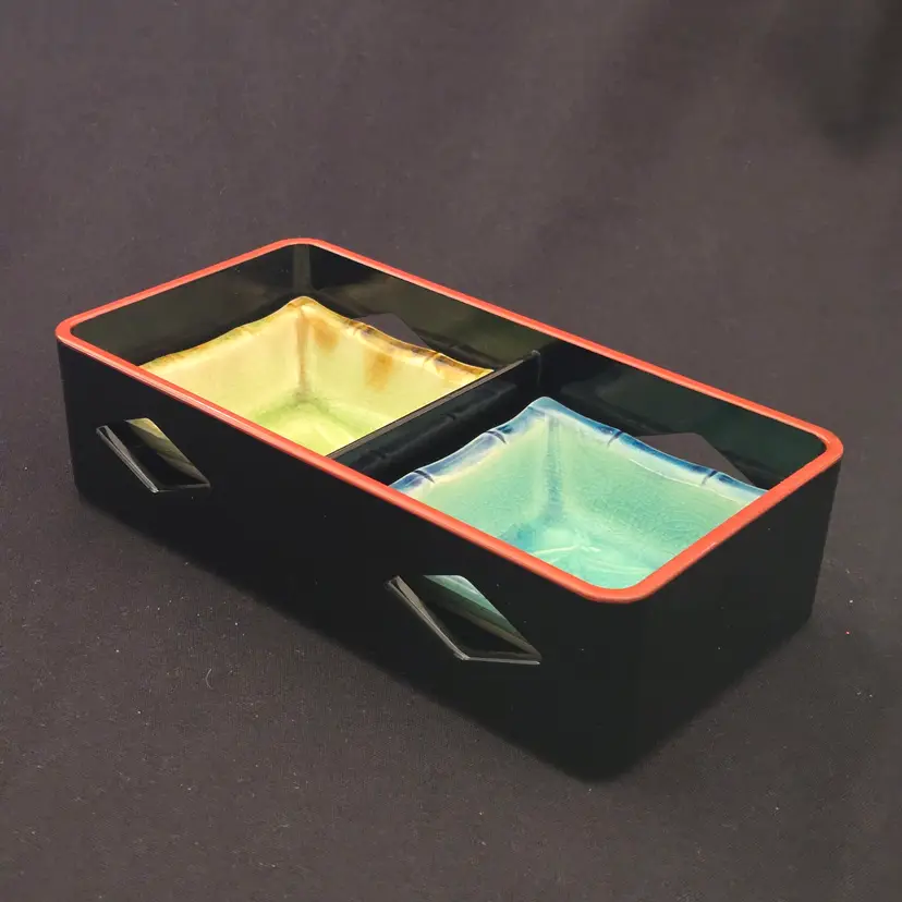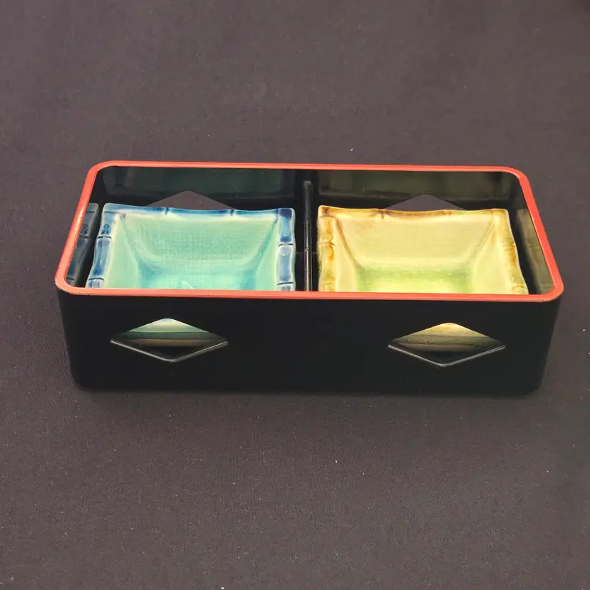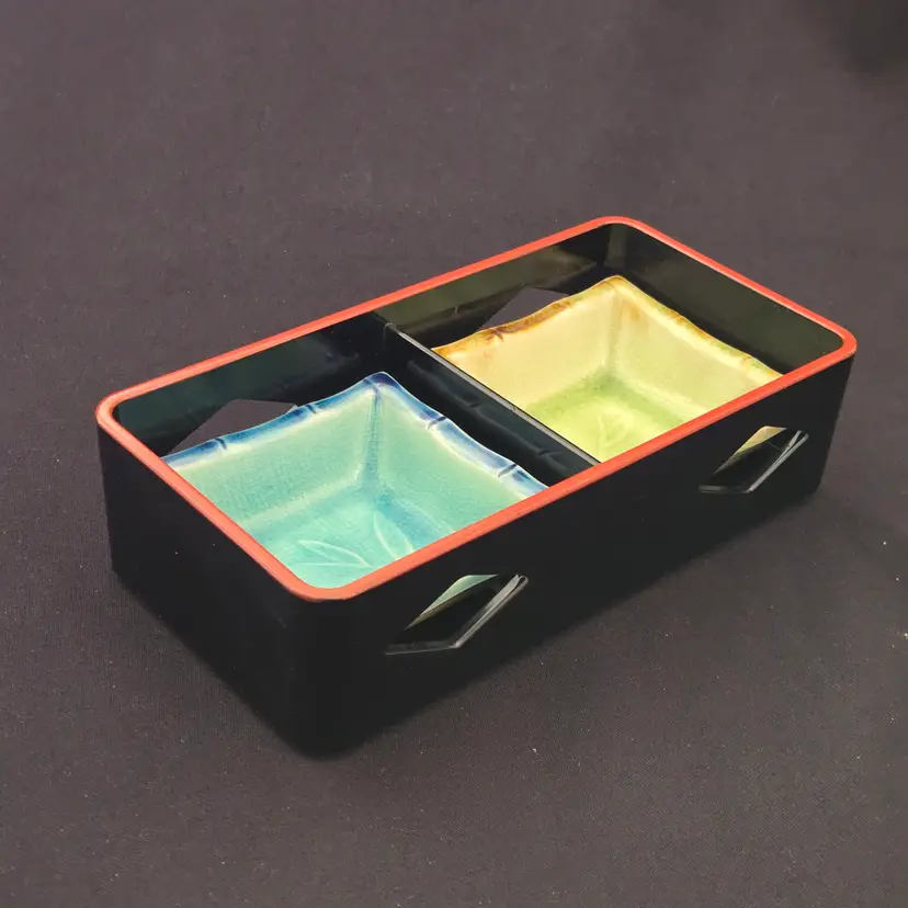 Lacquer Bento Box ANA Japan + Ceramic Leaf Sushi Dipping Dishes (set of 2) Decor with Condition Issues. Used condition with the lacquer tray having scratches, edgewear, dirt, scuffs, rubbing (from ceramic dishes), missing color, tape residue and the ceramic dishes having crazing. Please view all the photos and please ask any questions prior to purchase when possible.