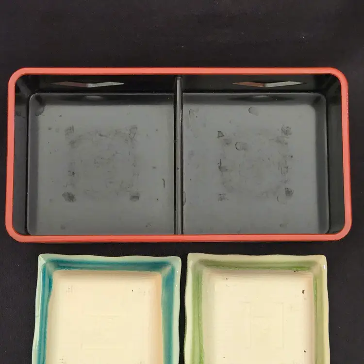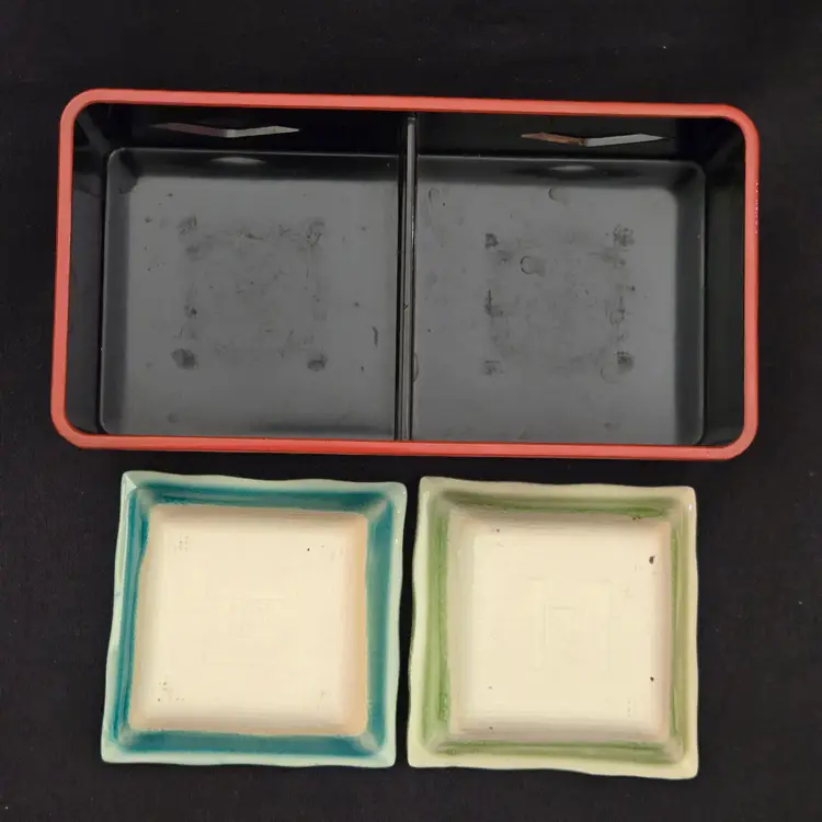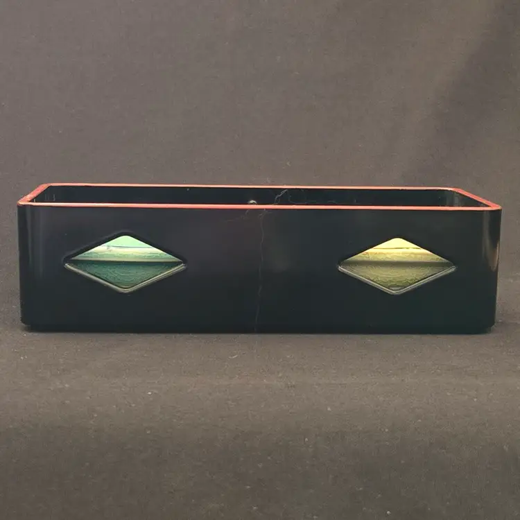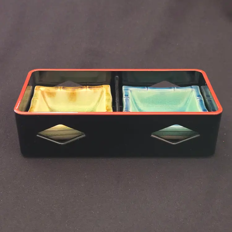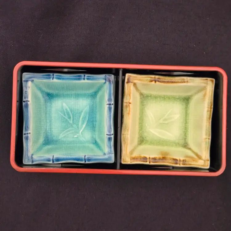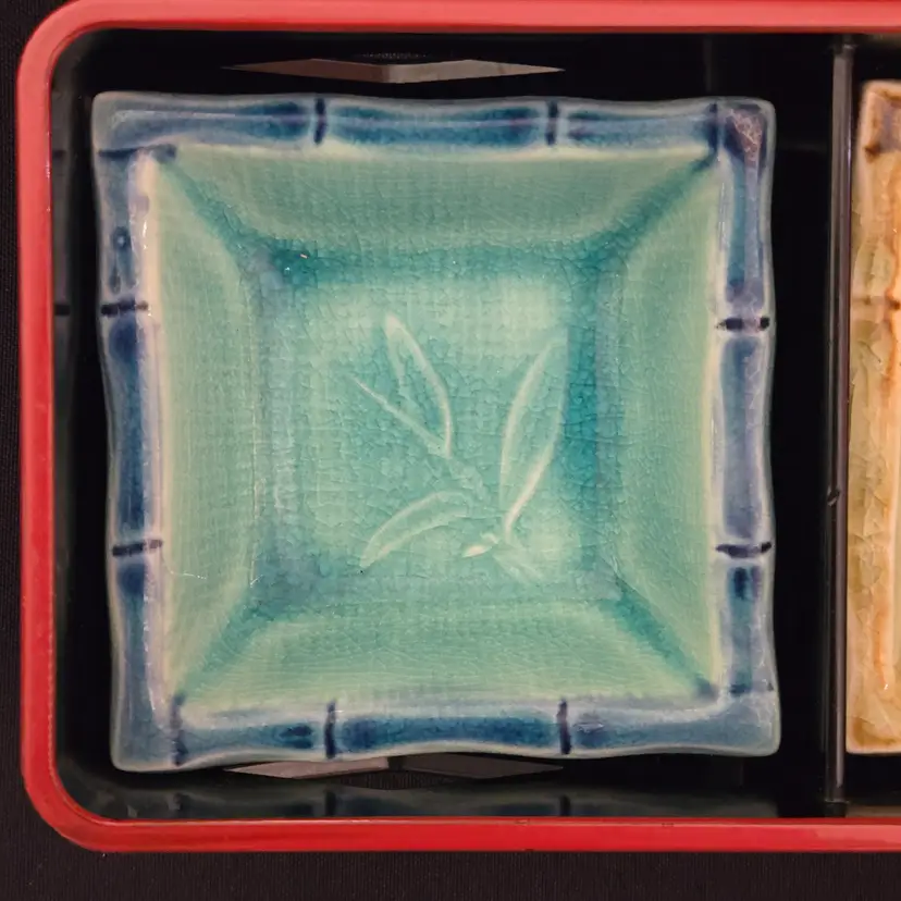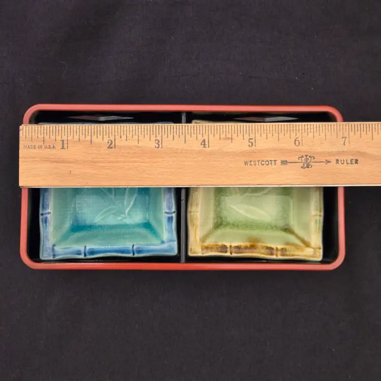 Lacquer Bento Box ANA Japan + Ceramic Leaf Sushi Dipping Dishes (set of 2) Decor with Condition Issues. Used condition with the lacquer tray having scratches, edgewear, dirt, scuffs, rubbing (from ceramic dishes), missing color, tape residue and the ceramic dishes having crazing. Please view all the photos and please ask any questions prior to purchase when possible.