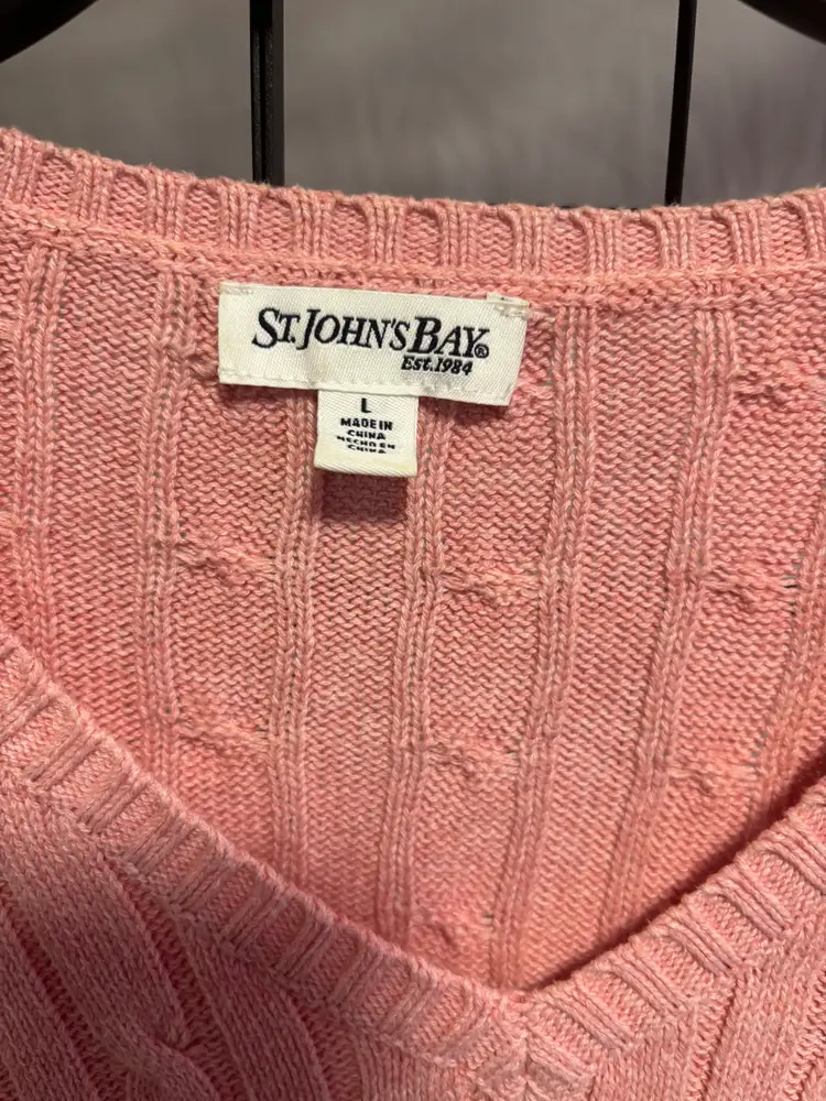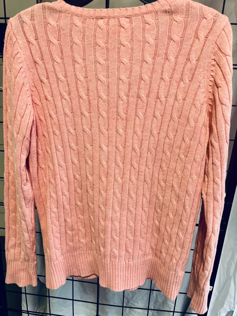 Beautiful soft pink cable knit sweater. Size Lg. (worn twice). Measures 21" pit to pit & 24" length.
