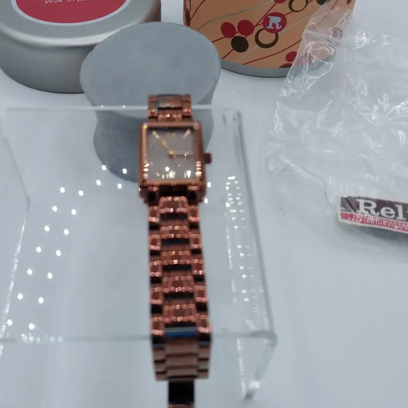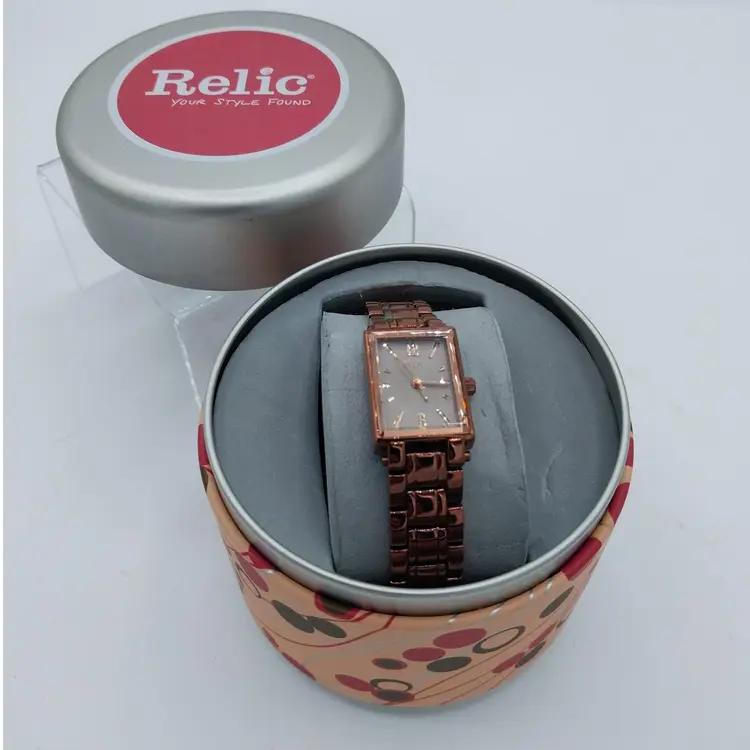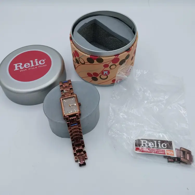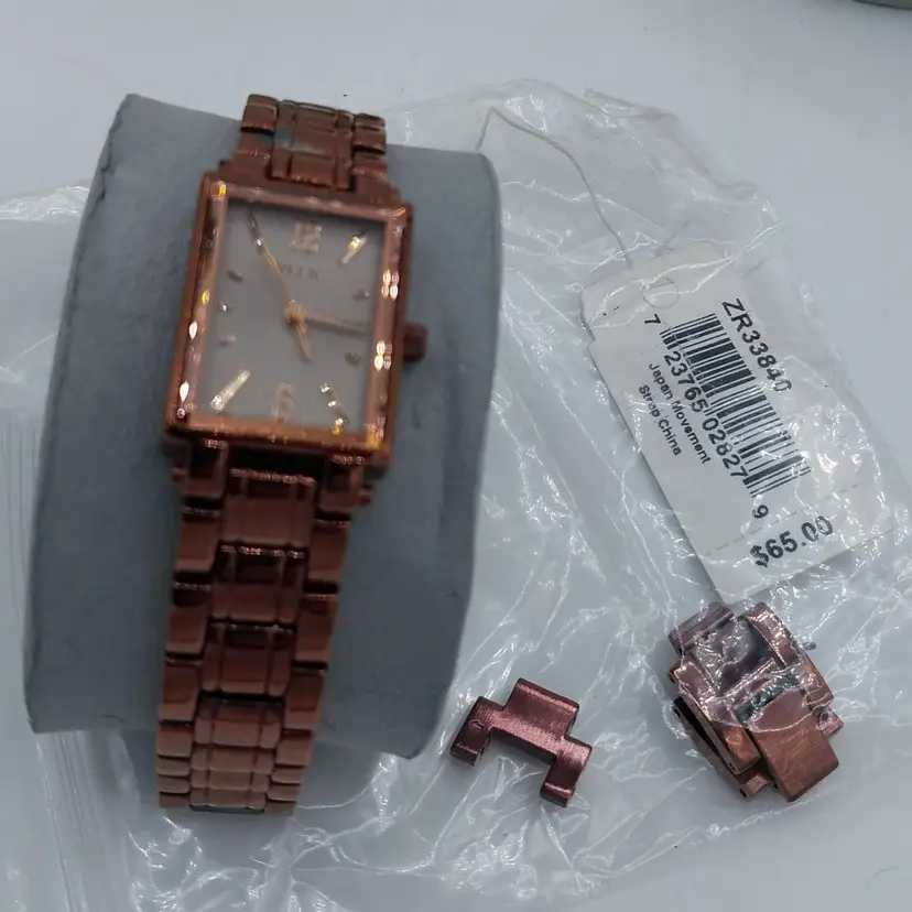 New battery put it. Works great! In Orig Tin! Orig. packing and papers/tags! Some of the links have area of the copper color that peeled off, from being stored away for years. It has an extra link that can be used as a replacement, OR you can just get a whole new band to put the watch on, if you wish.