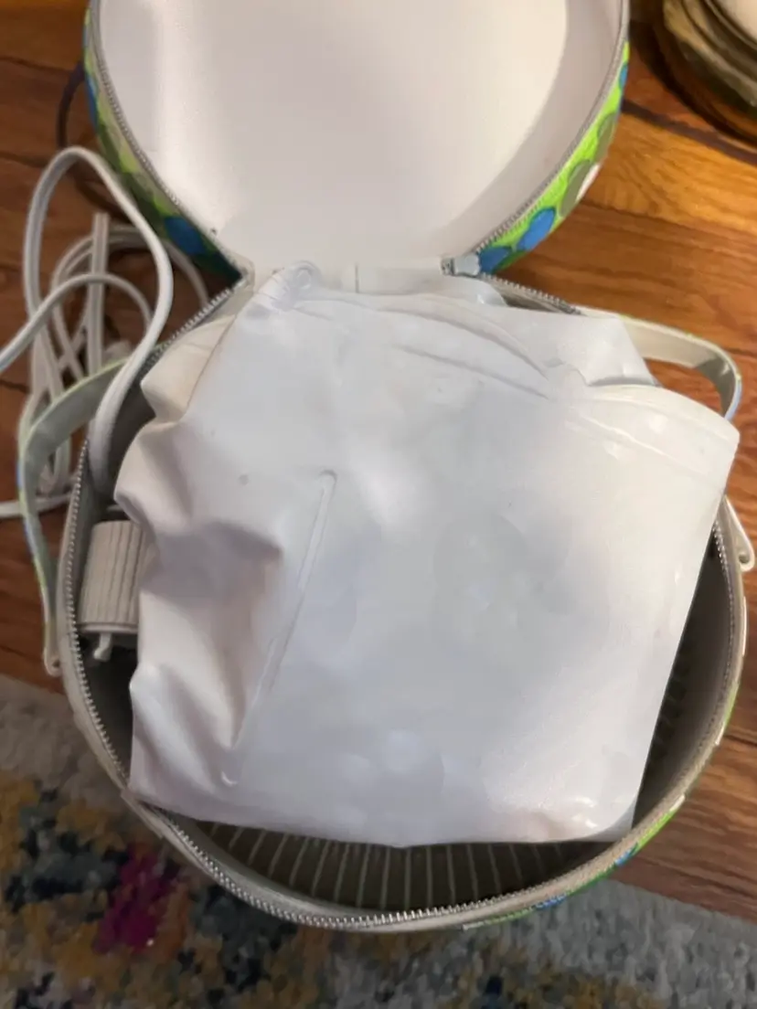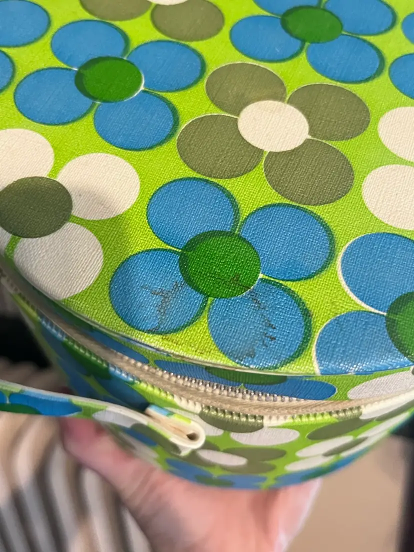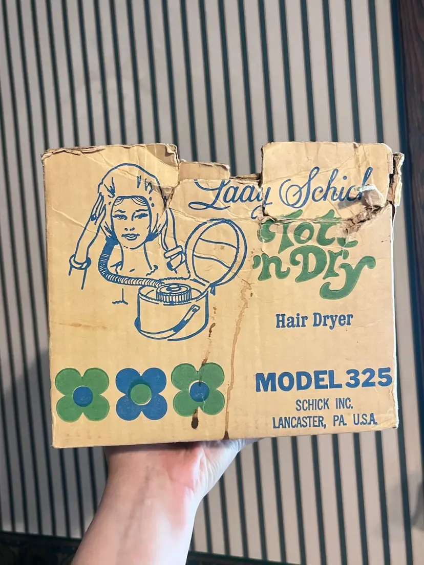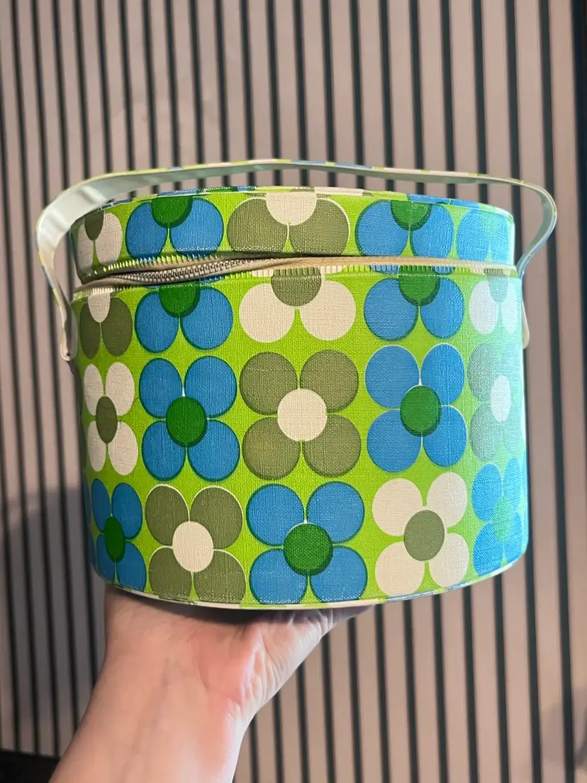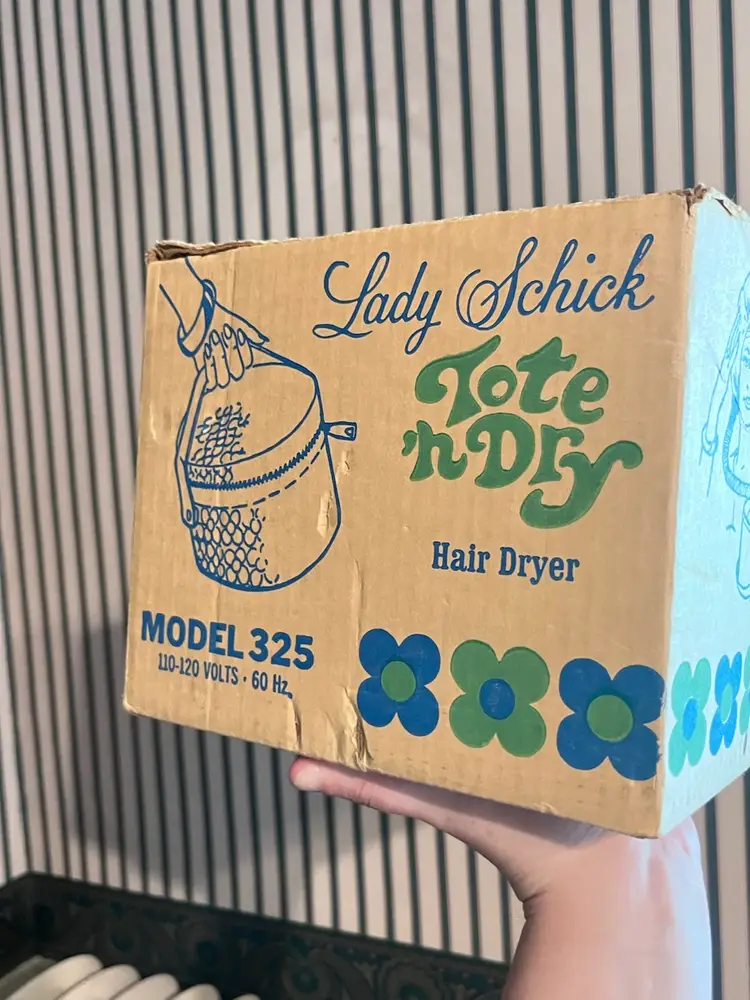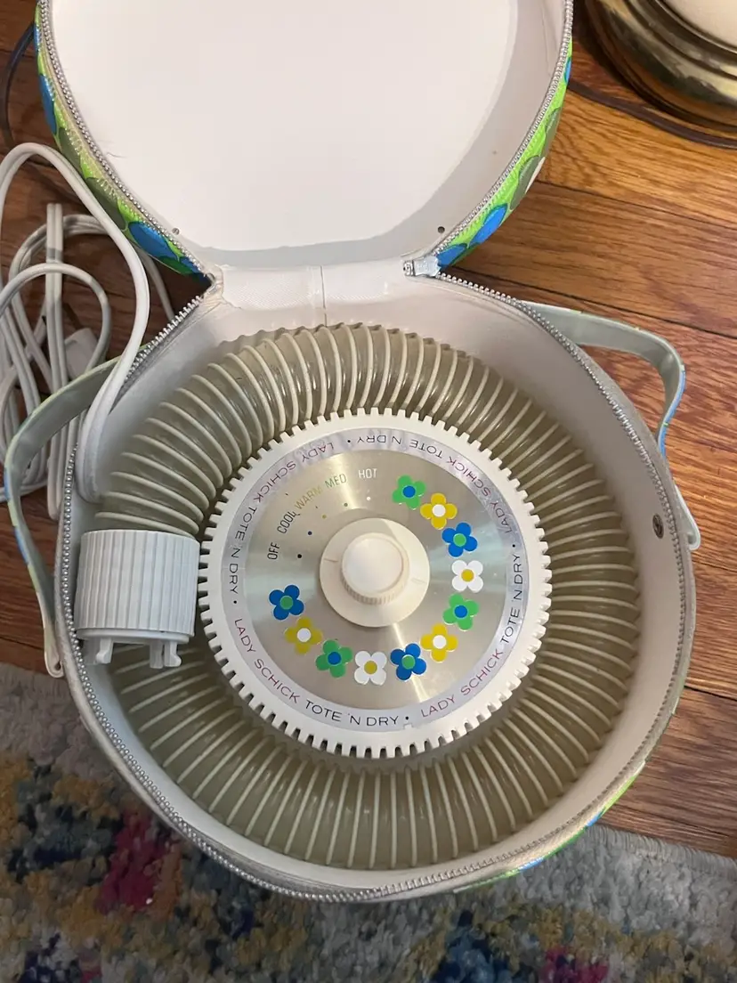 Lady Schick "Tote 'n Dry" hair dryer, model 325 Vibrant blue and green mod floral pattern case Tested and working 8”x6.5”