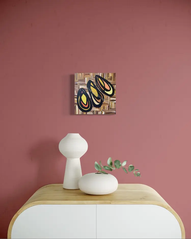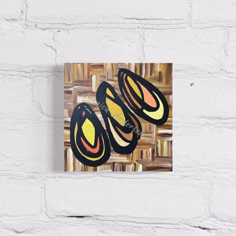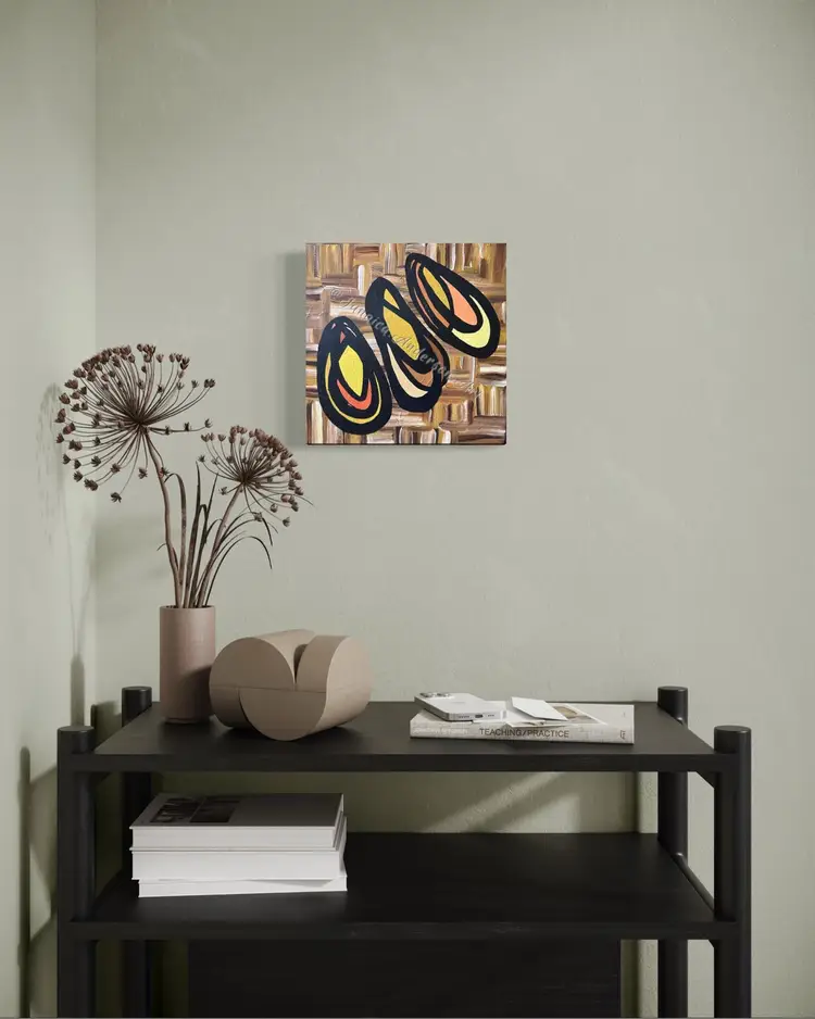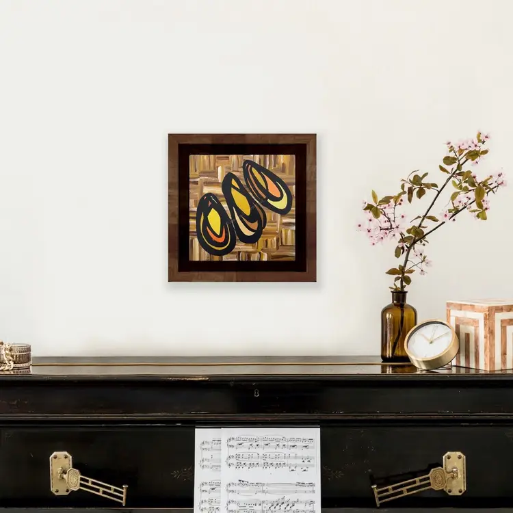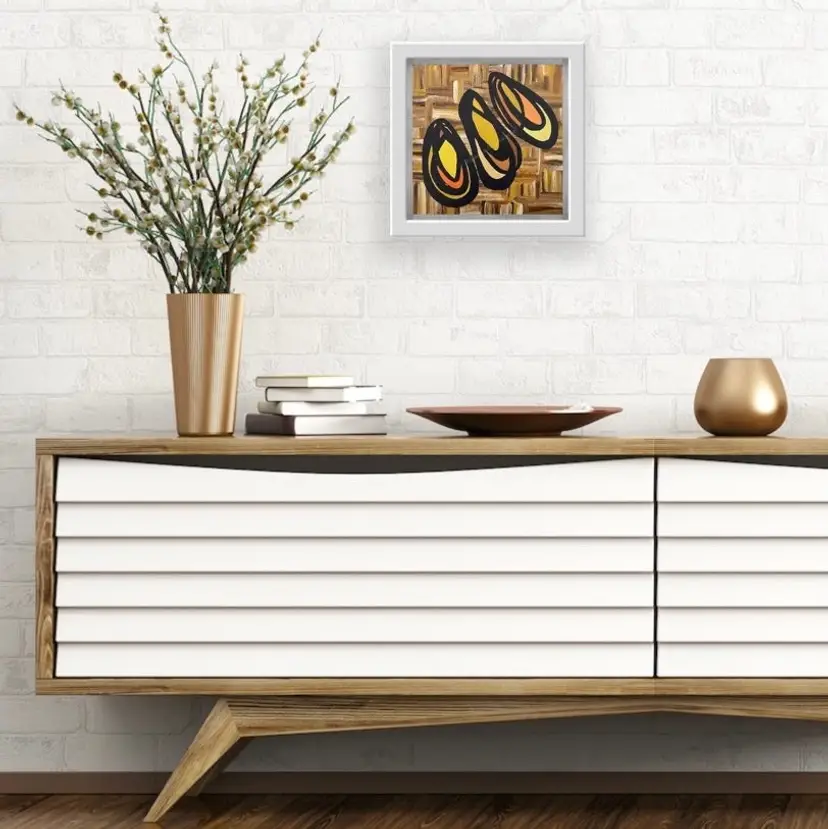 • 10 x 10 x 1 1/2” Gallery Wrapped Canvas, protected with two layers of archival varnish. • Acrylic and mixed media. The sides of the canvas are black. • Flush-mount hanging hook included. • Frames shown are for reference only; not included. • All original paintings come with a signed Certificate of Authenticity.