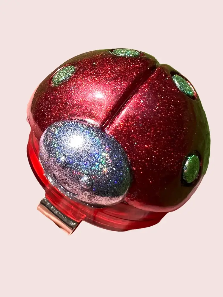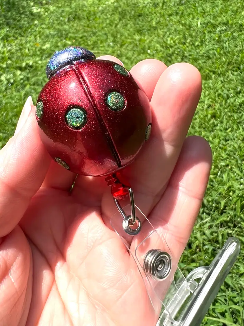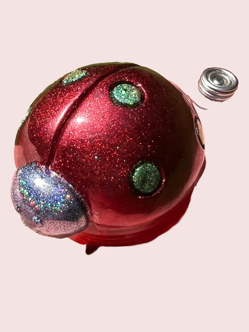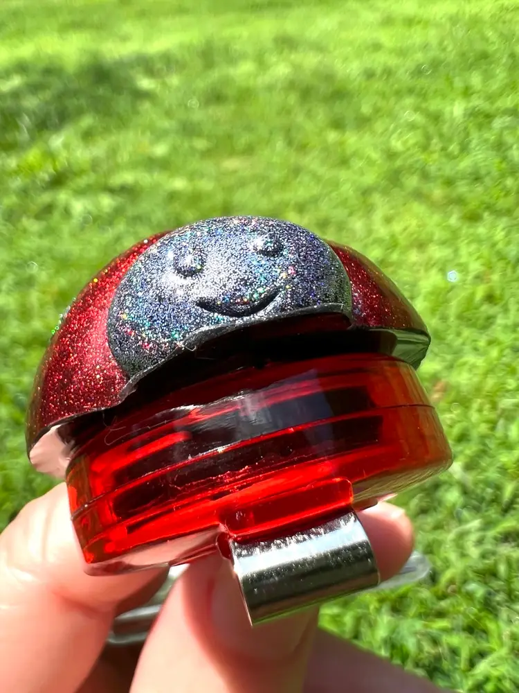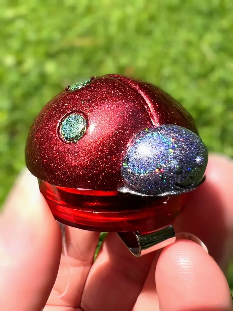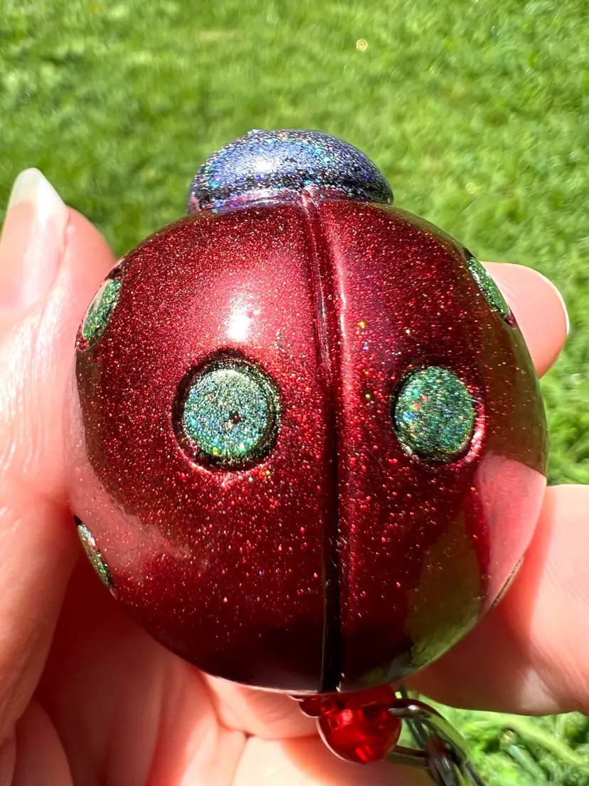 Handmade by me using UV-resistant resin, red chrome pigment, and holographic glitter.