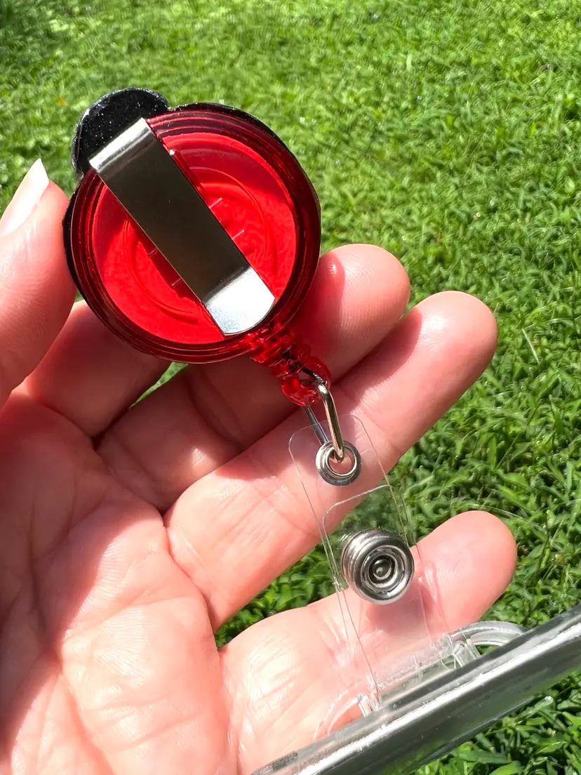 __Red plastic badge reel with metal belt-style clip and plastic snap closure (the attached plastic badge holder in photos & video is not included) __Retractable 24" extension __Ladybug size: 1-1/2" long x 1-1/4" across x 5/8” depth (1-1/4" depth with reel added)