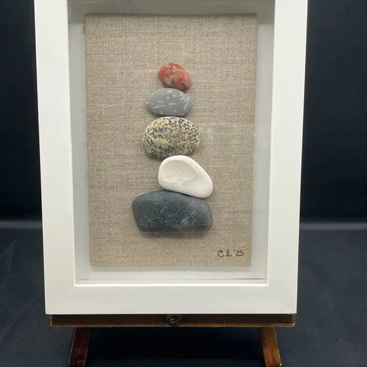 Lake Michigan stones sourced by me from the Indiana Dunes lakeshore. Stacked to represent a Cairn. Mounted on linen board and framed. 5”x7”