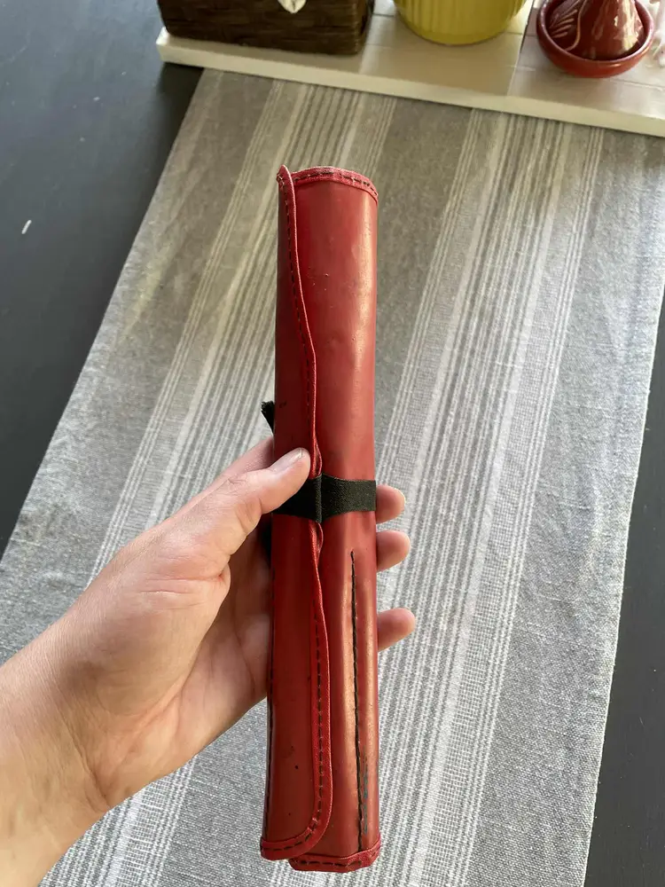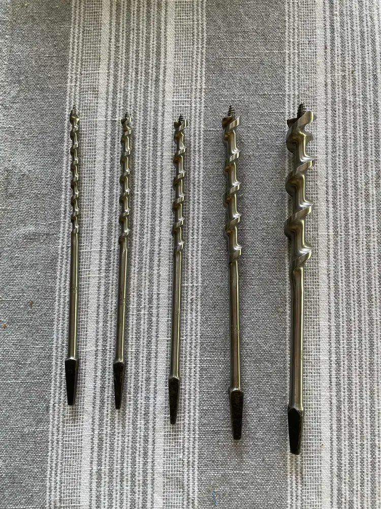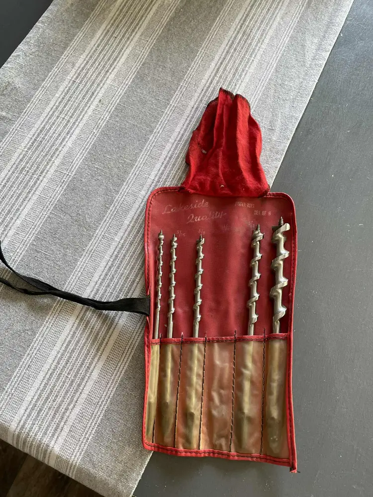 Set of user woodworking vintage auger bits with roll Set of 5, missing 1 of the original set 1/4”, 5/16”, 3/8”, 1/2”, 3/4” Missing the 7/16”