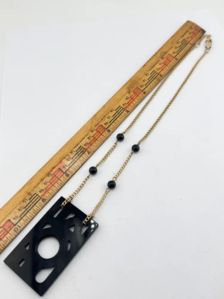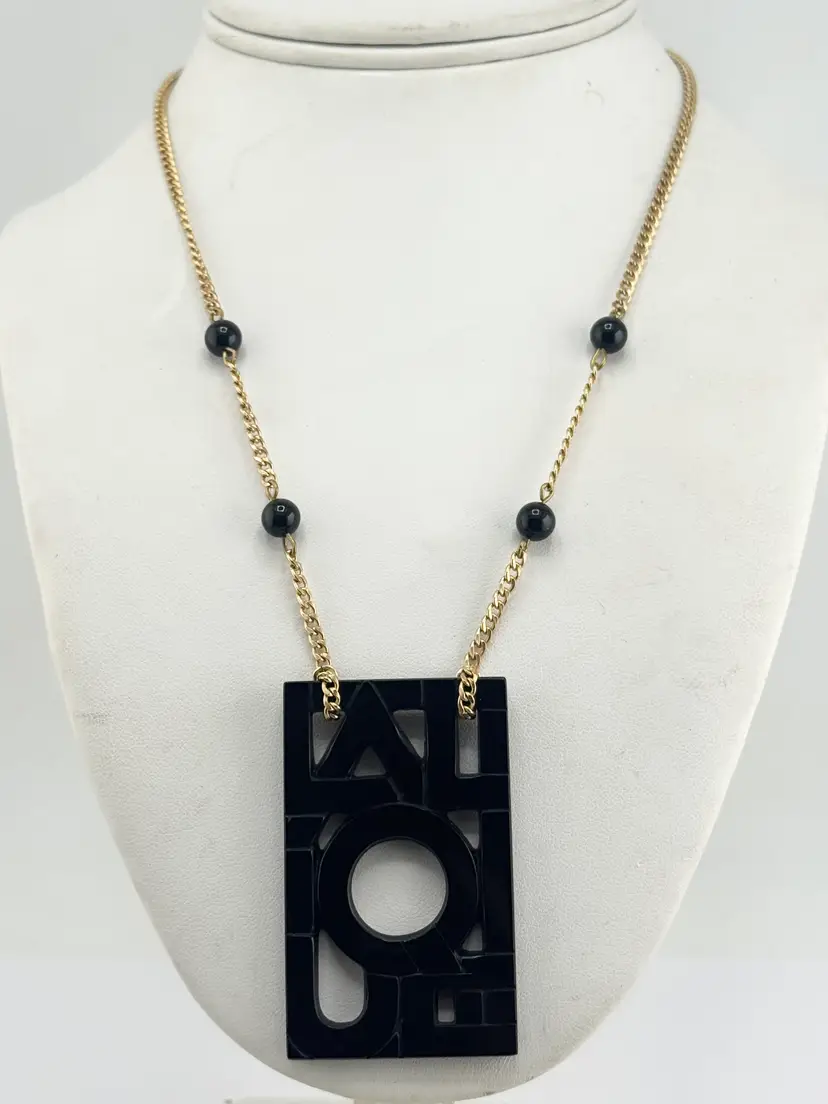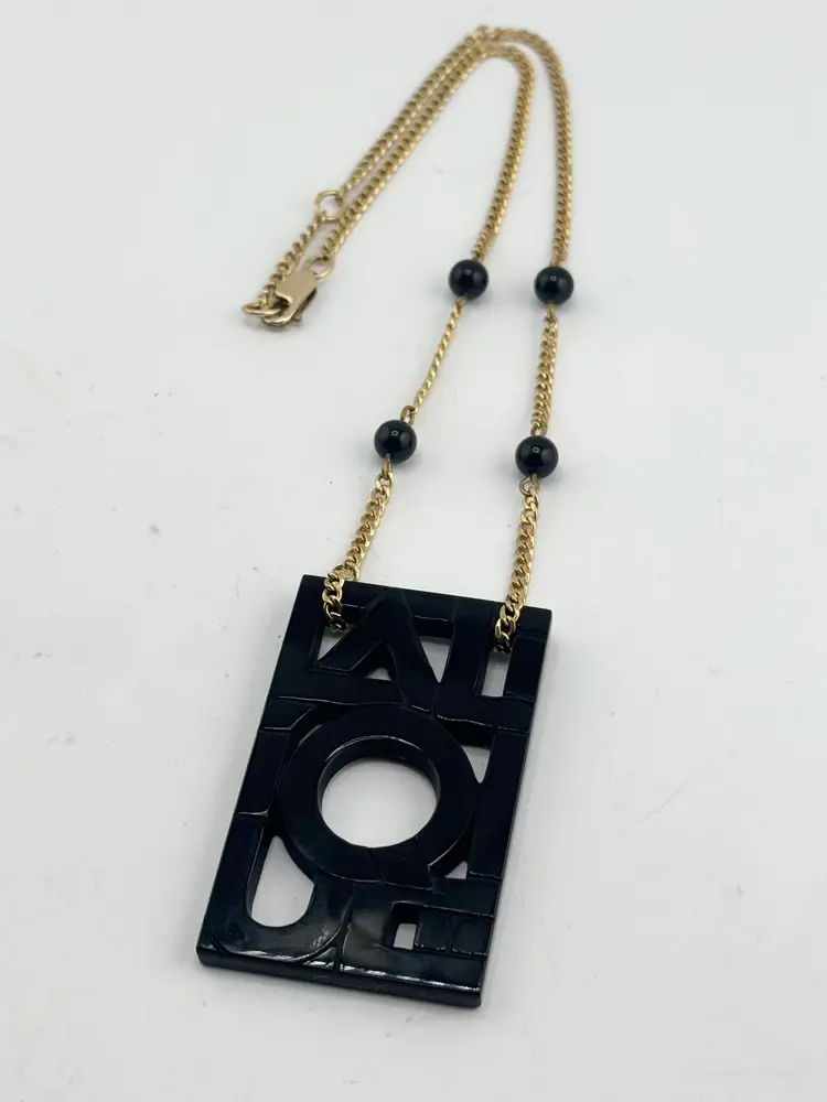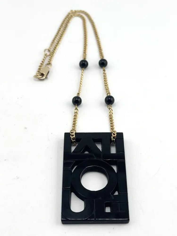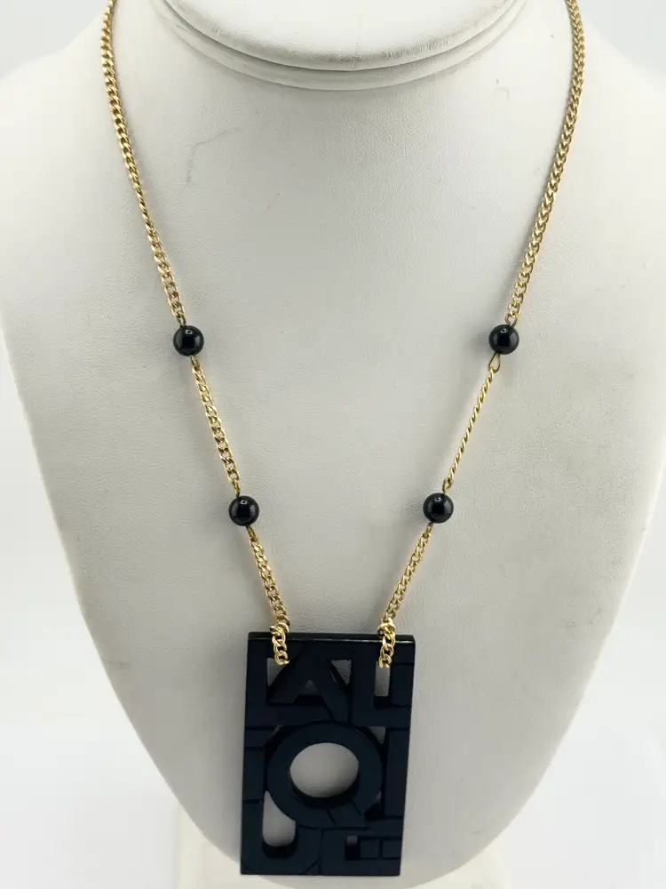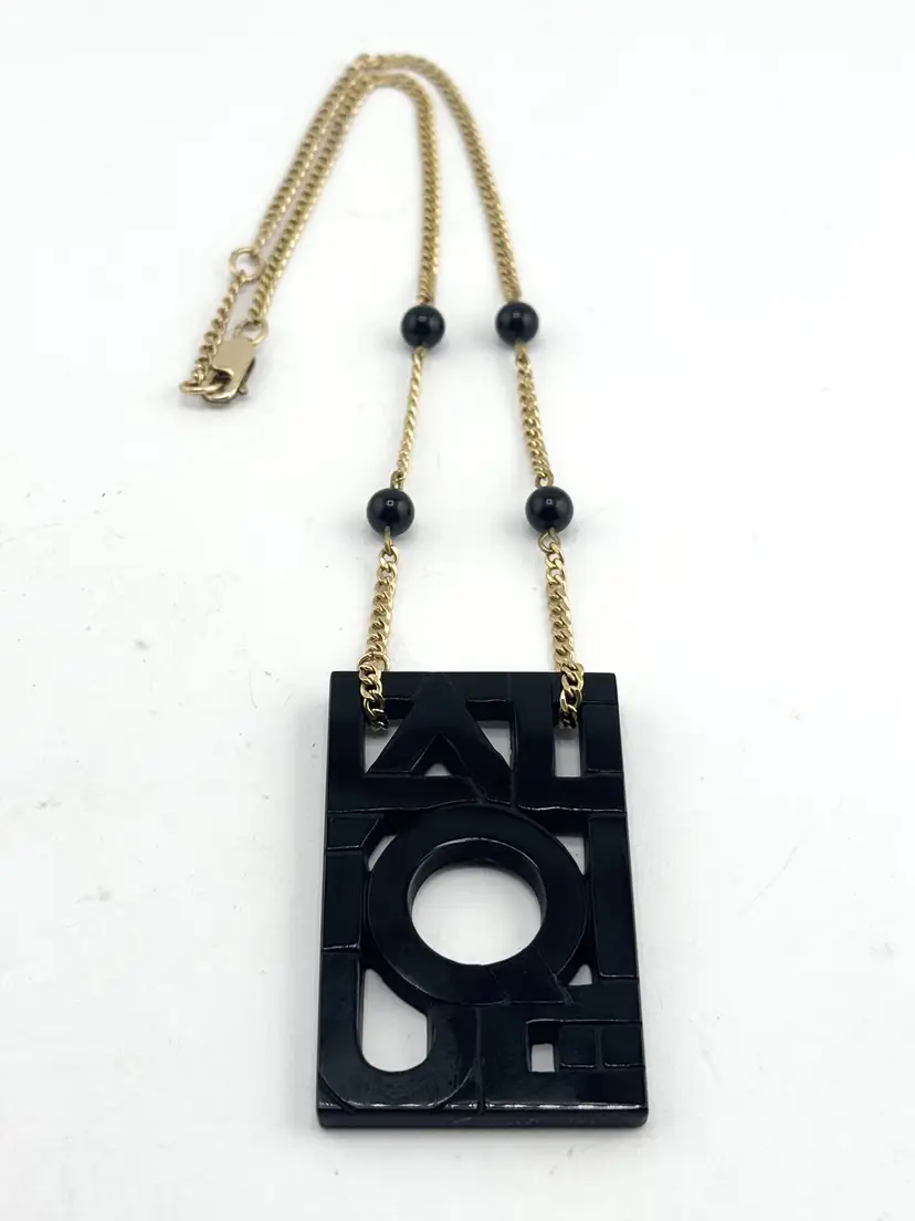 LALIQUE Crystal Black Art Deco Logo Letter Pendant Necklace. Black design with black beads, gold tone chain. Well made vintage pendant necklace. Lalique crystal black necklace. MN52GH.