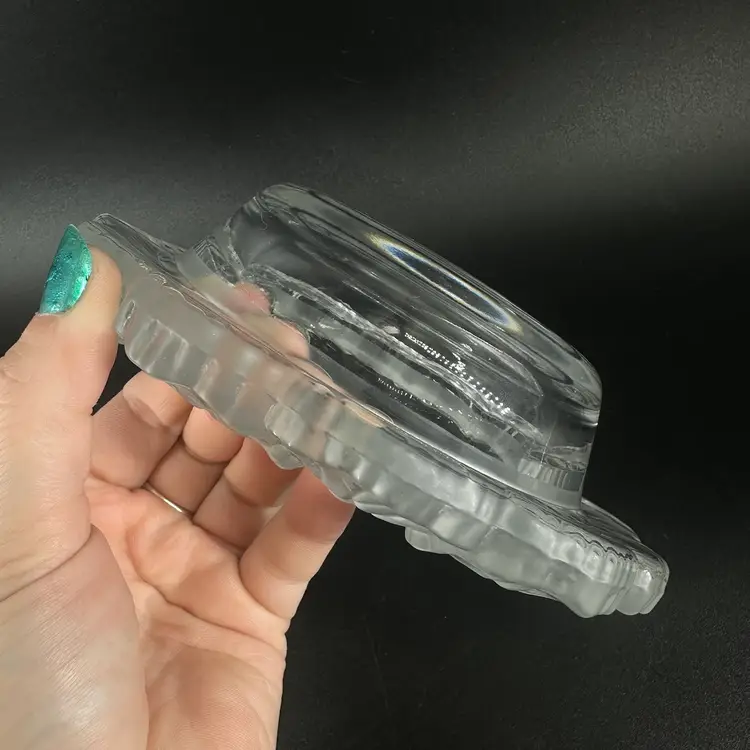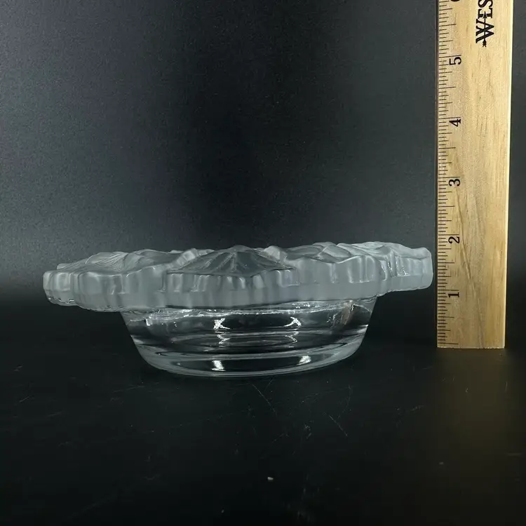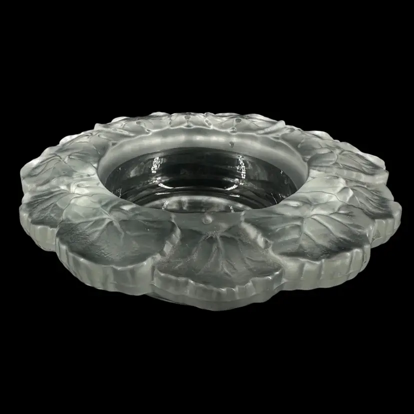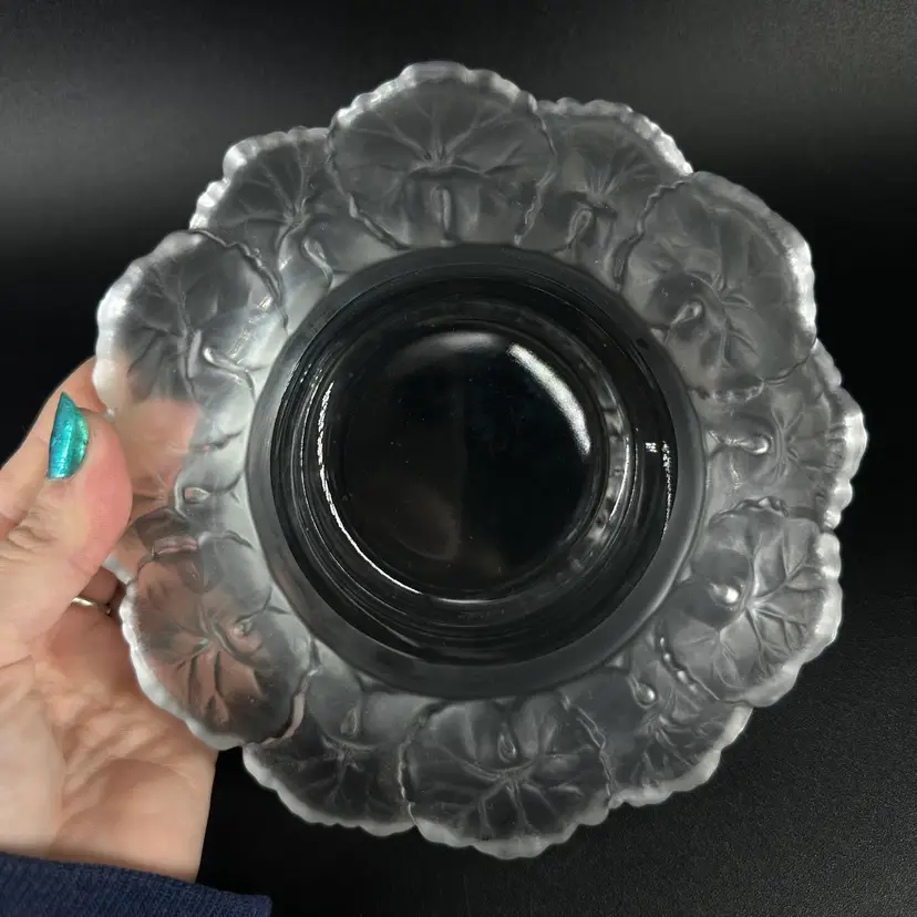 wine bottle holder featuring a frosted Geranium design. No chips or cracks, but slight scratches on the bottom. No markings or signatures. Wine bottle holder measures approximately 7” by 7”.