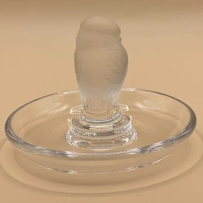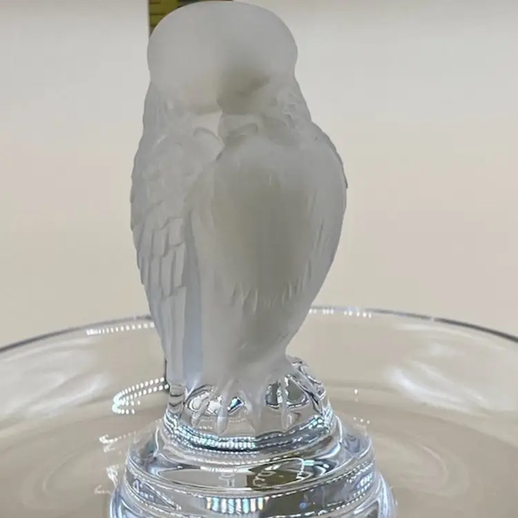 This piece has a frosted bird, likely a hawk or owl, centered in a clear crystal dish. It is another example of the craftsmanship behind the Lalique name. It is signed on the bottom, and in fantastic condition. See photos for details.