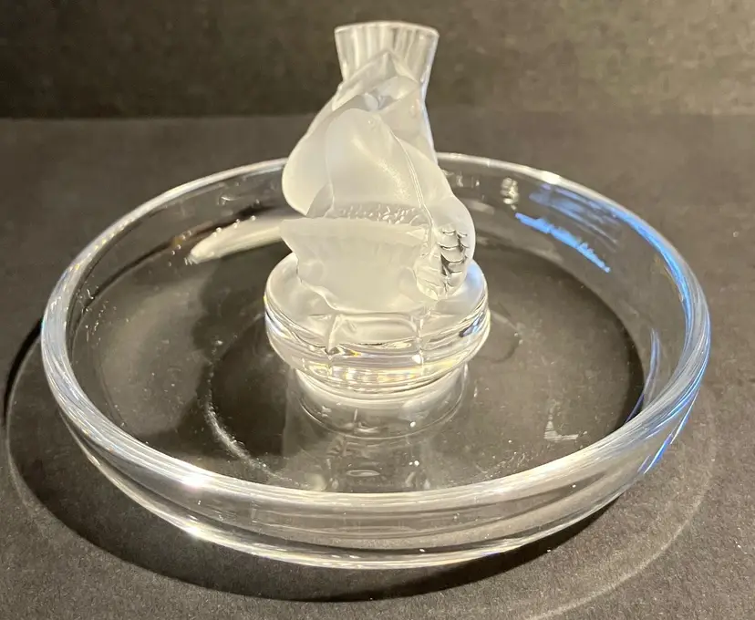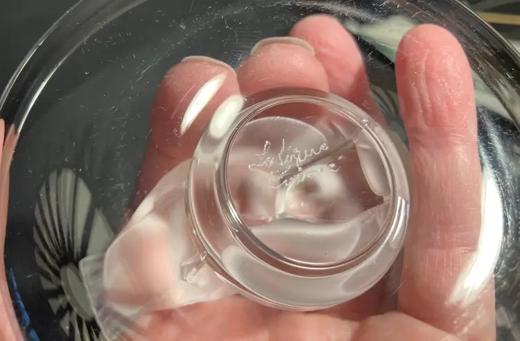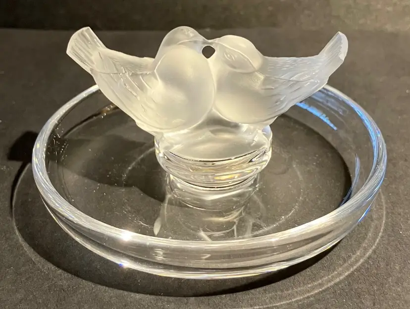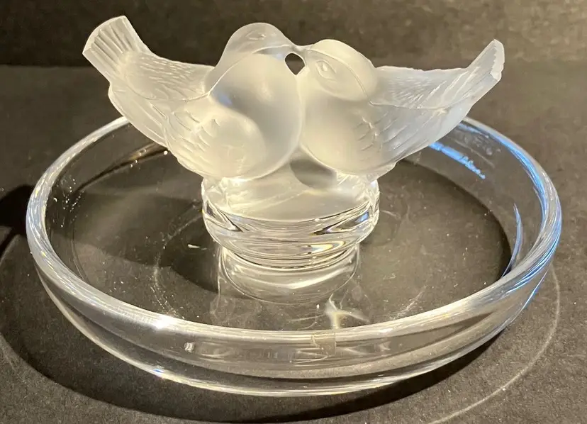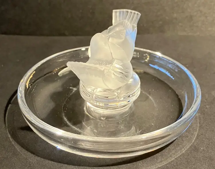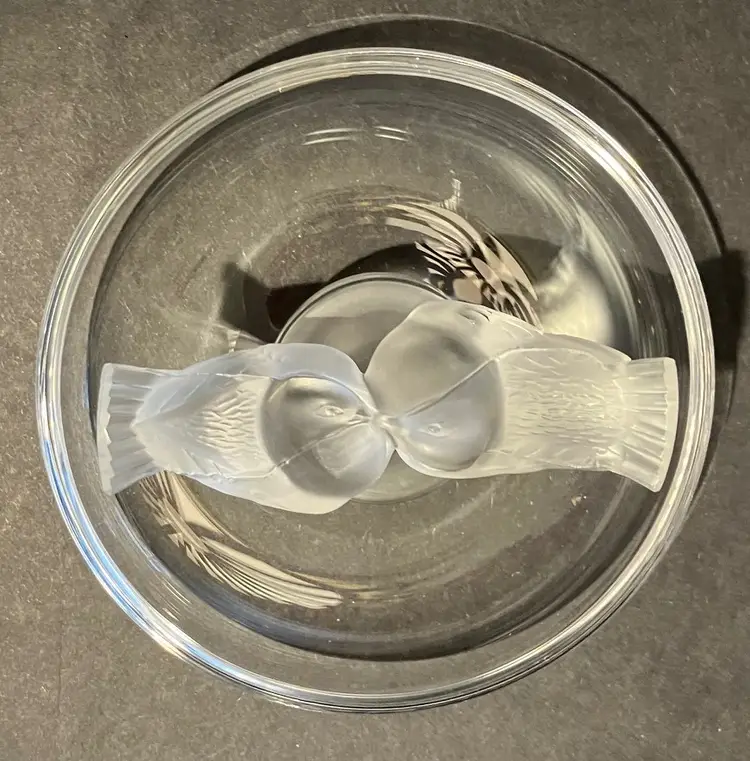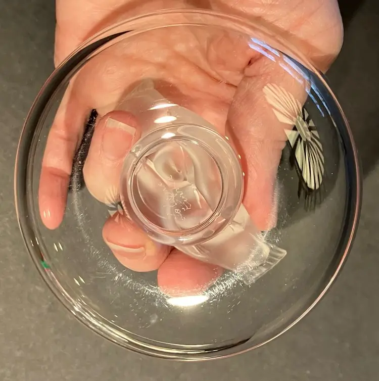 No chips or cracks. Wear on the bottom where it sits on the table. 4” diameter and about 2 1/2" in height..