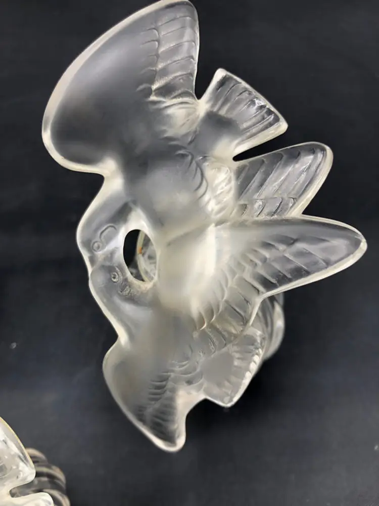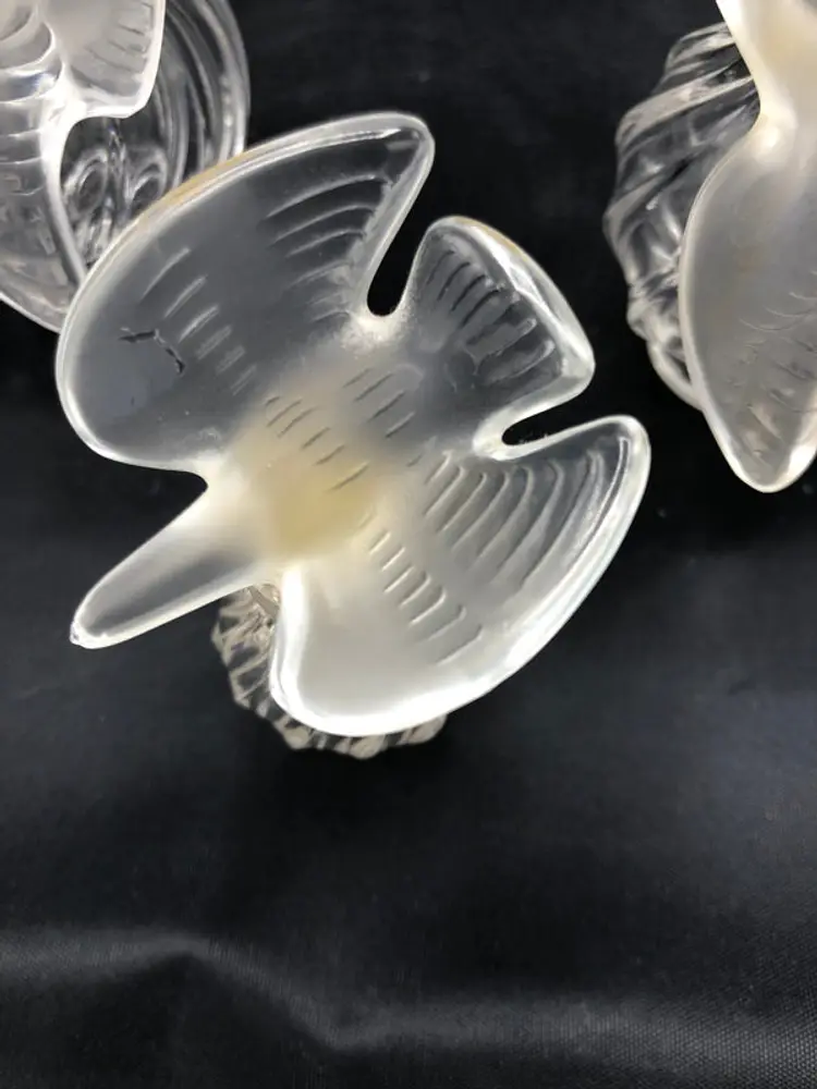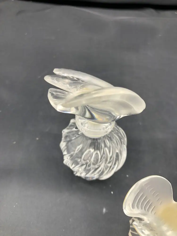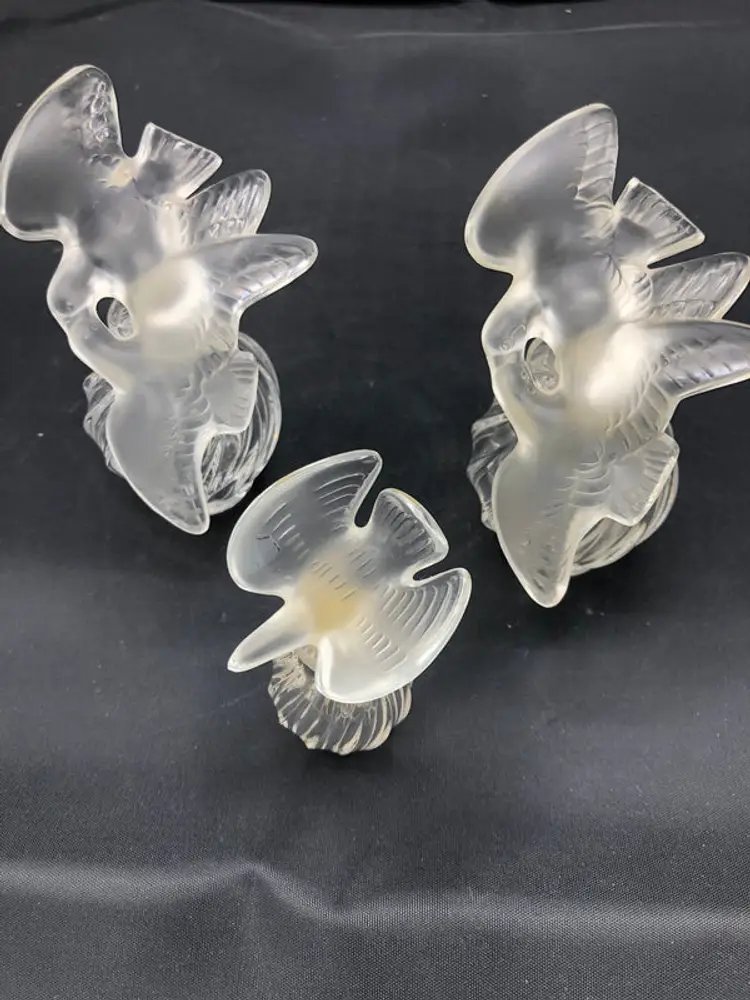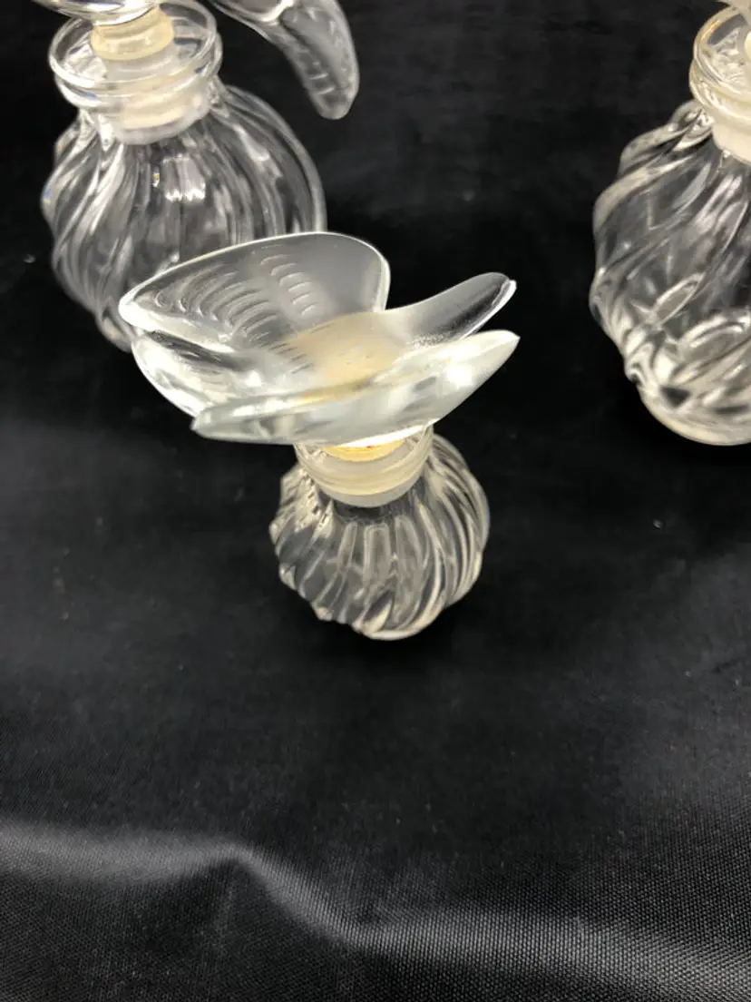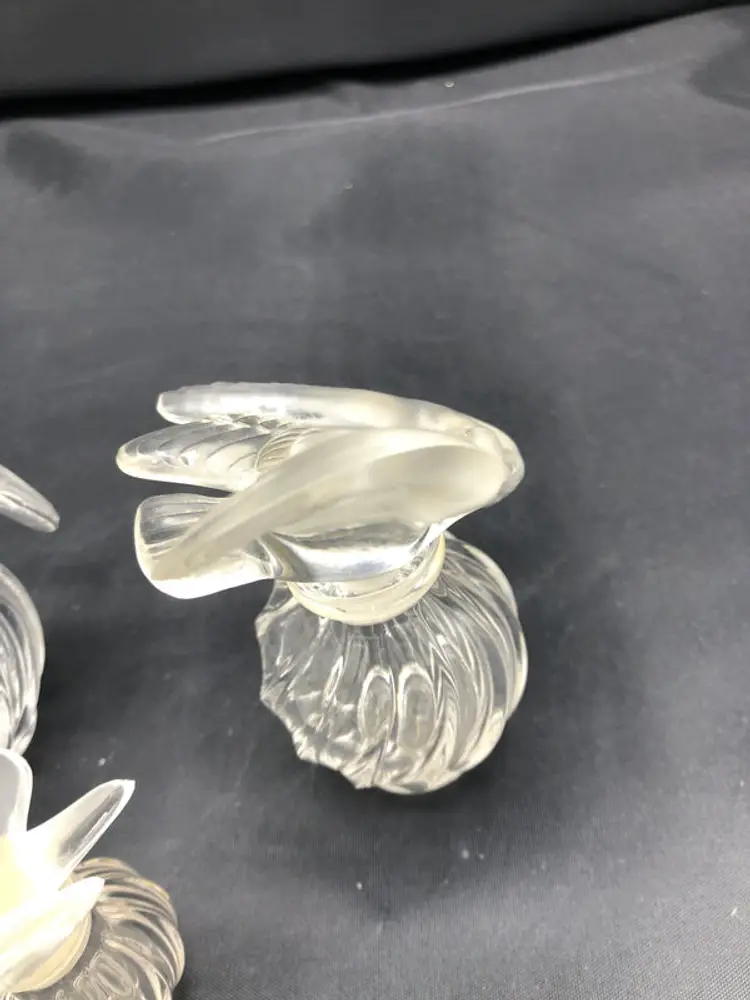 This exquisite trio of Lalique bird-form perfume bottles showcases the French glassmaker's signature artistry and craftsmanship. Each piece features a distinct avian design rendered in fine crystal, with dimensions ranging from the commanding 4" x 2.5" statement piece to the delicate 1.5" x 2" x 0.5" accent bottle. The collection remains in excellent condition, preserving the pristine clarity and refined detailing characteristic of Lalique's luxury glasswork. An ideal acquisition for collectors of decorative arts or those seeking sophisticated vintage fragrance vessels with enduring aesthetic appeal.