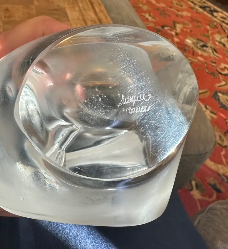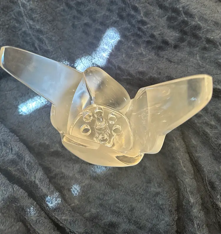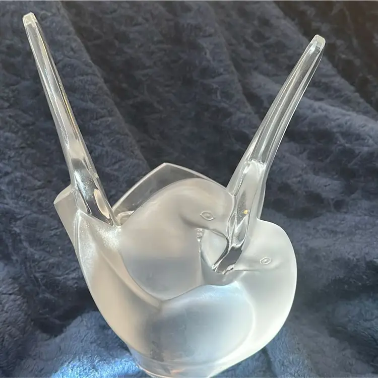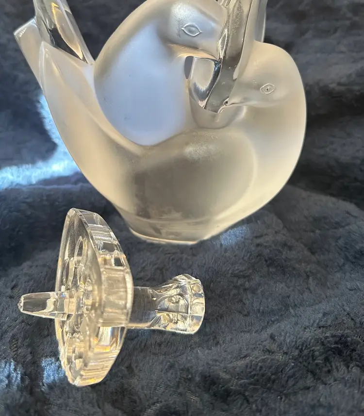 This gorgeous Lalique crystal item is a figural flower vase with a removable crystal flower frog. The birds section Measures 8 3/4” x 7 3/4’” And the flower arranger measures 3”x 2 1/4”,& fits perfectly into the opening on top so you can create the perfect arrangement! No chips, cracks or repairs!