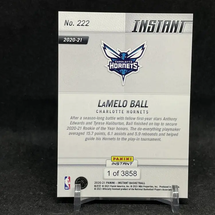 1st time buyer? Get $5 Off with code DISTRICT5 at checkout! Card as shown. All cards $20 and under ship PWE via lettertrackpro [https://www.letter-track.com/registerap.asp?AFID=8757] Card Size: Standard Autographed: No Set: 2020-21 Panini Instant Custom Bundle: No Product: Single - Insert Player/Athlete: Lamelo Ball Year Manufactured: 2021 Vintage: No Card Thickness: 20 Pt. Sport: Basketball Language: English Card Name: Panini Instant Original/Reprint: Original Manufacturer: Panini Features: ROY, Base Set, Rookie Team: Charlotte Hornets Season: 2020-21 Player: Lamelo Ball League: NBA Material: Card Stock Original/Licensed Reprint: Original Card Attributes: Rookie Card Modified Item: No Series: Instant Type: Sports Trading Card Year: 2021 Era: Modern (1970-Now) Theme: Sport Card Number: #222 Country/Region of Manufacture: United States Card Manufacturer: Panini