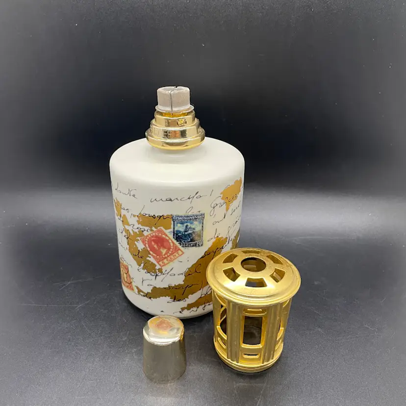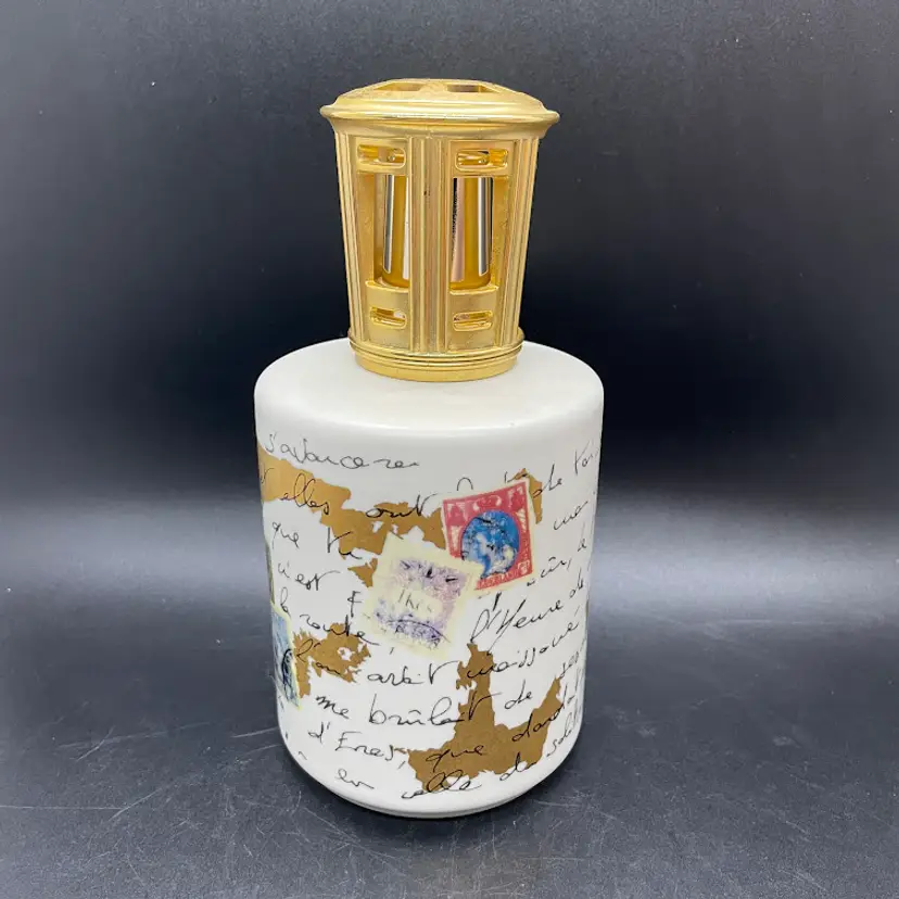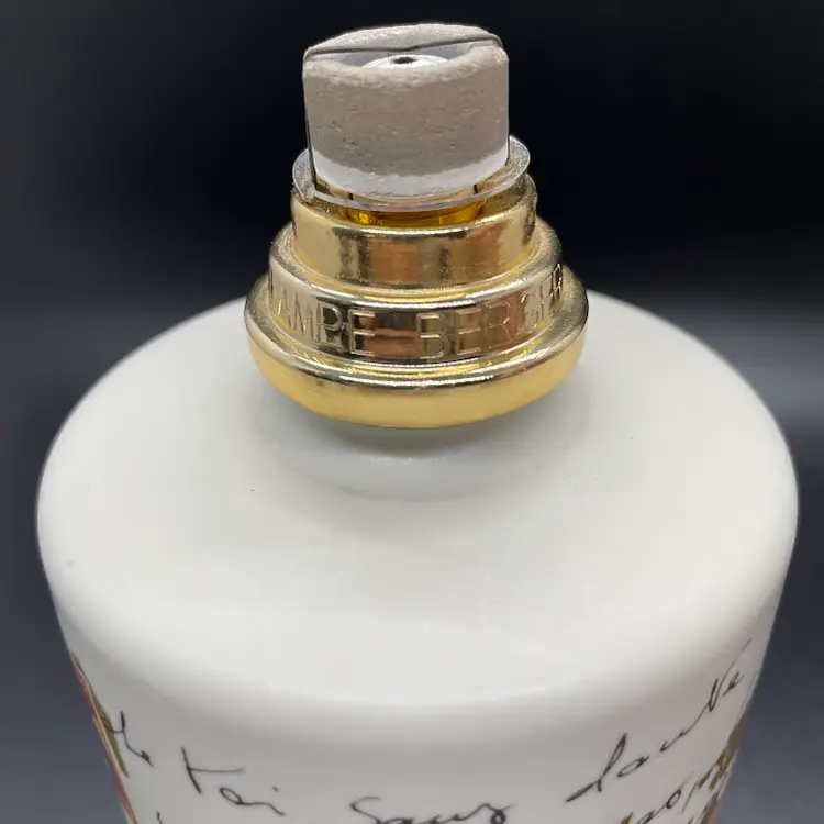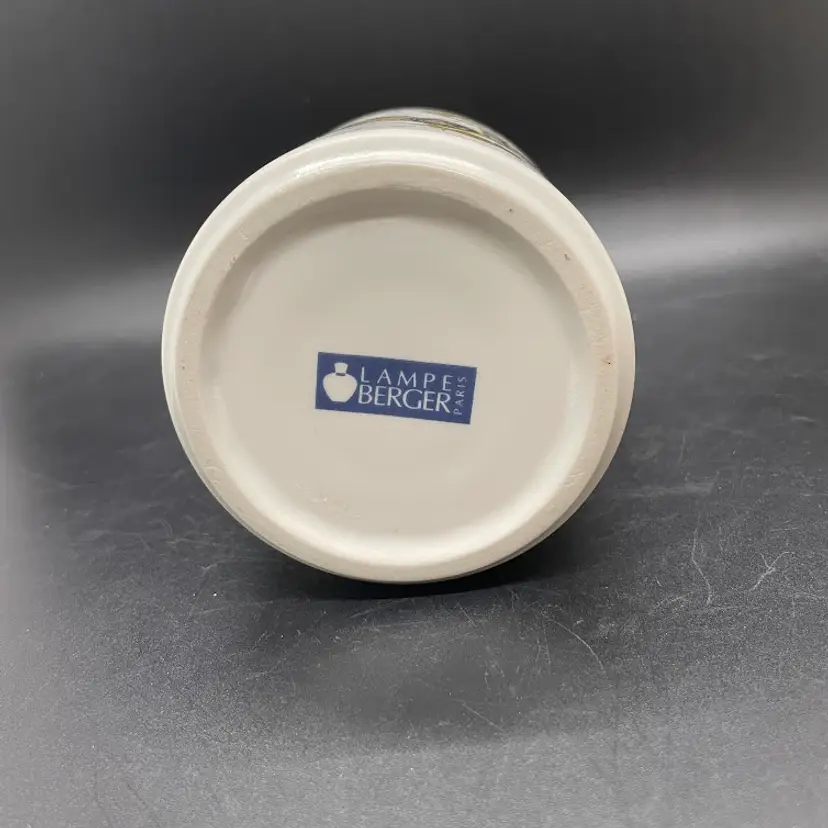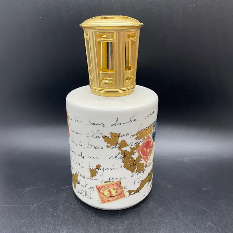 Lampe Berger Porcelain Fragrance Lamp oil Diffuser Postage Stamp Travel. Made in France.No chips or cracks. Signs of wear and use. Some crazing to the glaze. Some wear and tarnishing to the two caps. Please see pictures.