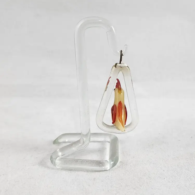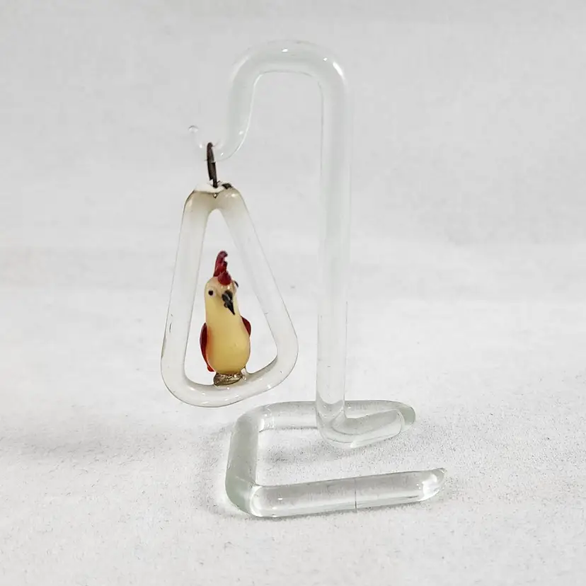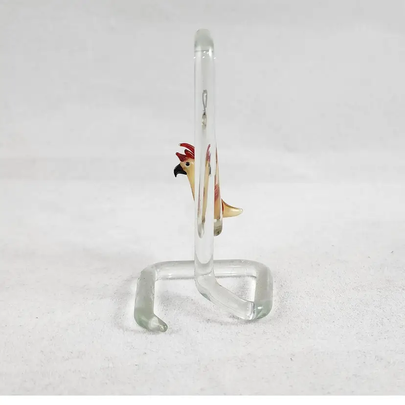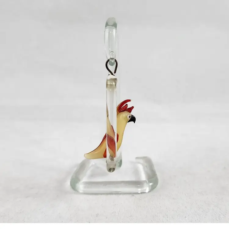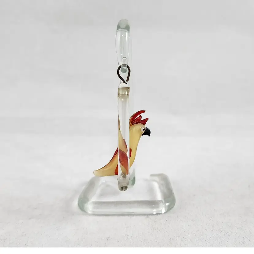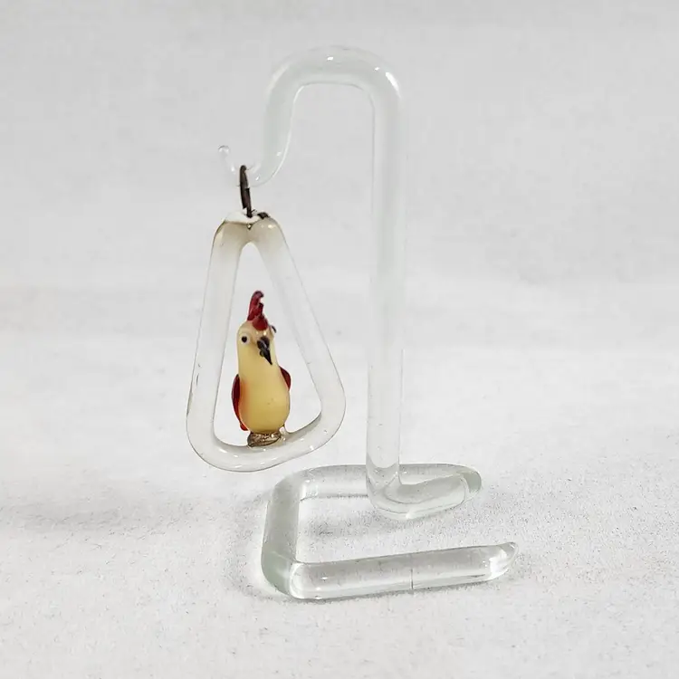 Very unique lampwork art glass bird figurine, which resembles a cockatoo or parrot swinging on a perch. Bird is made of a cream-colored glass with red-orange coloring. Perch is made of clear glass.